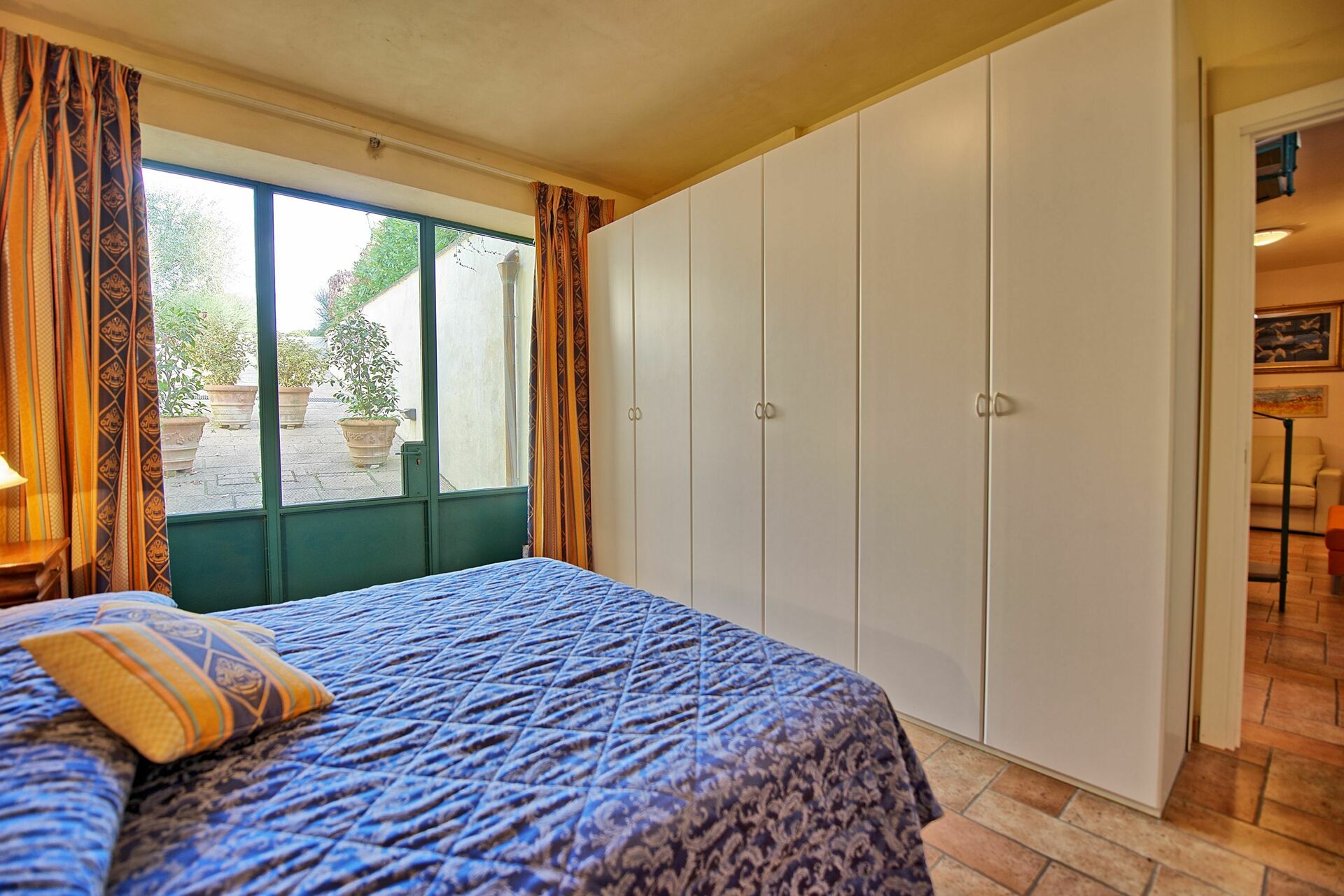 Stue med enkelt sovesofa (€50 pr. uge) og TV, badeværelse med bruser, dobbeltværelse med udgang til det fri