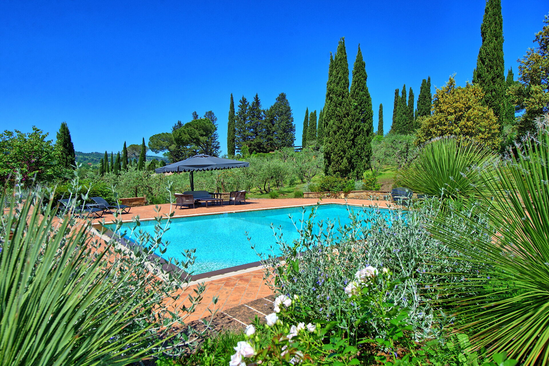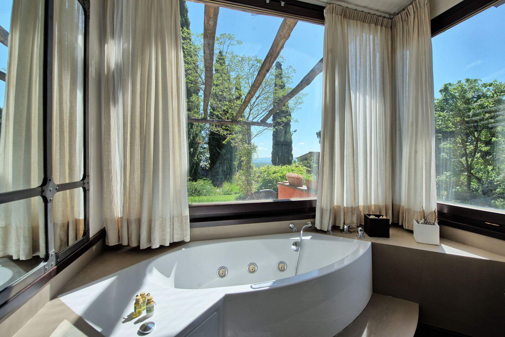 Du har adgang til dette udendørs område gennem store franske vinduer, så du kan nyde den friske luft og den smukke udsigt. Swimmingpoolen med pooldæk ligger på en stor græsplæne med udsigt over Toscanas bakker og middelaldertårnene i den historiske by San Gimignano.