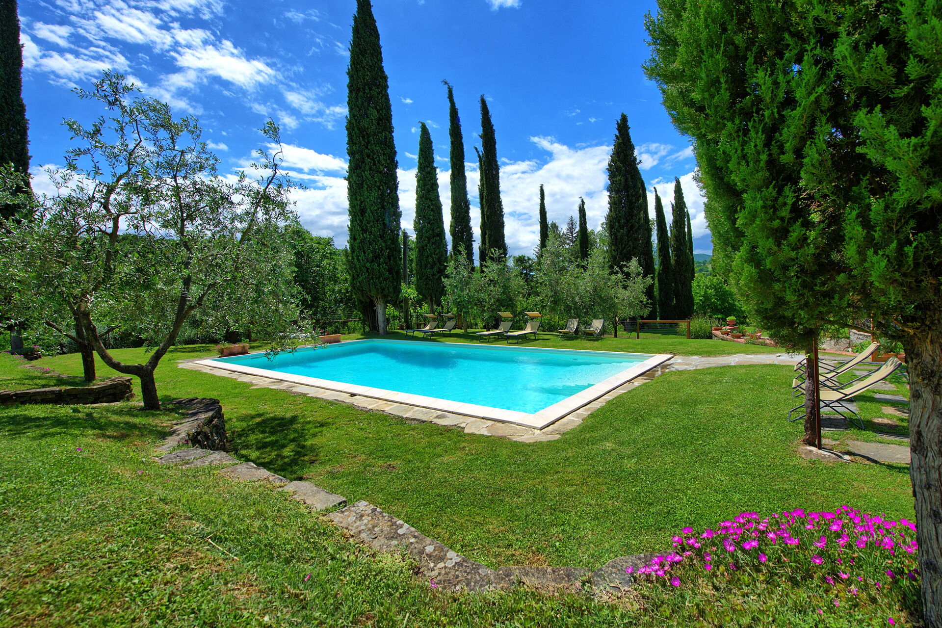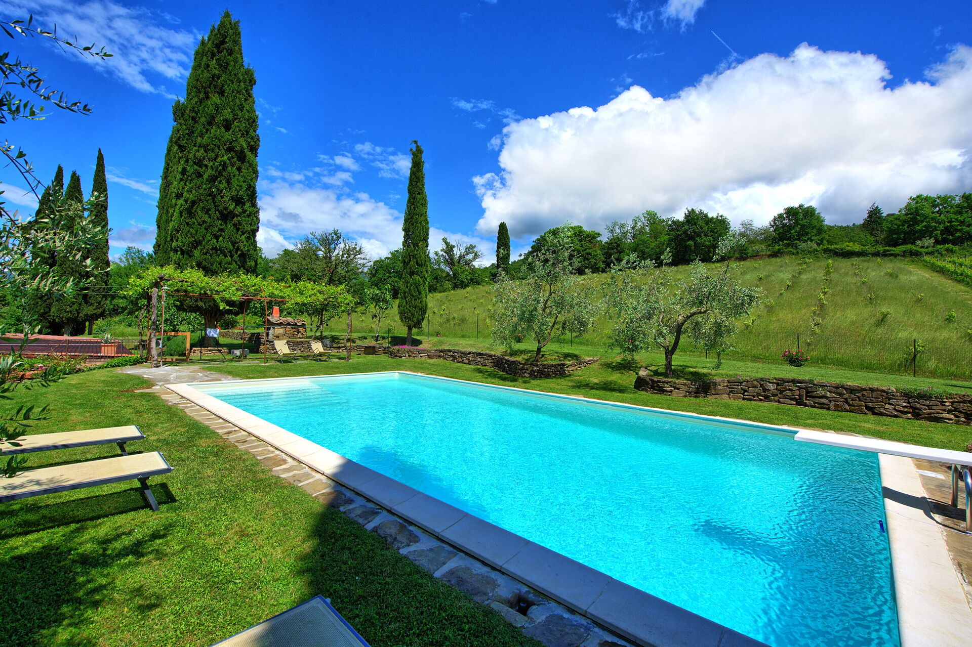 Beautiful secluded property about 5km outside of Cortona. Fully renovated up to date bathrooms for each bedroom. Very accessible and large swimming pool with loungers and large awning. First rate. Large manicured walkable grounds with lovely olive grove.top. Otch wifi reception. Stayed there 10 days. Loved every minute of it
