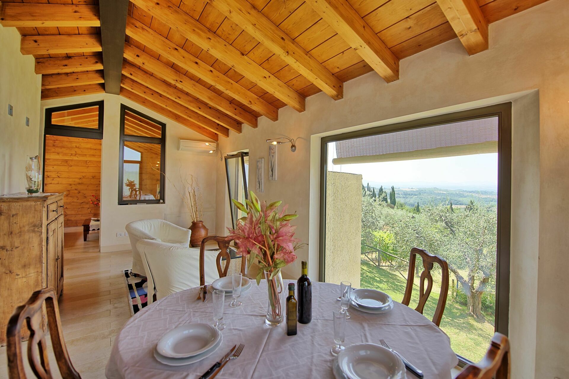 The villa has an open plan living area with the most spectacular view over the family vineyard and valley looking towards San Gimignano. The air conditioning upstairs was very welcome while the bedrooms downstairs remained lovely and cool. The swimming pool is wonderful.