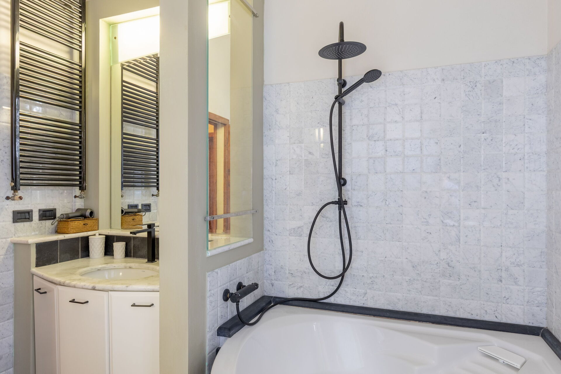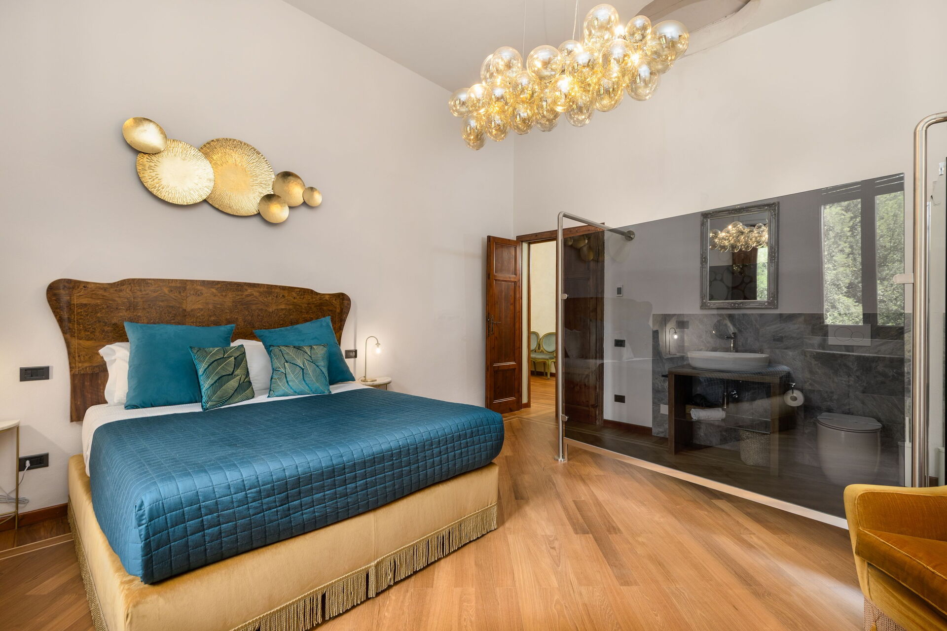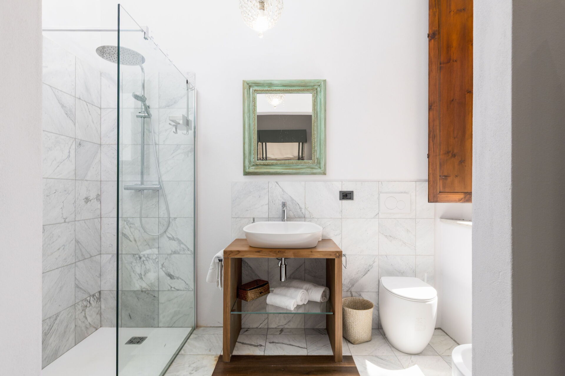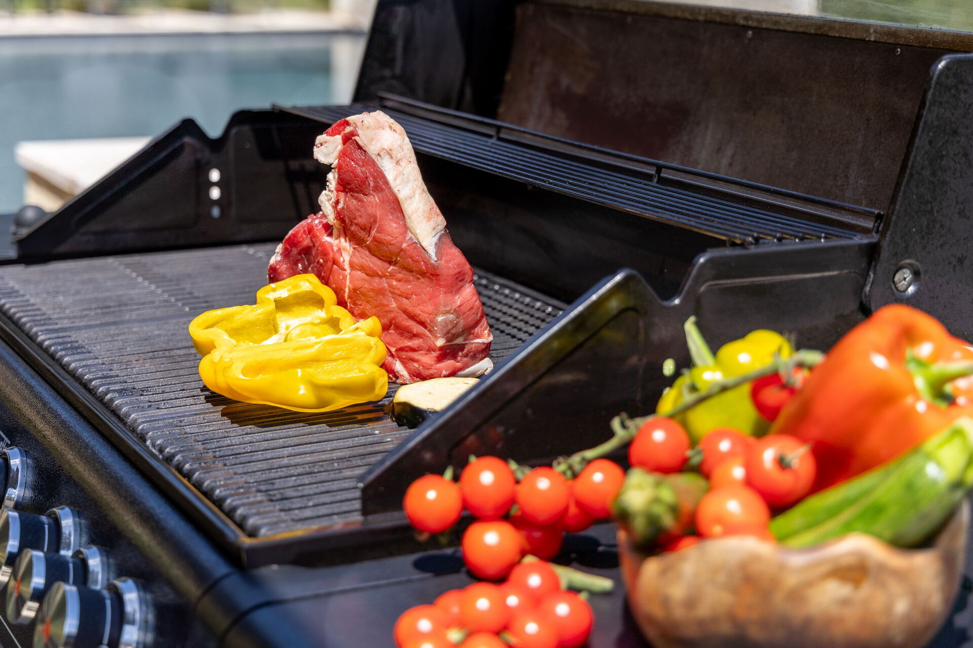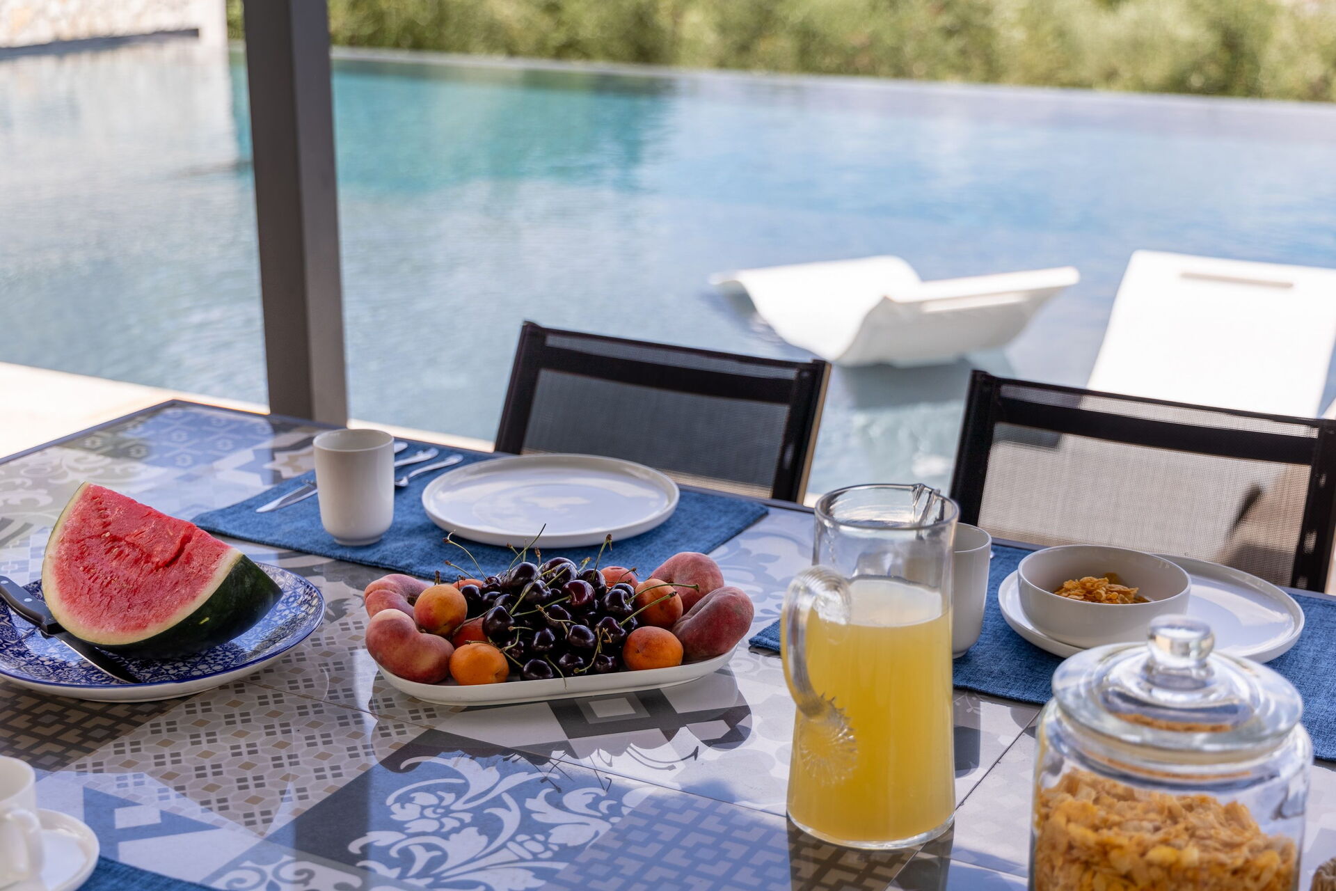 En smuk solterrasse i travertin med solsenge og parasoller omkranser infinity-poolen, som også har et boblehjørne og et kromoterapi-vandfald. Dette er det perfekte sted at slappe af eller køle sig ned på solrige sommerdage sammen med venner og familie. Gæsterne har også adgang til et grillområde udstyret til at kunne spise måltider udendørs.