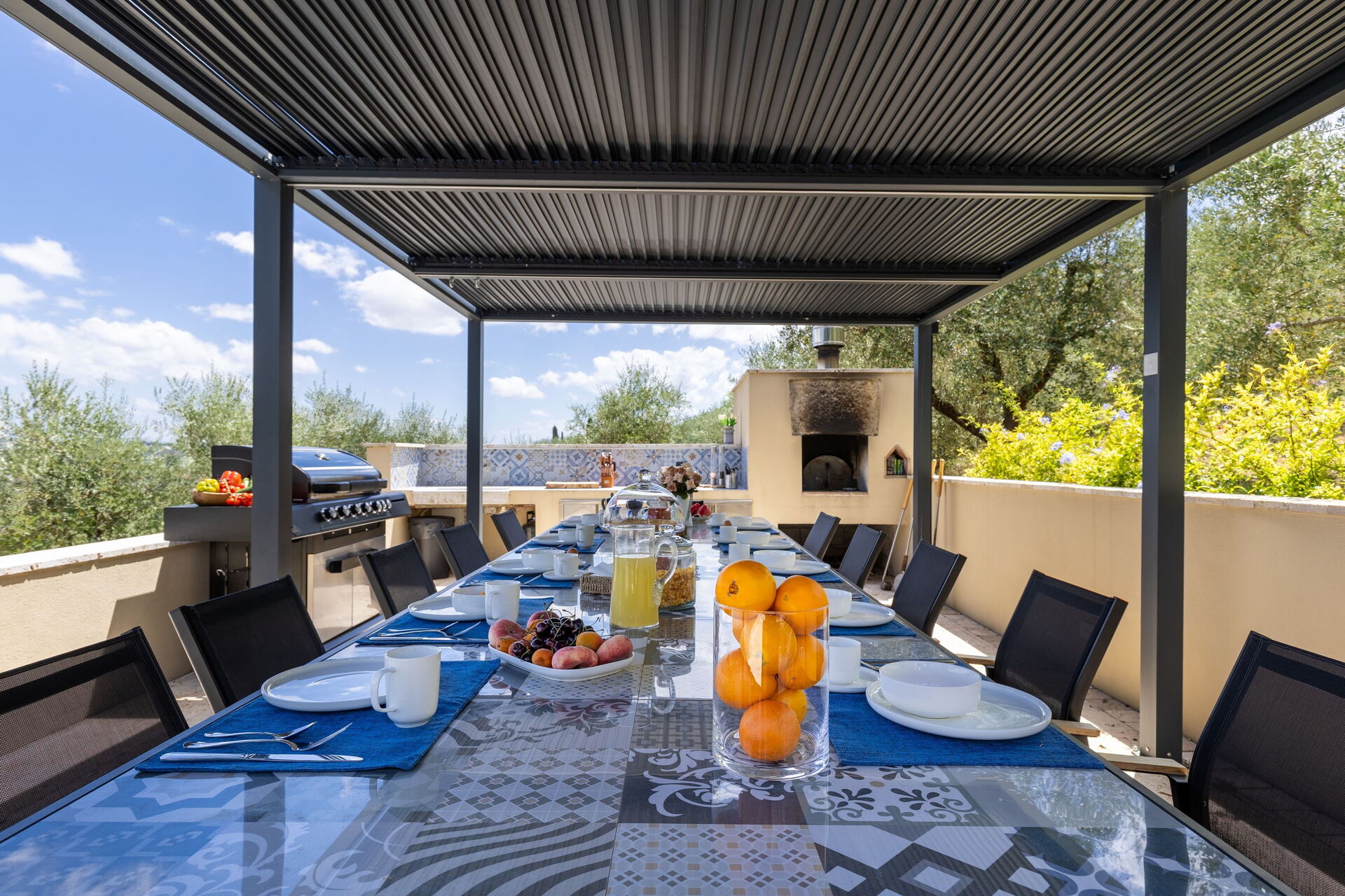 - udendørs spiseområde med bord, stole, brændefyret ovn og grill