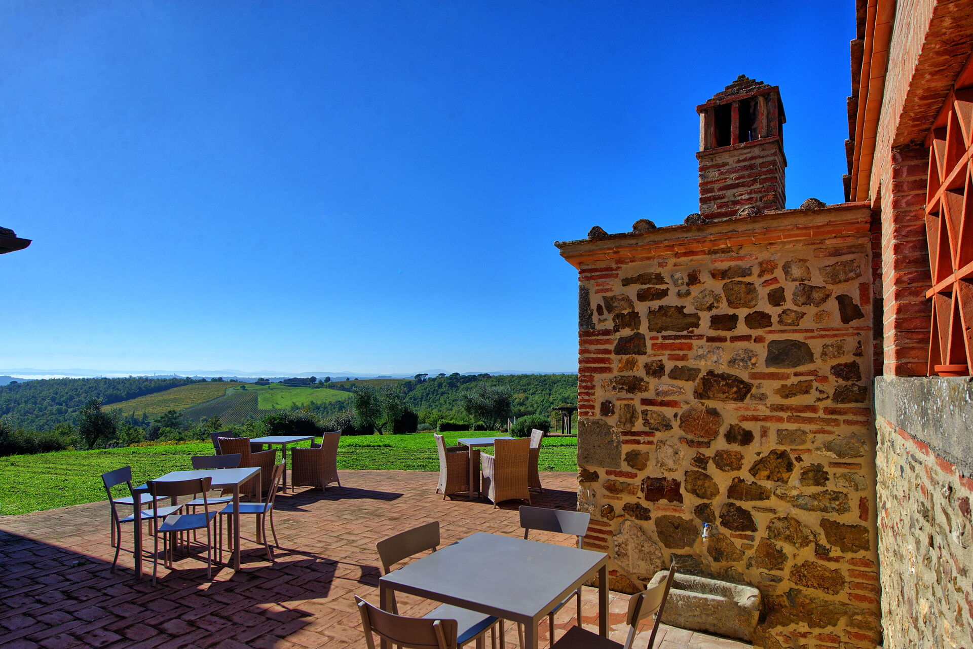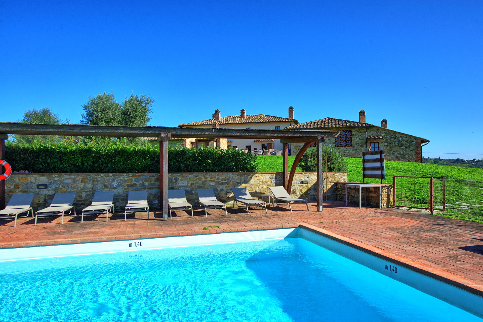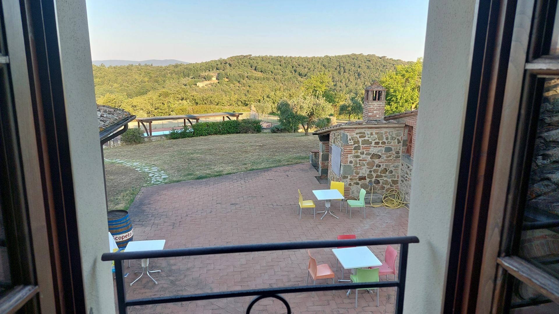 The property is in a beautiful but quiet location surrounded by vineyards and spectacular Tuscan scenery. The apartment was spacious and generally cool inside despite the high temperatures outside. The pool area is superb with extensive paving and plenty of sun-loungers.