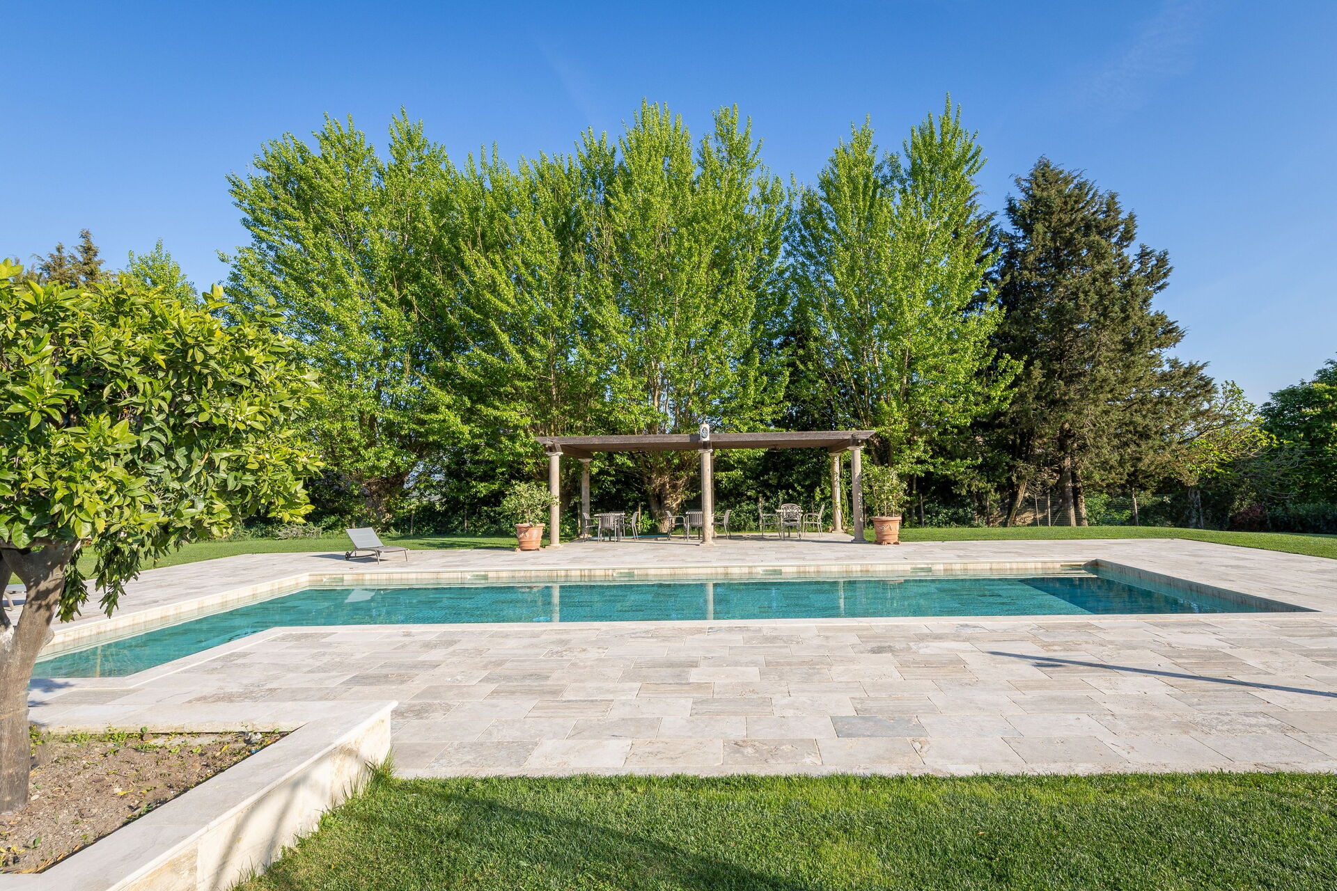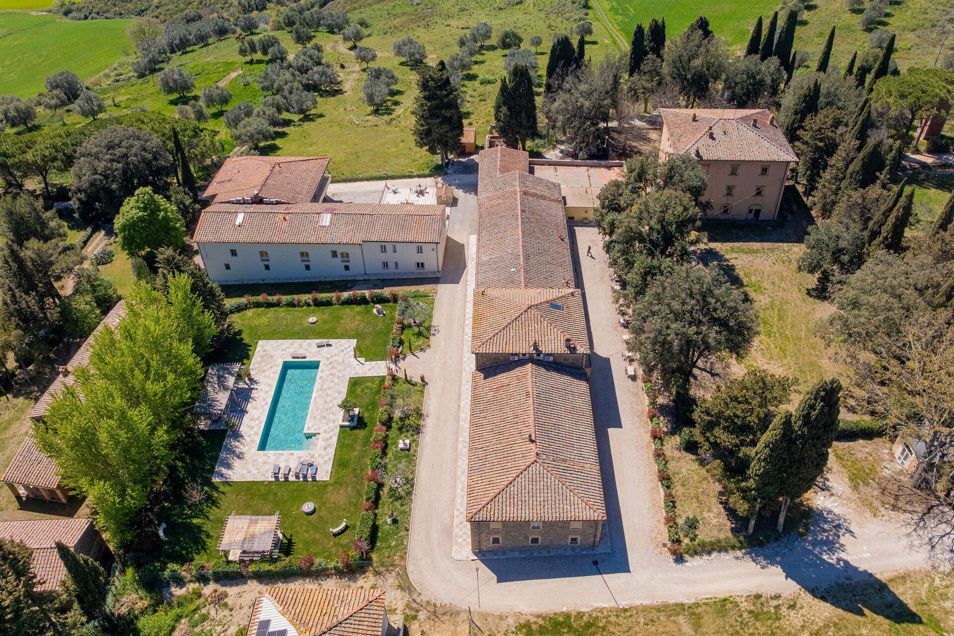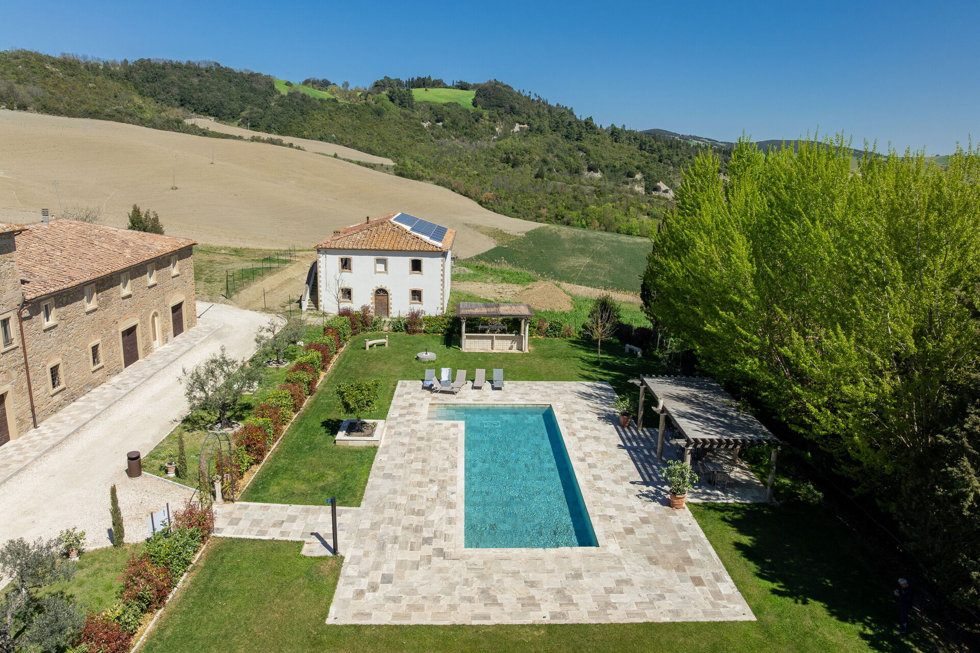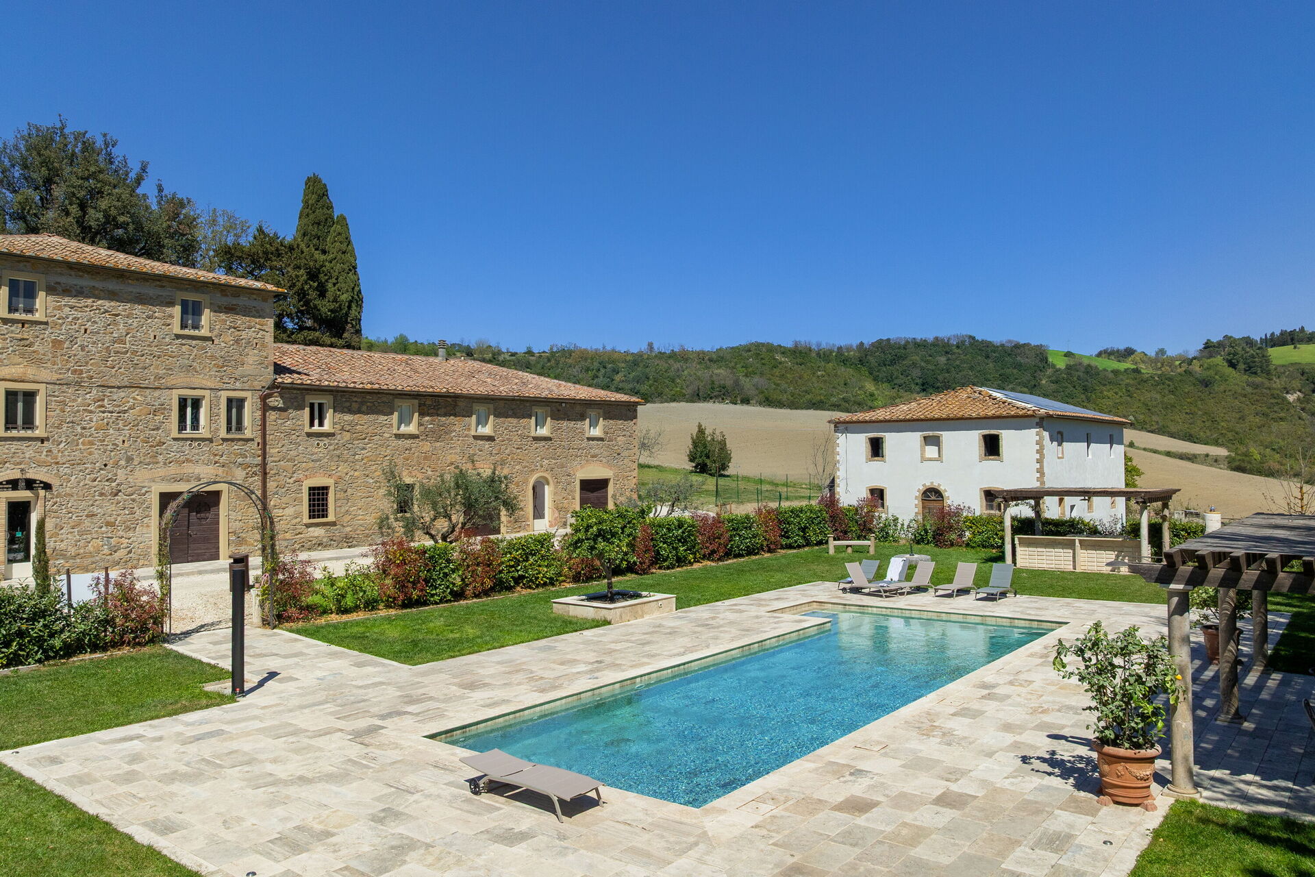 Ejendommen har en smuk beliggenhed omgivet af bølgende bakker med olivenlunde og vinmarker – et landskab, der er typisk for denne del af Toscana. Den velholdte have har en dejlig swimmingpool, som deles mellem gæsterne på ejendommen. Poolen er omgivet af en solterrasse med travertin, komplet med liggestole og parasoller – det perfekte sted at slappe af eller køle sig ned sammen med familie eller venner på varme sommerdage.