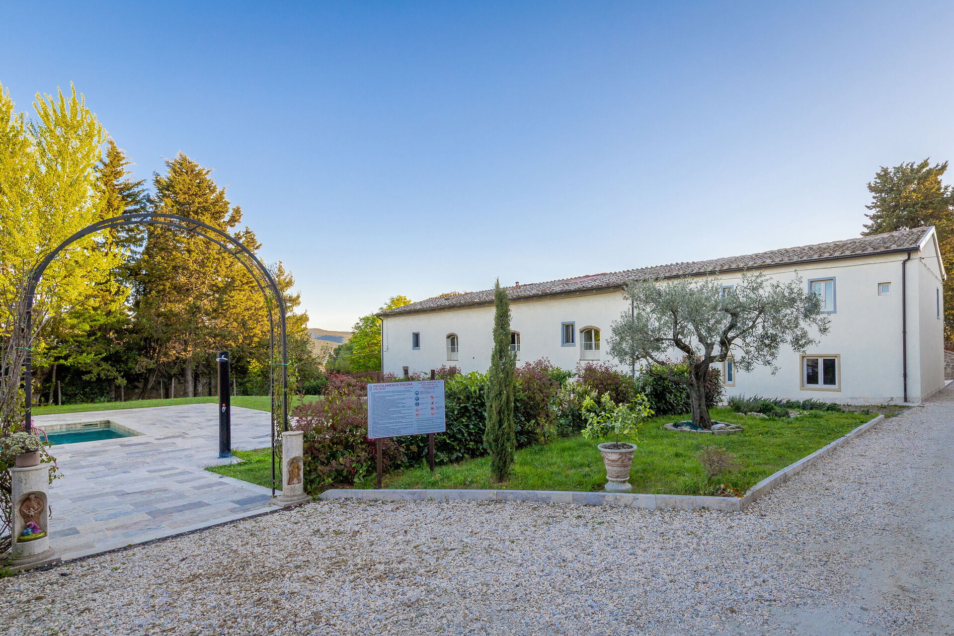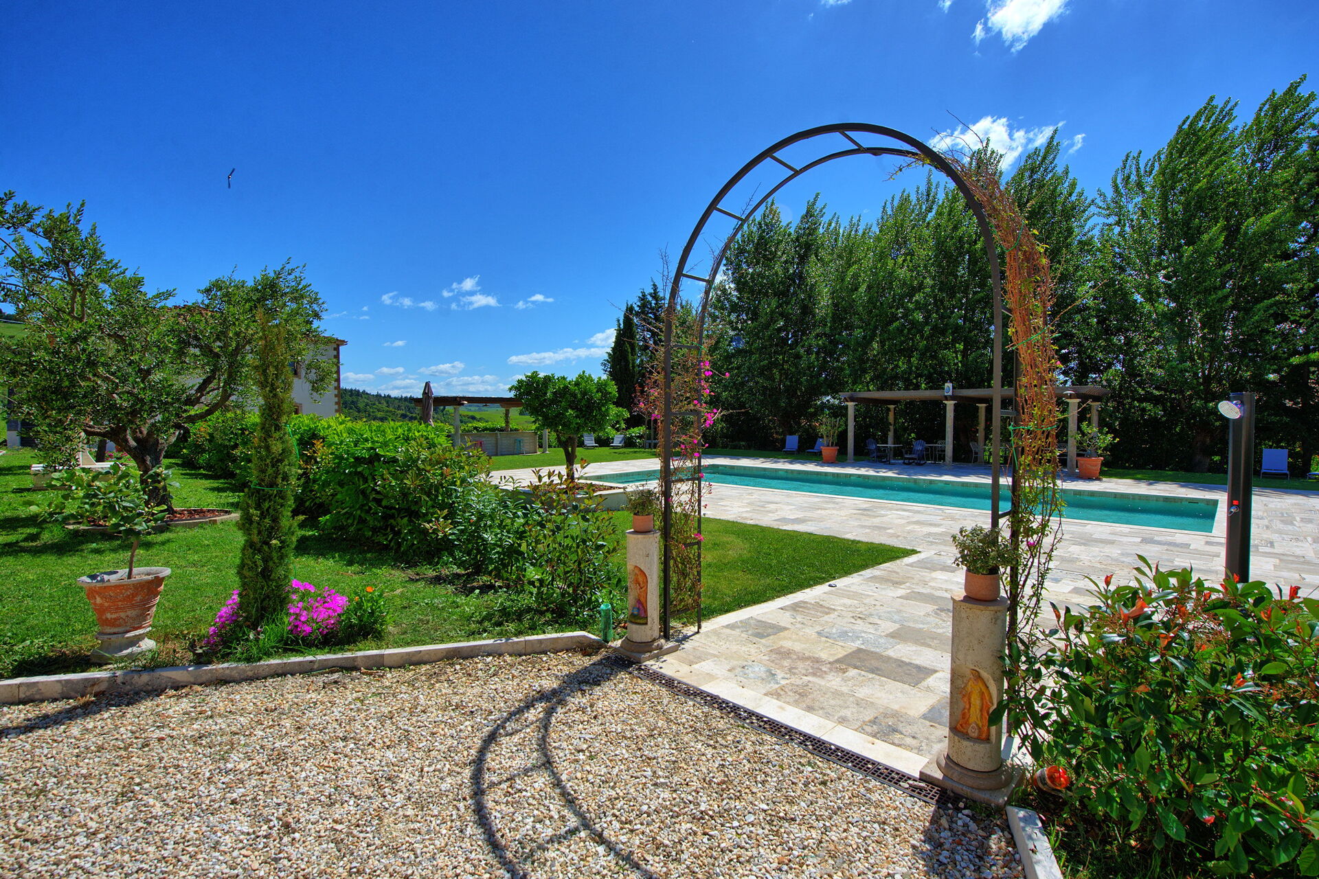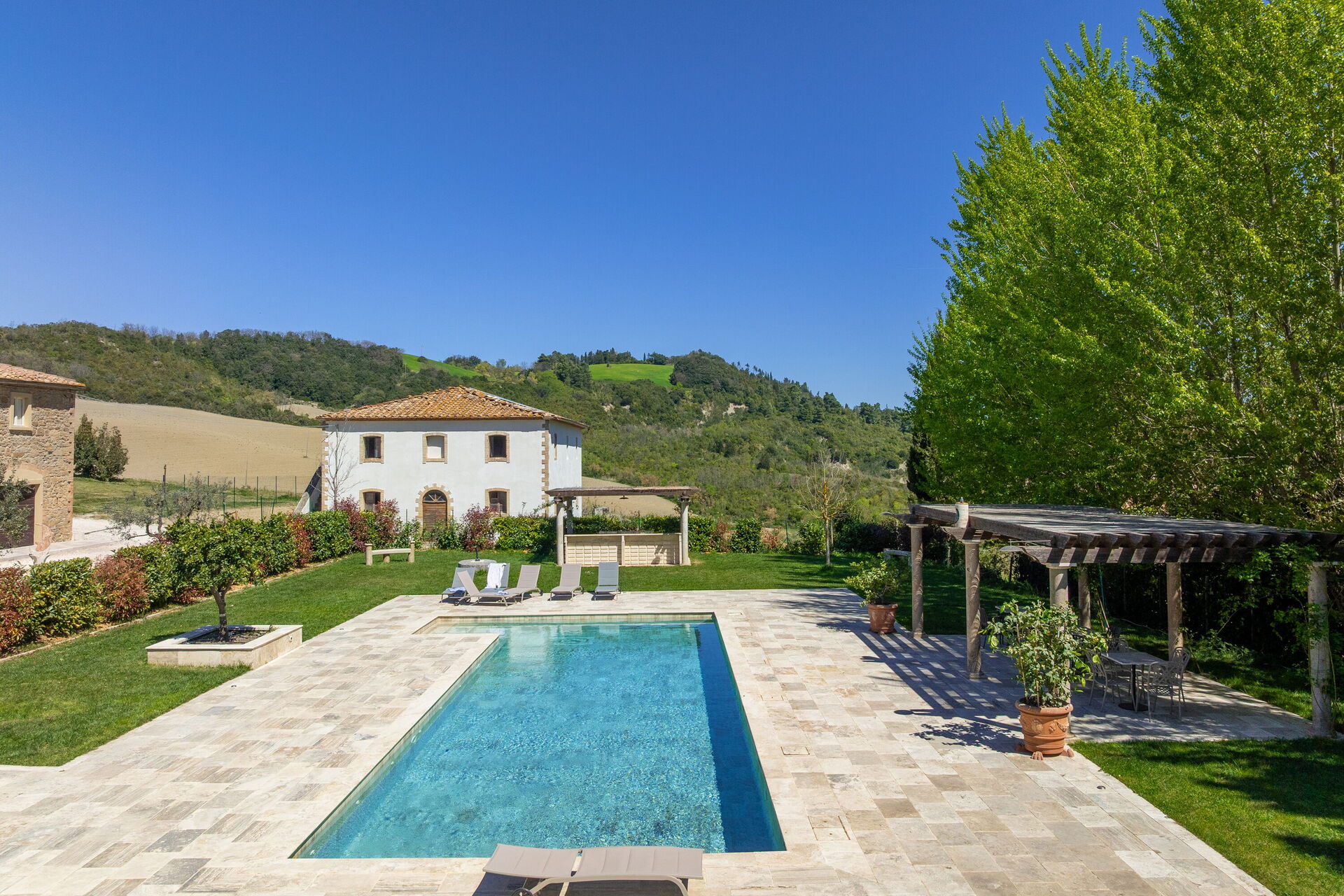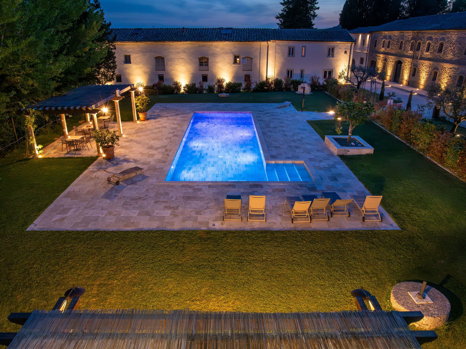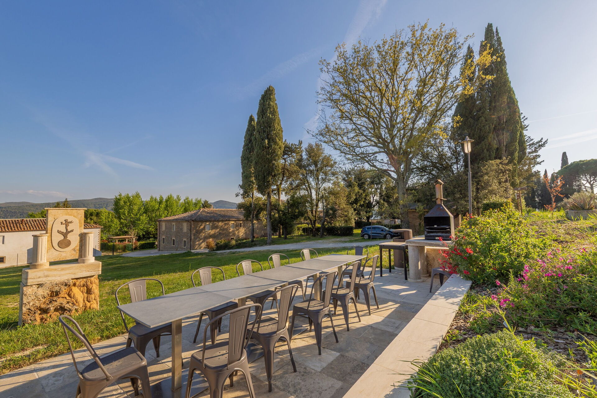 Ejendommen har en smuk beliggenhed omgivet af bølgende bakker med olivenlunde og vinmarker – et landskab, der er typisk for denne del af Toscana. Den velholdte have har en dejlig swimmingpool, som deles mellem gæsterne på ejendommen. Poolen er omgivet af en solterrasse med travertin, komplet med liggestole og parasoller – det perfekte sted at slappe af eller køle sig ned sammen med familie eller venner på varme sommerdage.