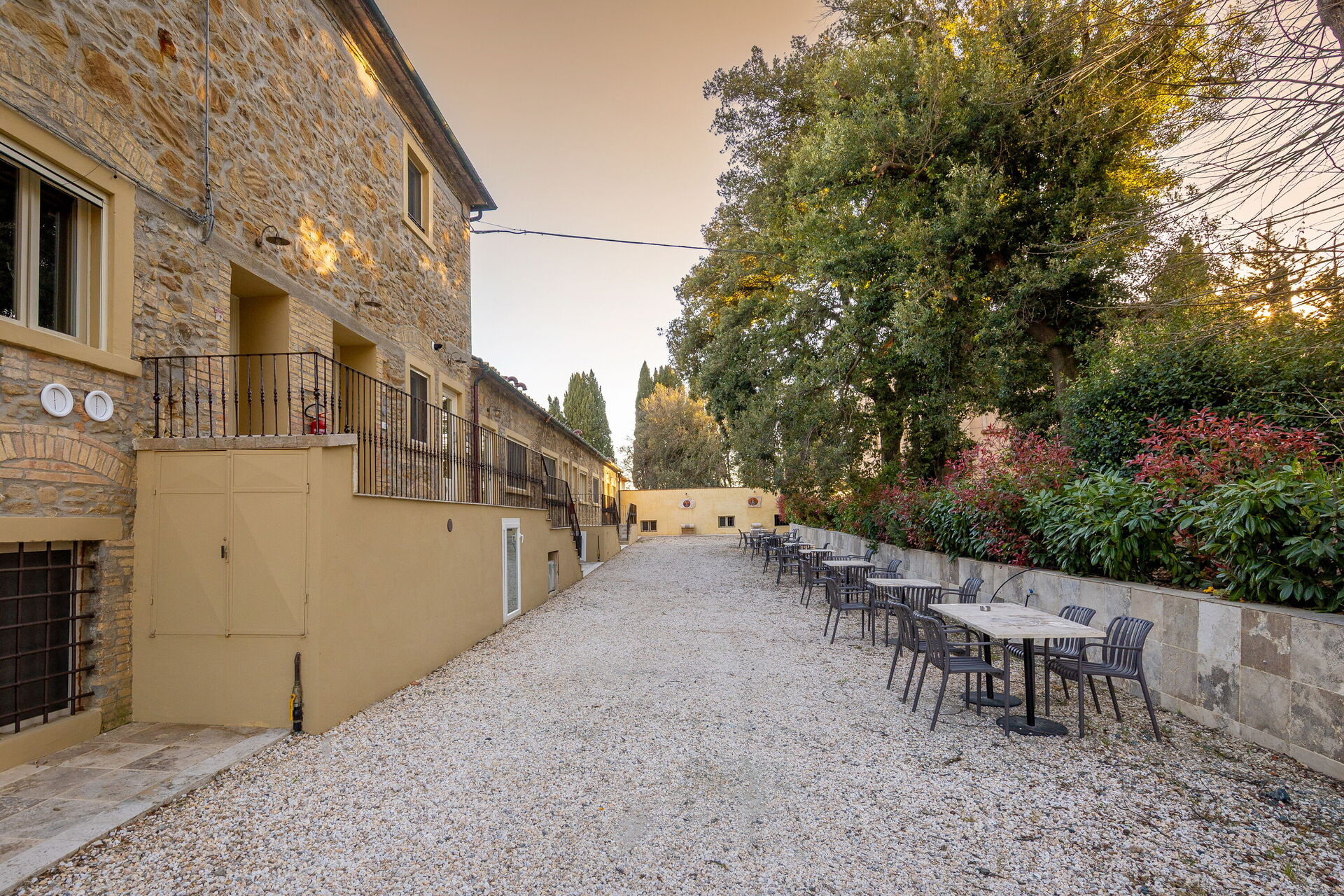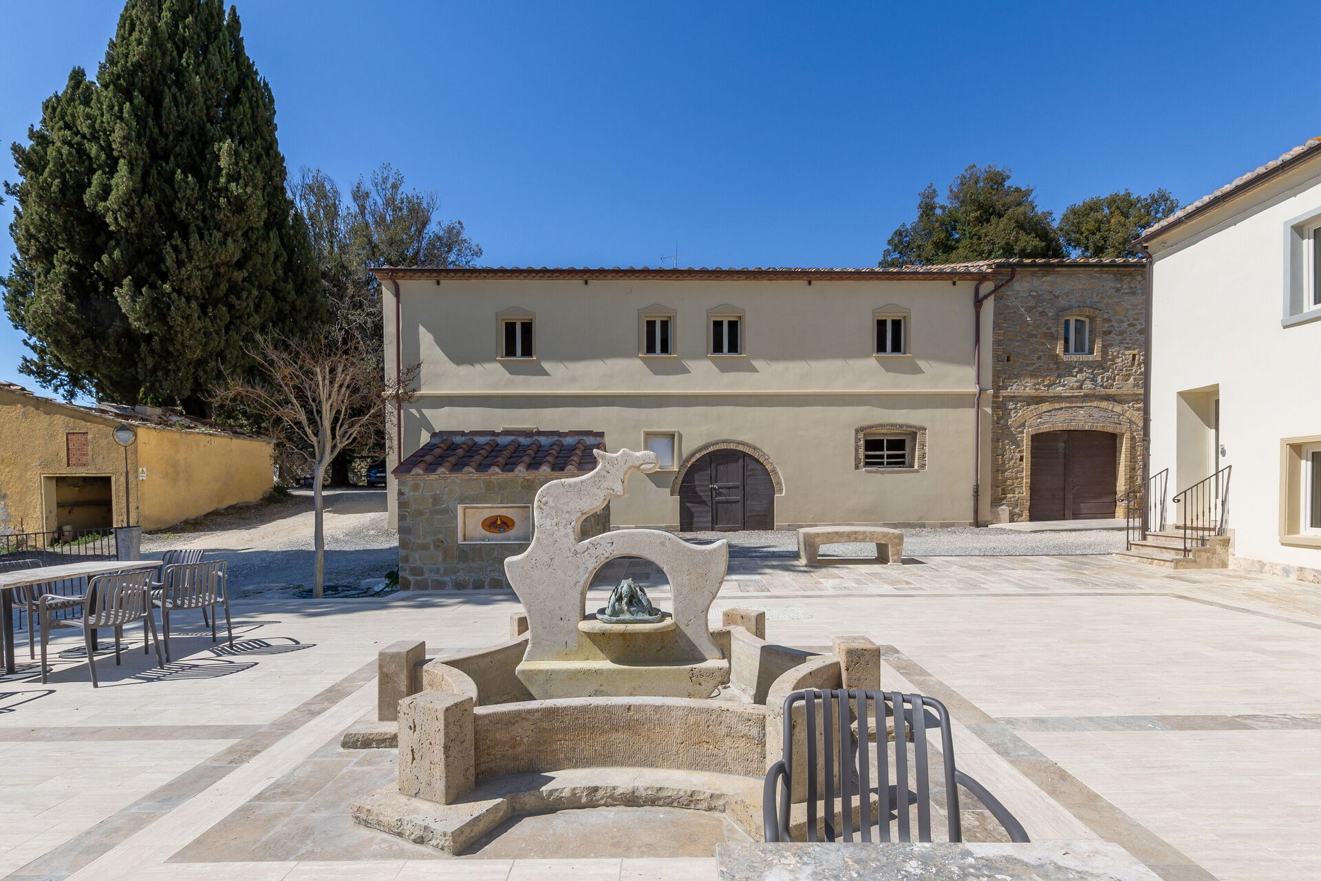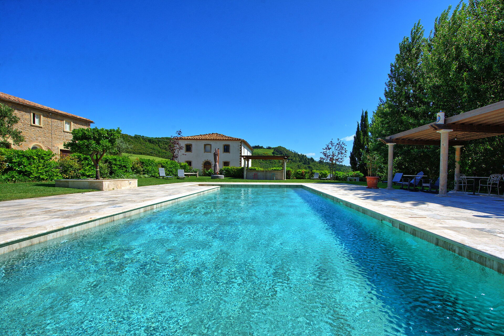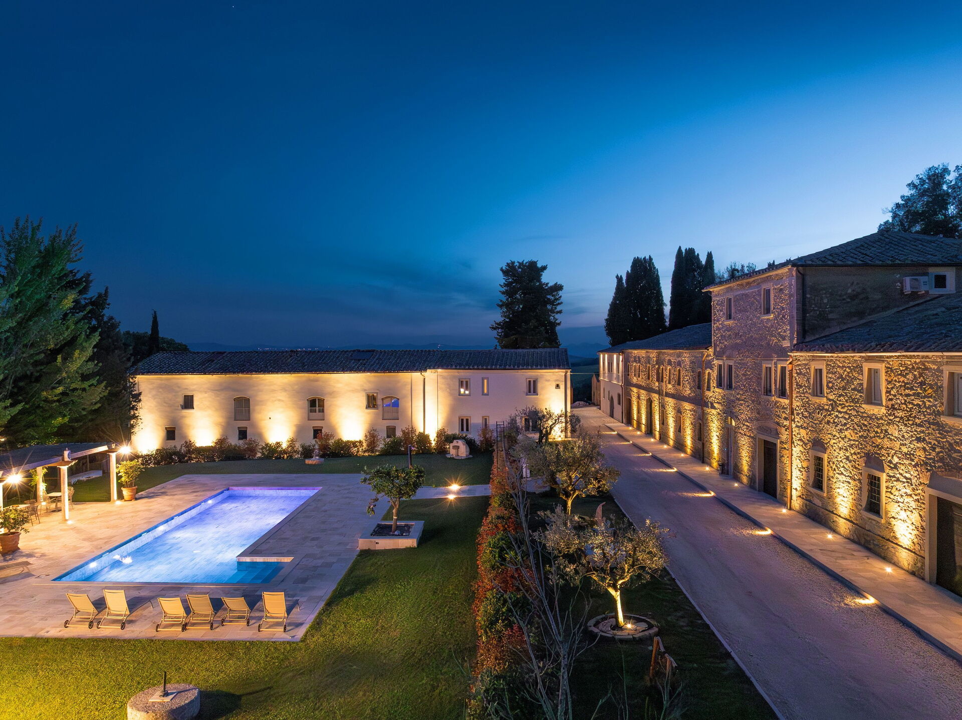 Ejendommen har en smuk beliggenhed omgivet af bølgende bakker med olivenlunde og vinmarker – et landskab, der er typisk for denne del af Toscana. Den velholdte have har en dejlig swimmingpool, som deles mellem gæsterne på ejendommen. Poolen er omgivet af en solterrasse med travertin, komplet med liggestole og parasoller – det perfekte sted at slappe af eller køle sig ned sammen med familie eller venner på varme sommerdage.