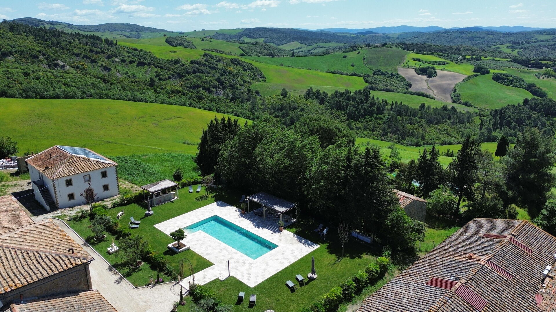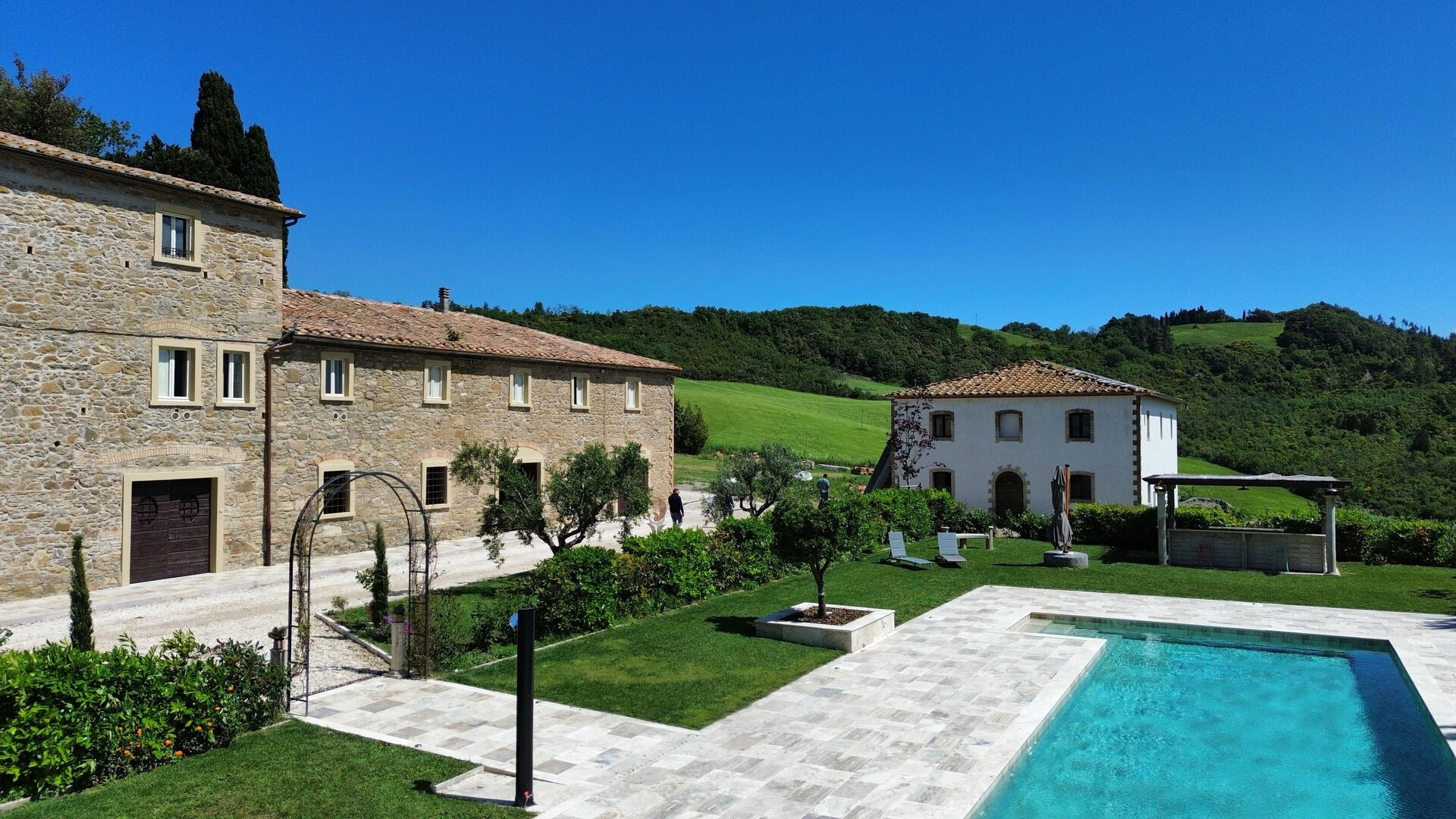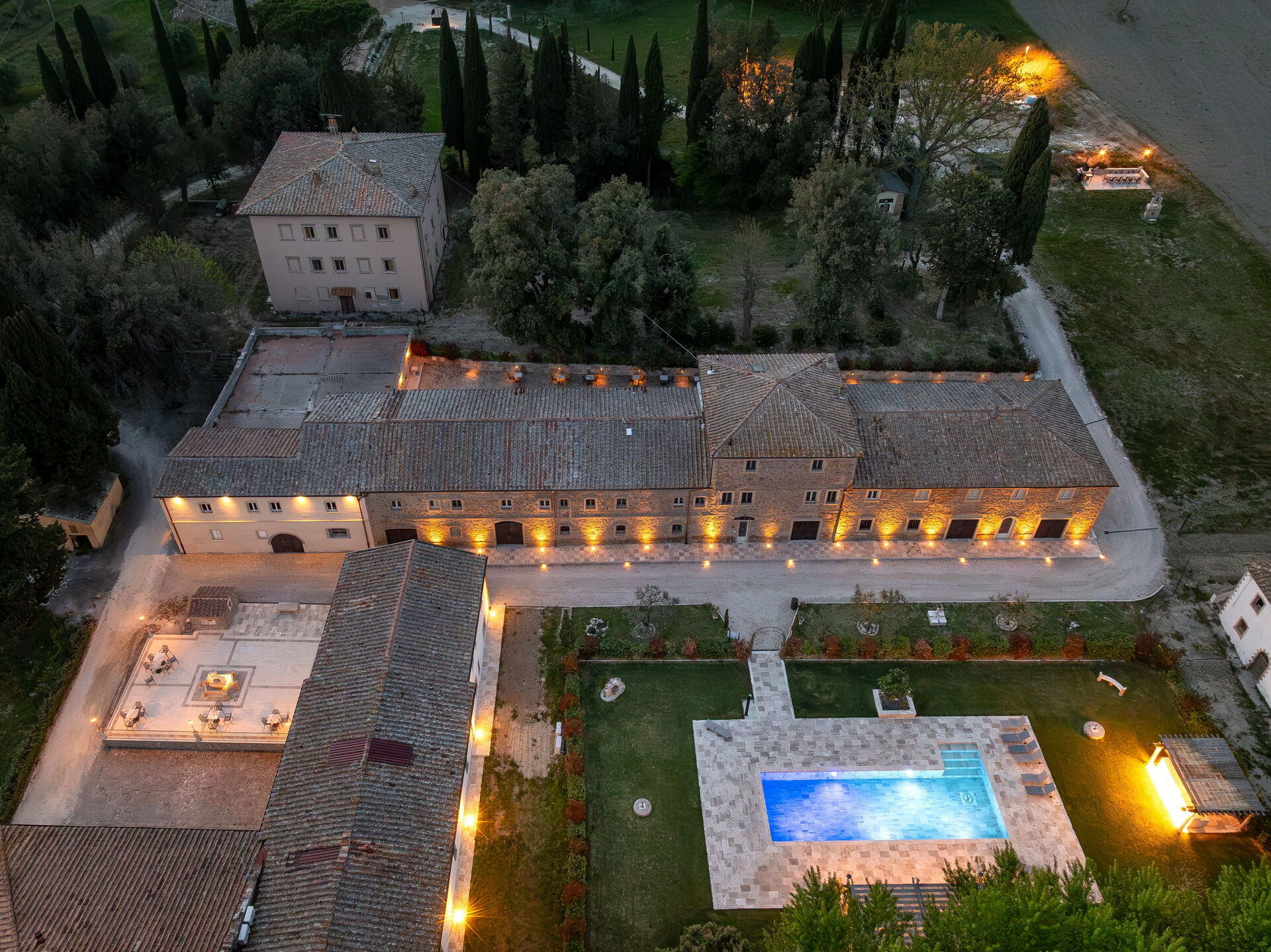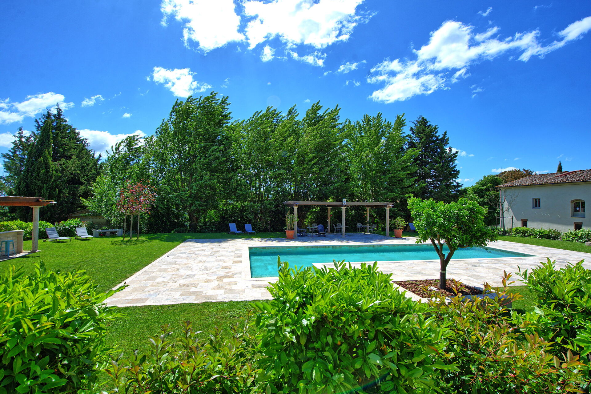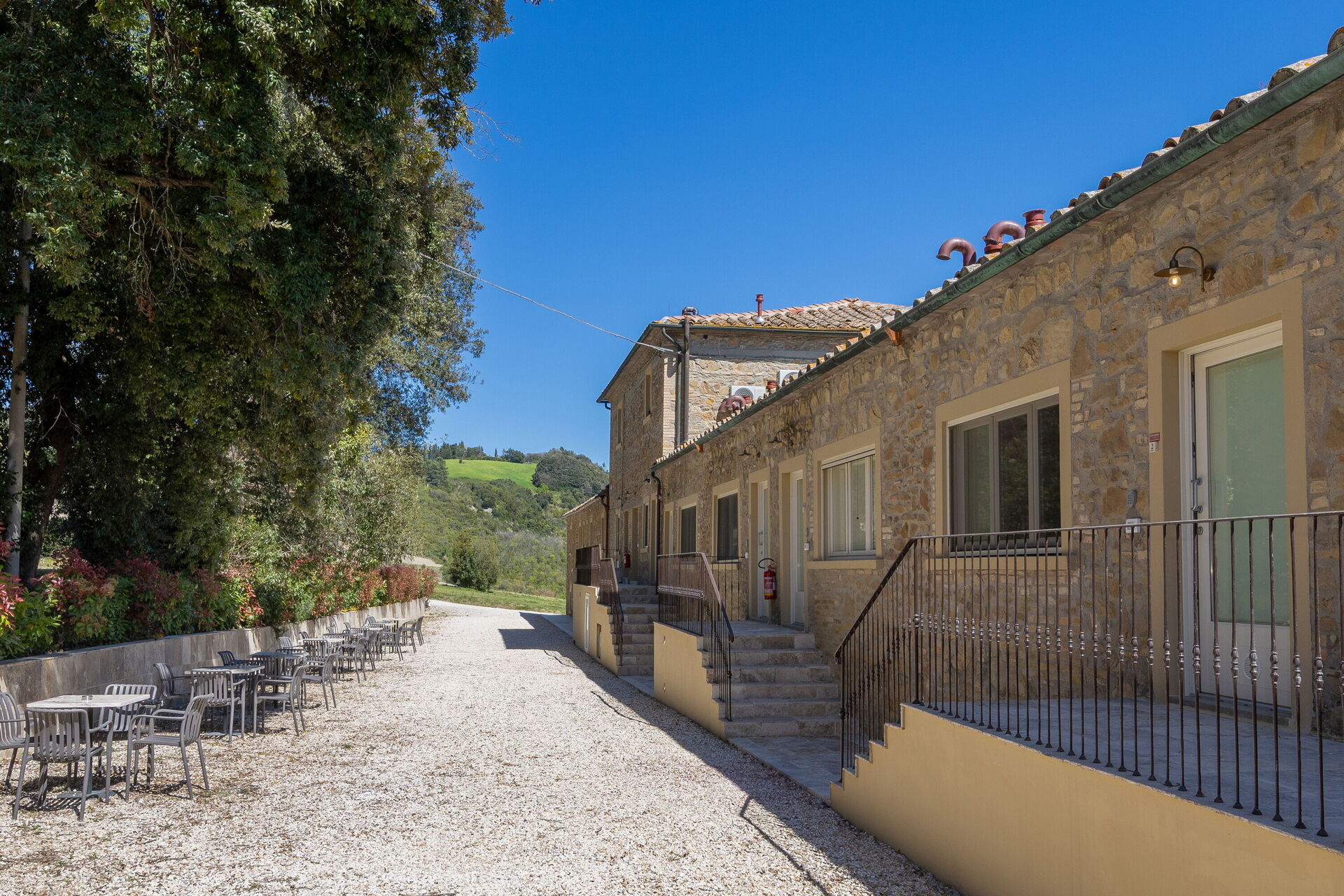Ejendommen har en smuk beliggenhed omgivet af bølgende bakker med olivenlunde og vinmarker – et landskab, der er typisk for denne del af Toscana. Den velholdte have har en dejlig swimmingpool, som deles mellem gæsterne på ejendommen. Poolen er omgivet af en solterrasse med travertin, komplet med liggestole og parasoller – det perfekte sted at slappe af eller køle sig ned sammen med familie eller venner på varme sommerdage.