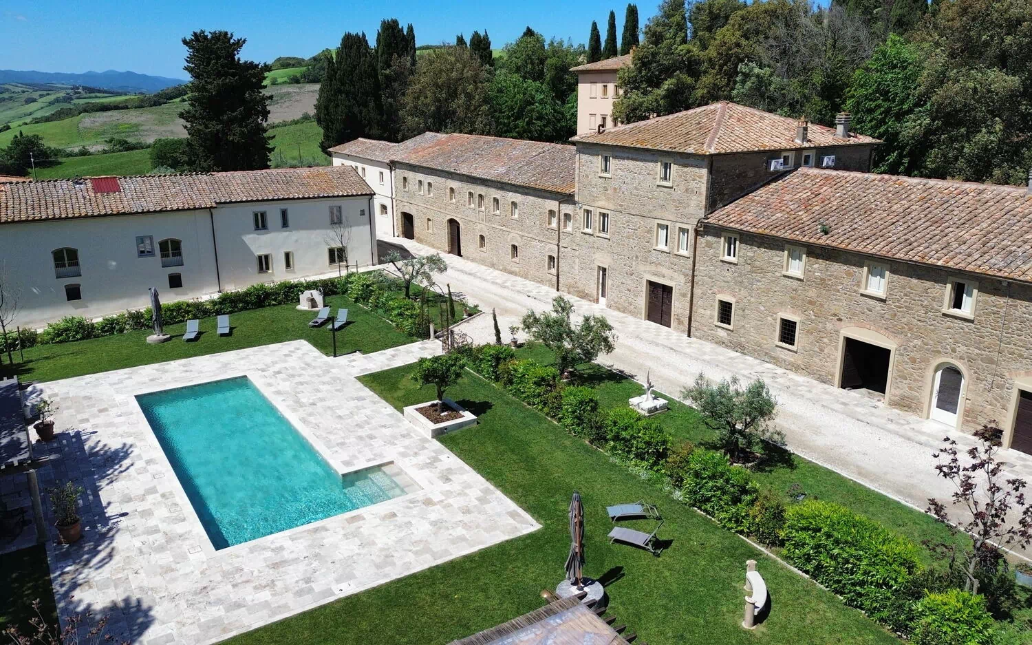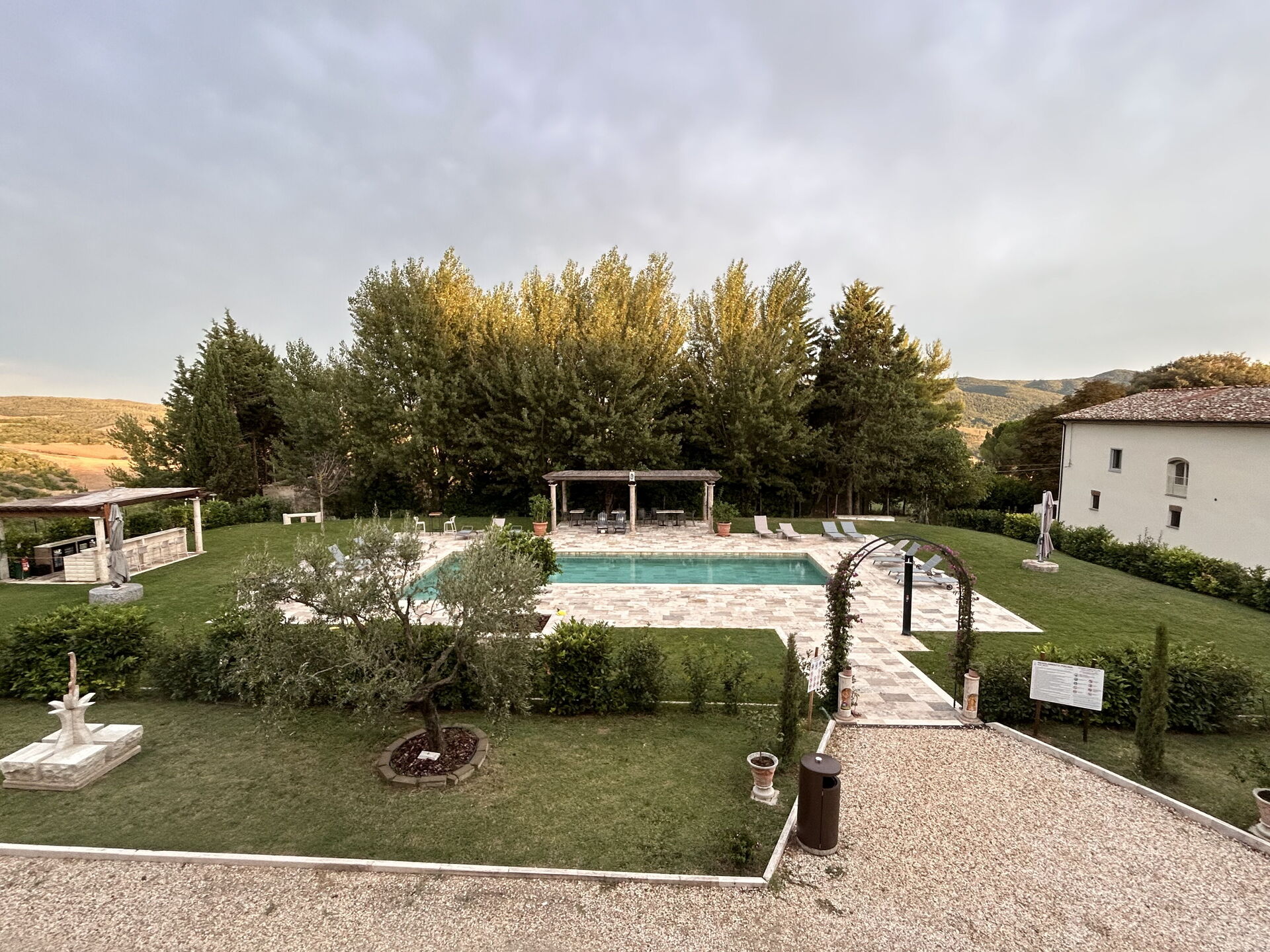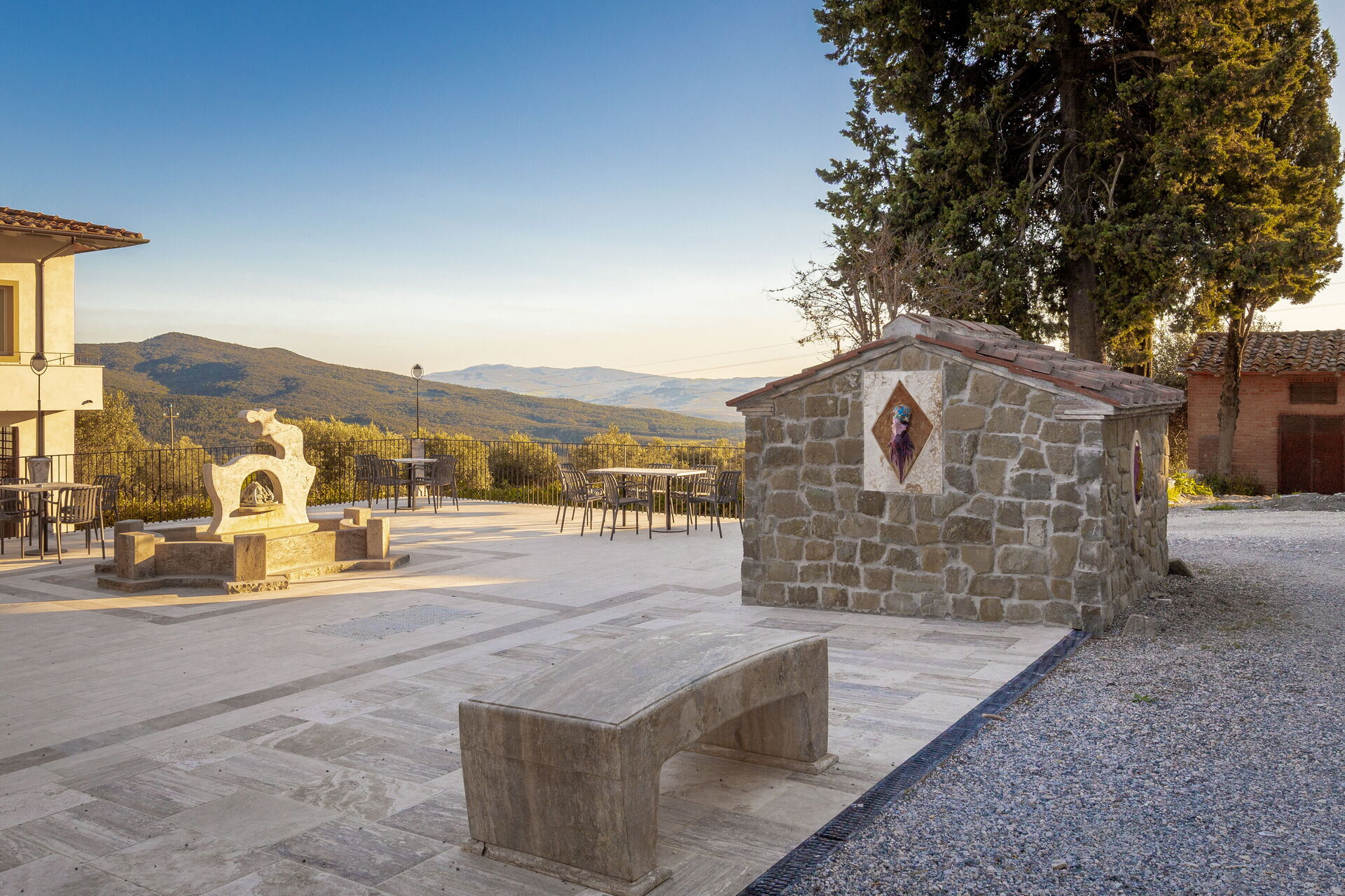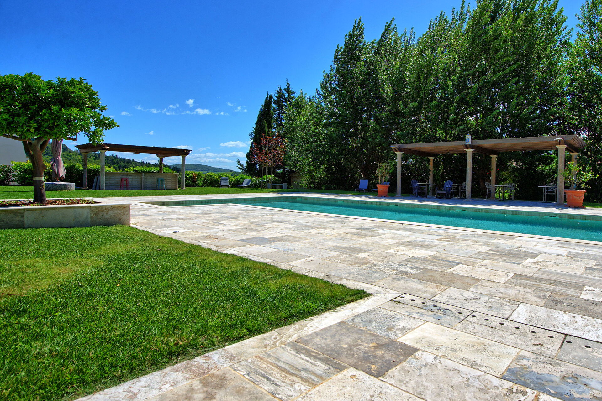 Ejendommen har en smuk beliggenhed omgivet af bølgende bakker med olivenlunde og vinmarker – et landskab, der er typisk for denne del af Toscana. Den velholdte have har en dejlig swimmingpool, som deles mellem gæsterne på ejendommen. Poolen er omgivet af en solterrasse med travertin, komplet med liggestole og parasoller – det perfekte sted at slappe af eller køle sig ned sammen med familie eller venner på varme sommerdage.