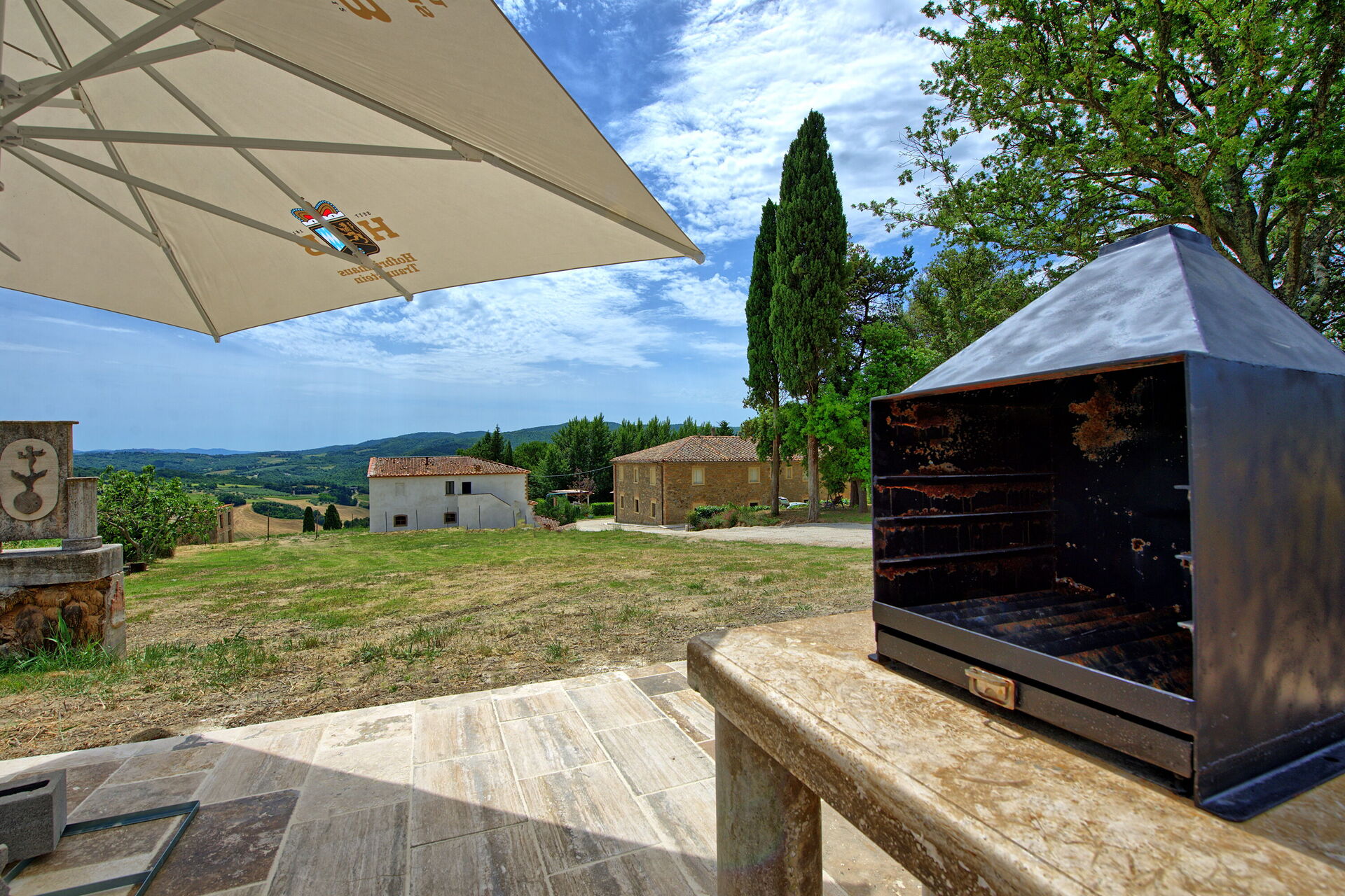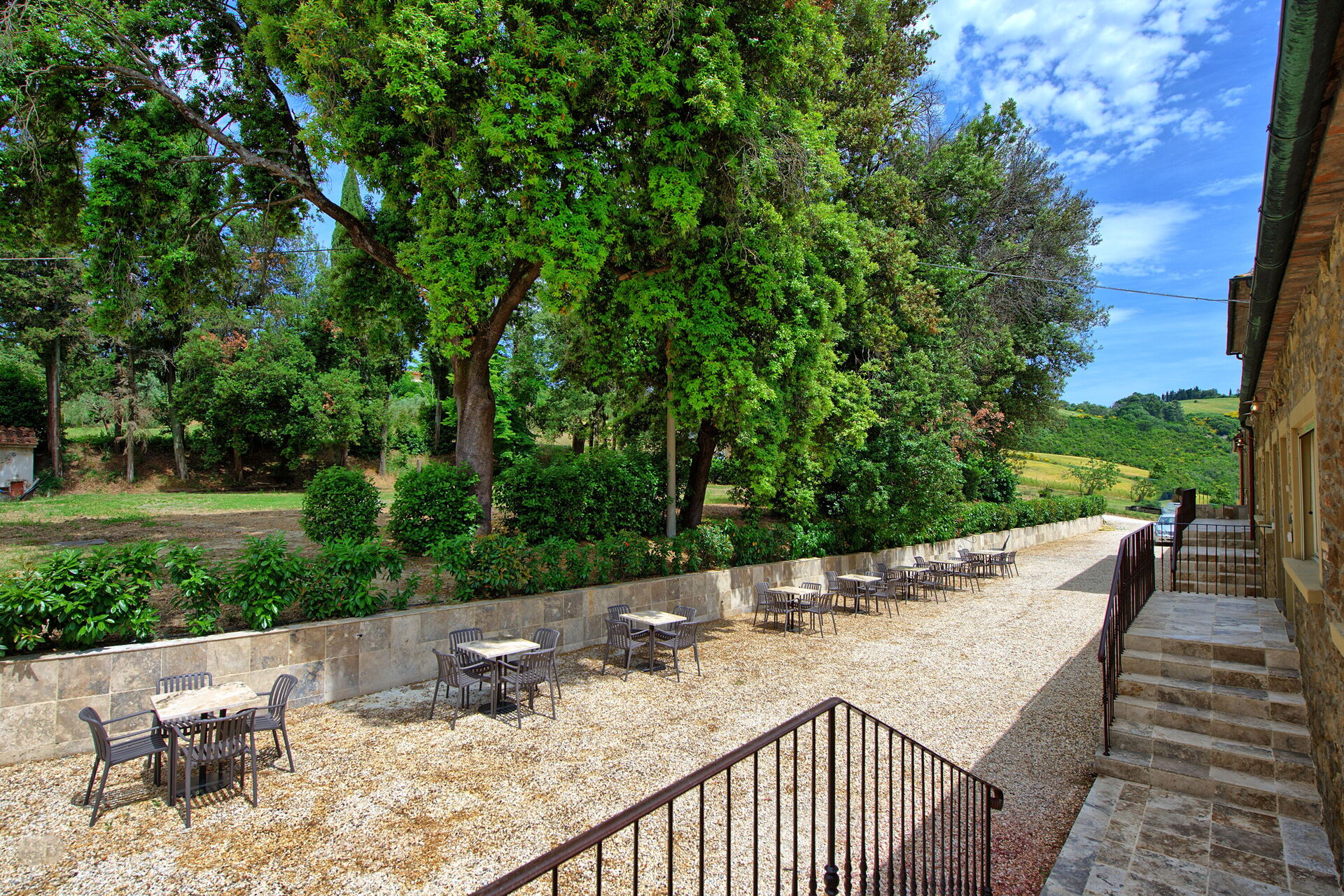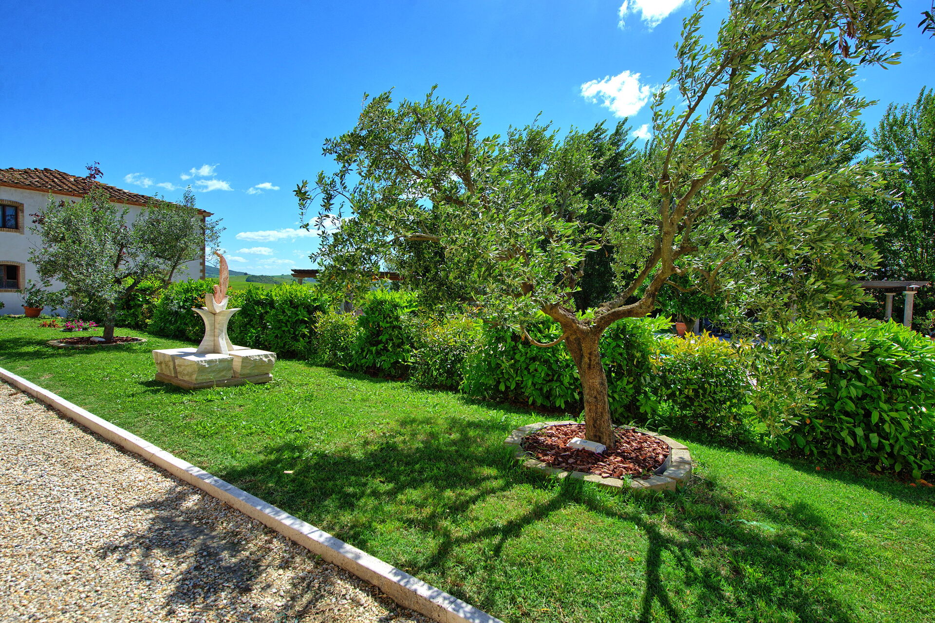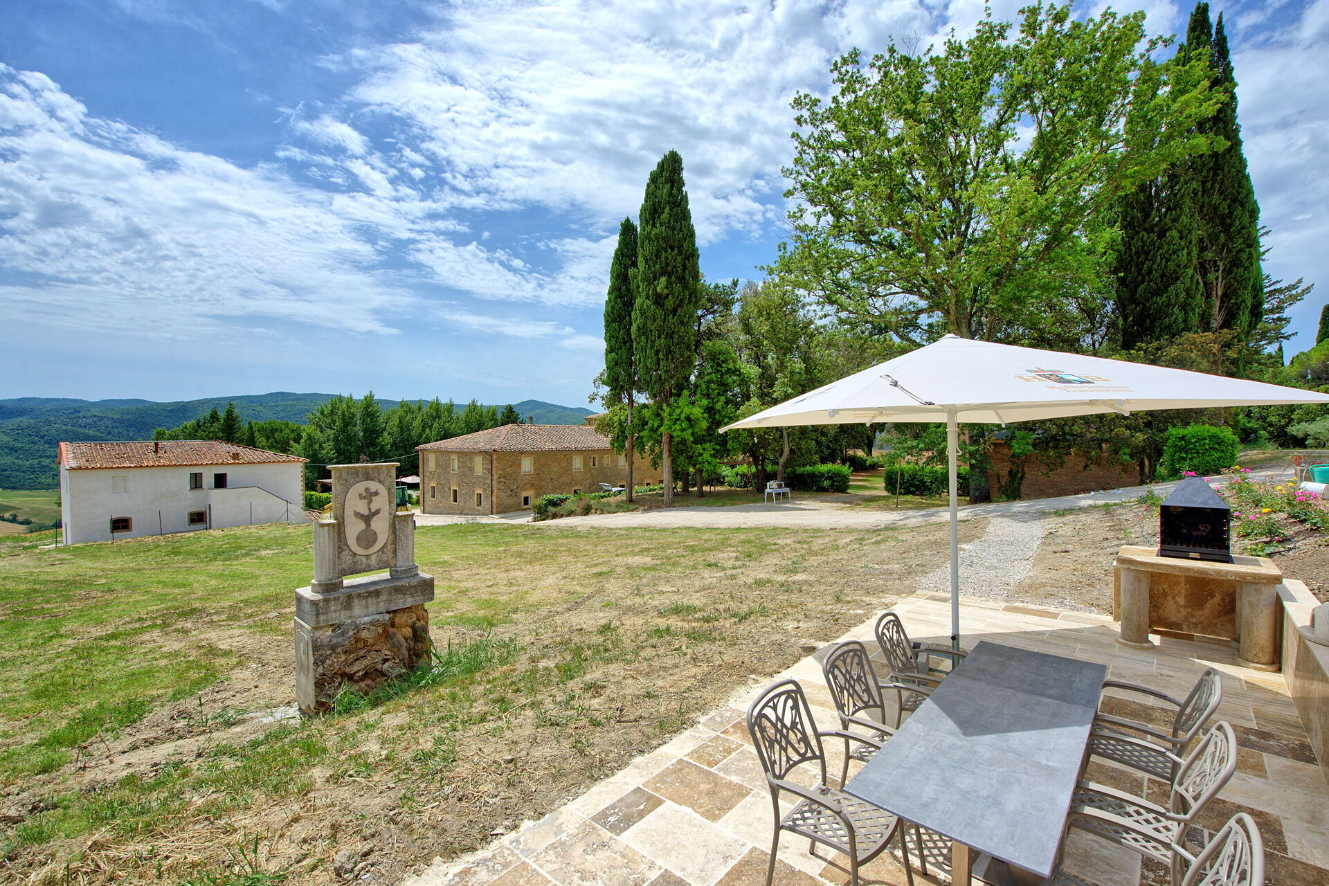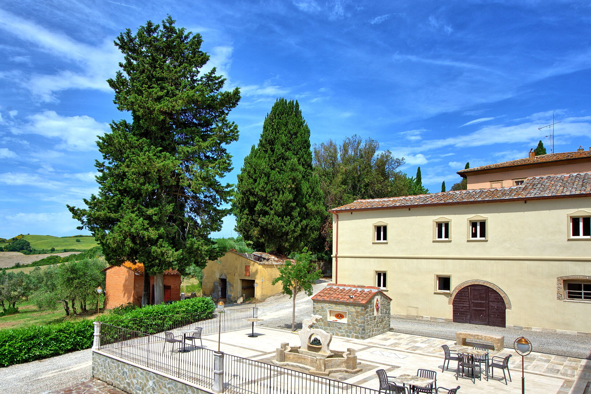 Ejendommen har en smuk beliggenhed omgivet af bølgende bakker med olivenlunde og vinmarker – et landskab, der er typisk for denne del af Toscana. Den velholdte have har en dejlig swimmingpool, som deles mellem gæsterne på ejendommen. Poolen er omgivet af en solterrasse med travertin, komplet med liggestole og parasoller – det perfekte sted at slappe af eller køle sig ned sammen med familie eller venner på varme sommerdage.