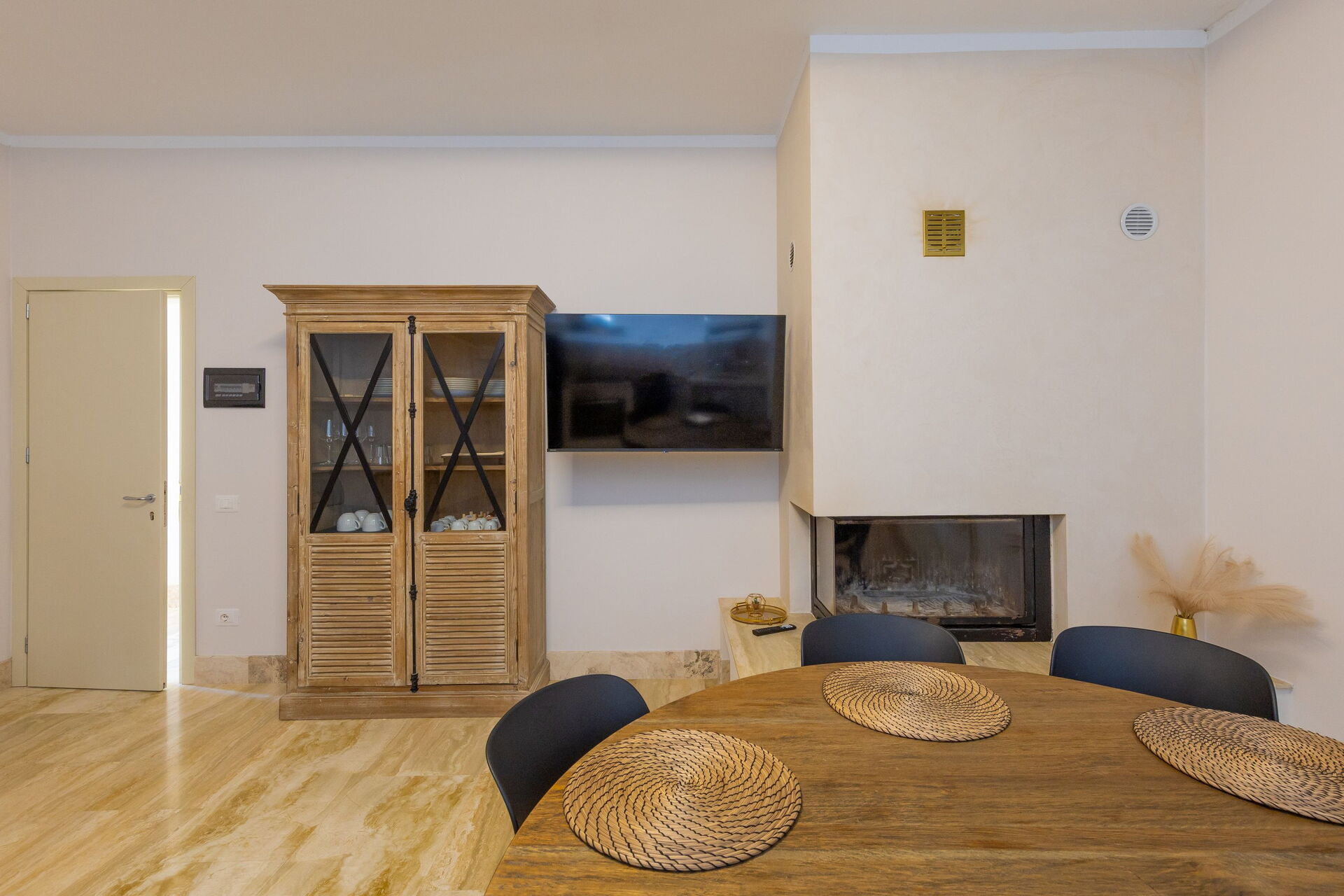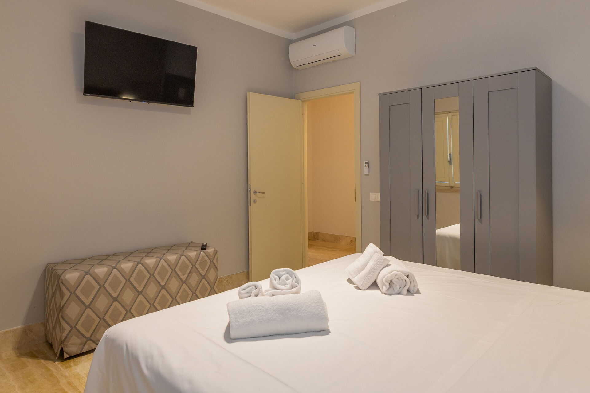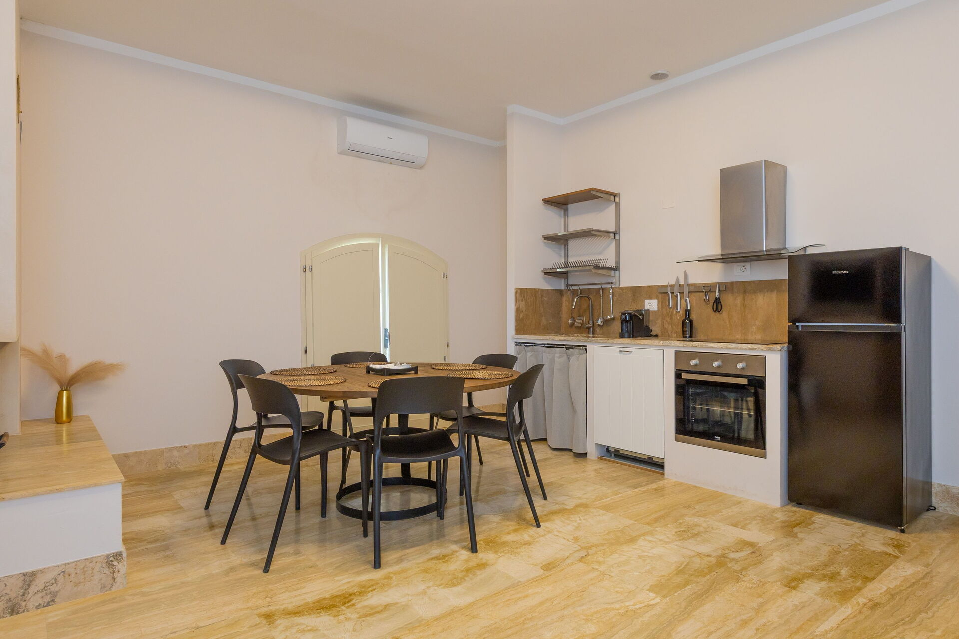 Første etage: stue (smart-TV, aircondition) med dobbelt sovesofa, spiseområde og tekøkken (opvaskemaskine, ovn, køleskab, espressomaskine, brødrister), 2 dobbeltværelser (hver med aircondition), badeværelse med bruser.