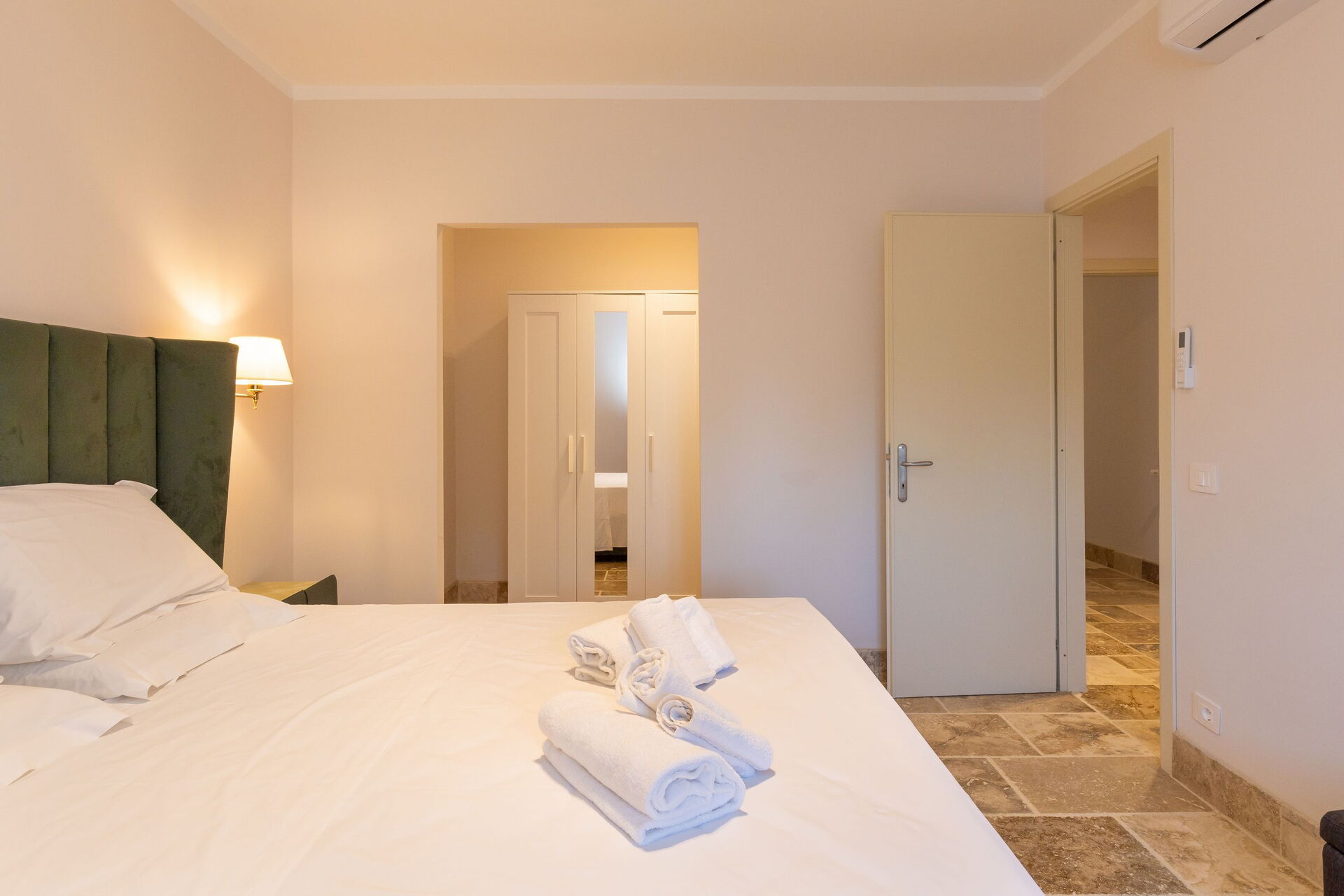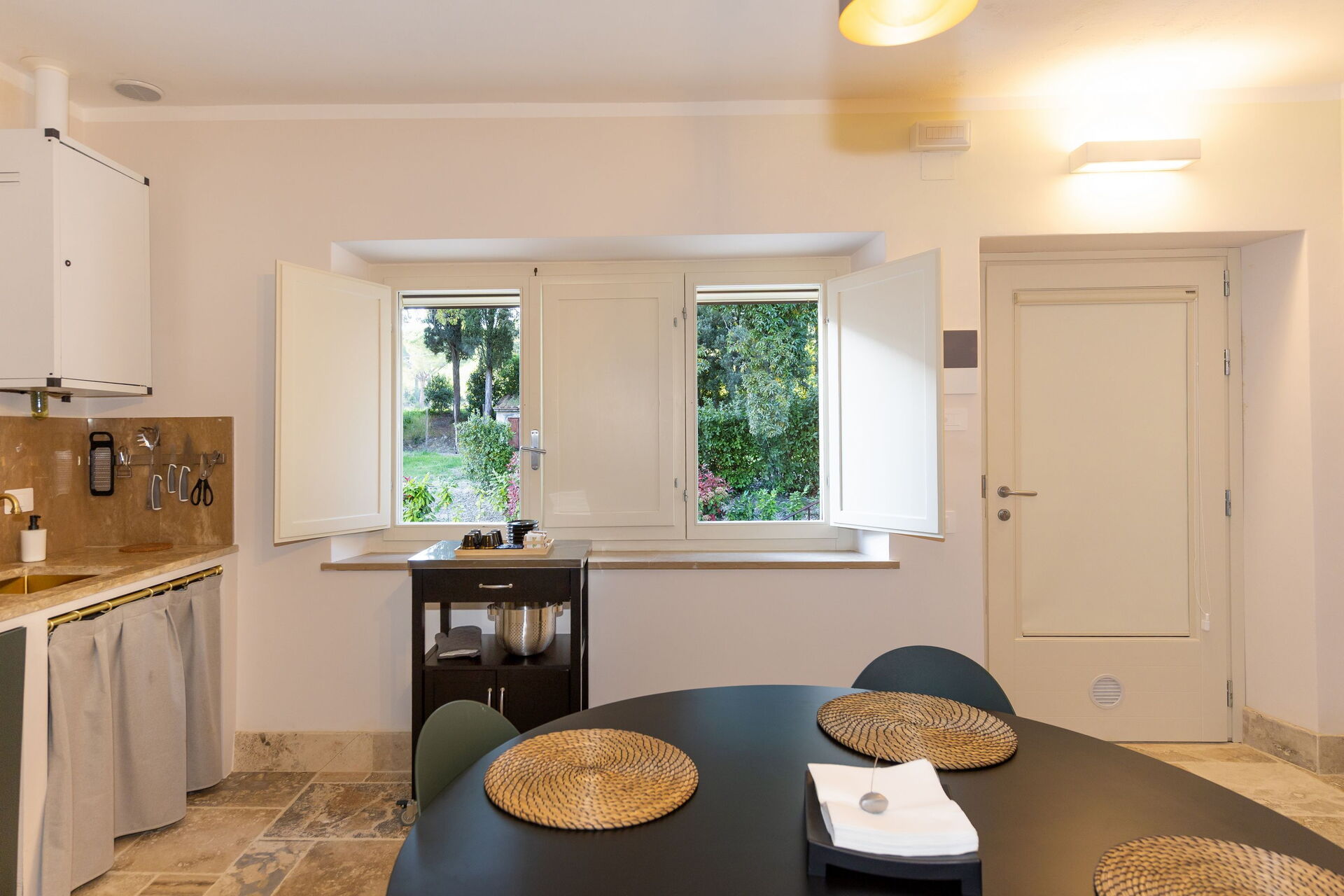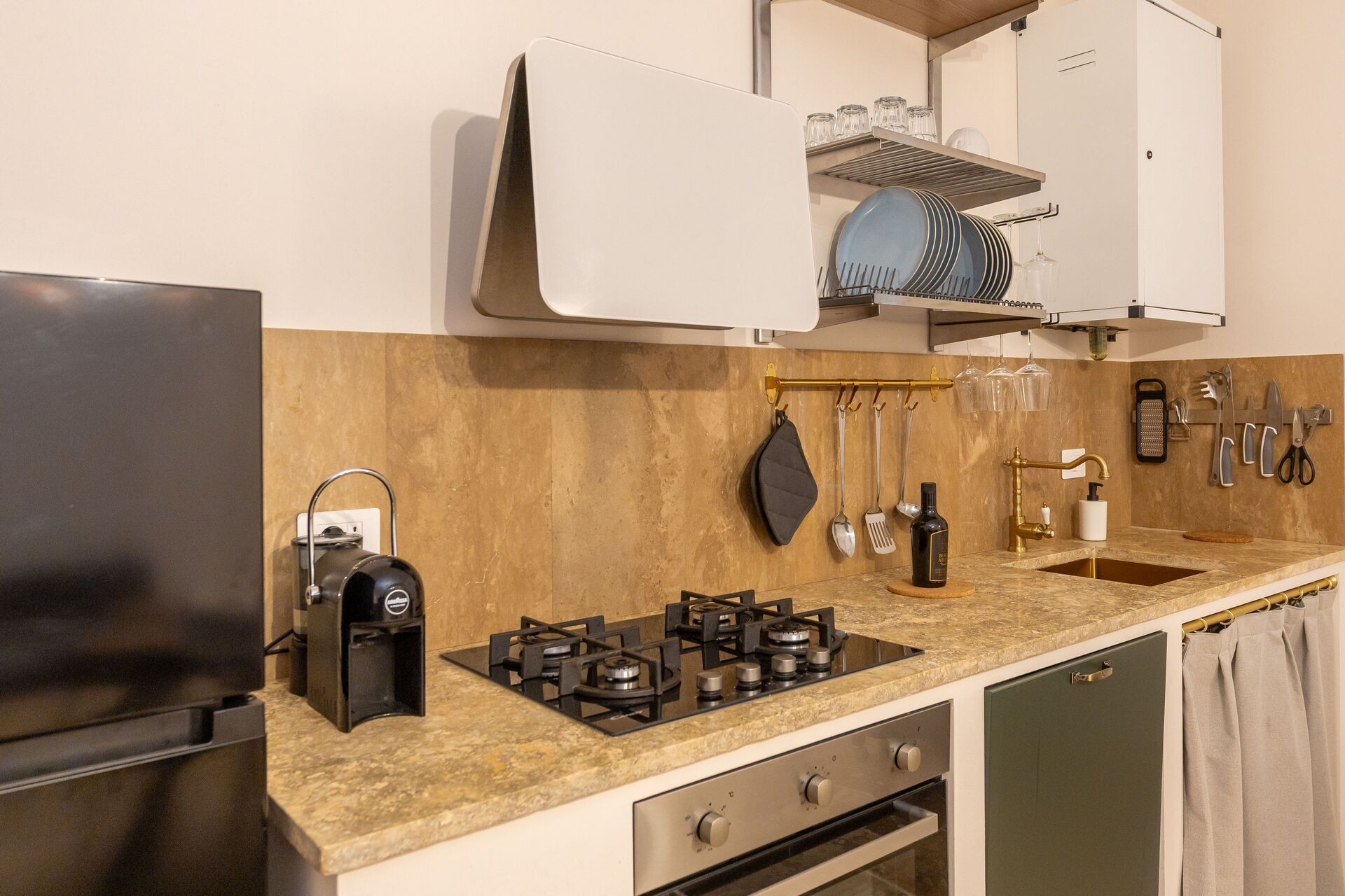 Hævet stueetage: stue (smart-TV, aircondition) med dobbelt sovesofa, spiseområde og tekøkken (opvaskemaskine, ovn, køleskab, espressomaskine, brødrister), dobbelt soveværelse (aircondition), badeværelse med bruser.