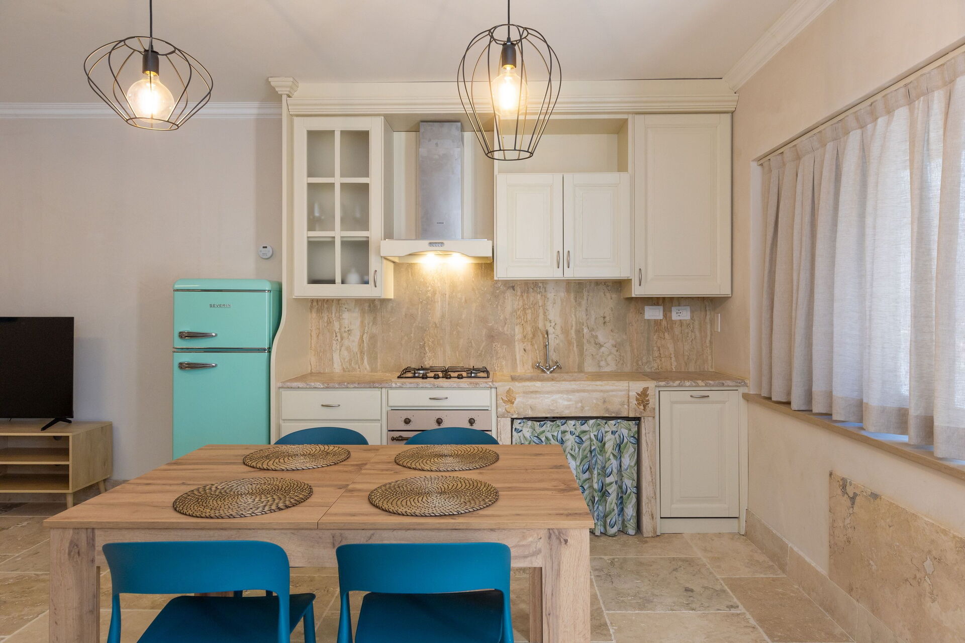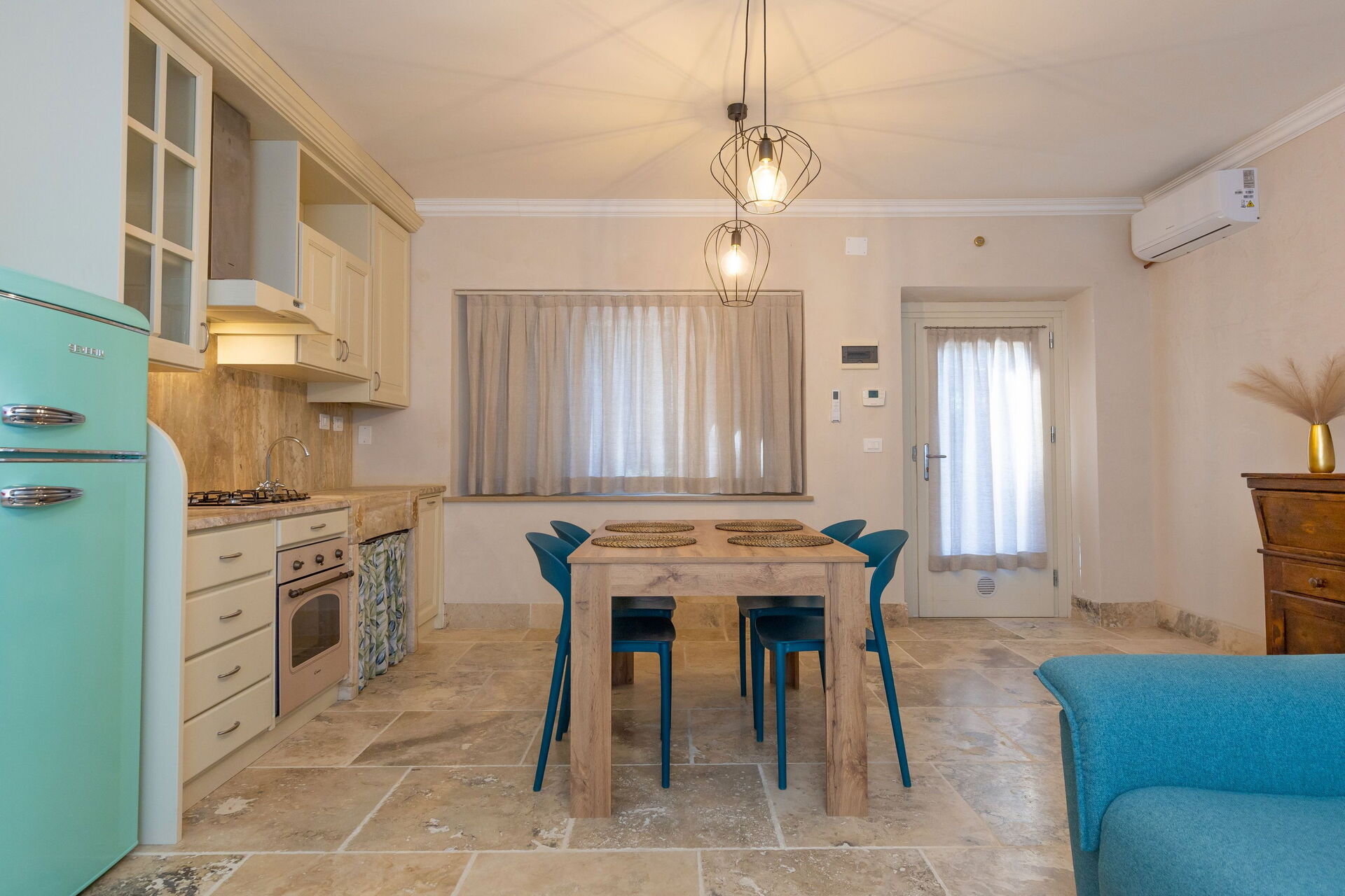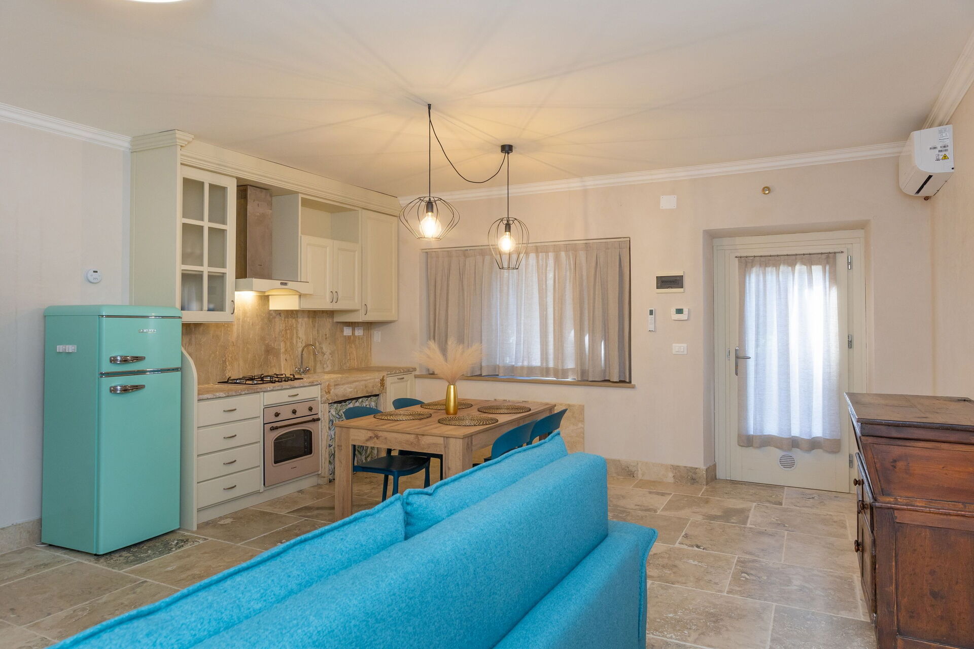 Hævet stueetage: stue (smart-TV, aircondition) med dobbelt sovesofa, spiseområde og tekøkken (opvaskemaskine, ovn, køleskab, espressomaskine, brødrister), dobbeltværelse (aircondition), badeværelse med bruser.