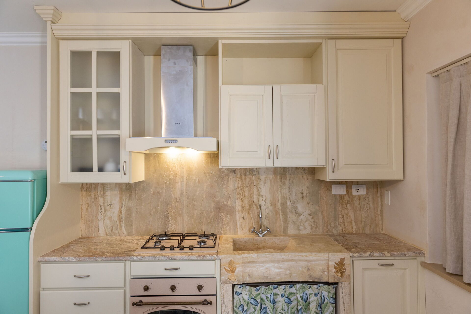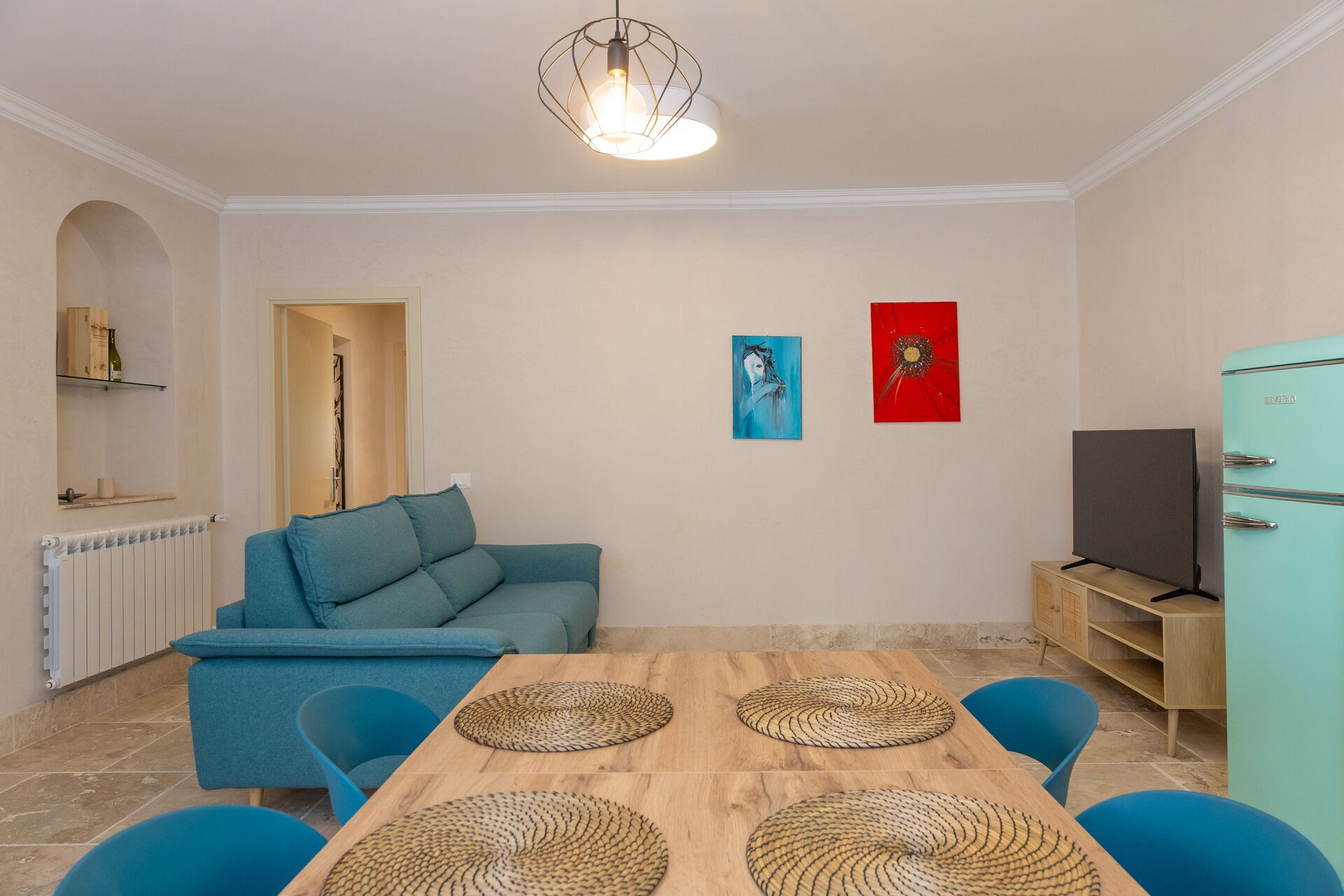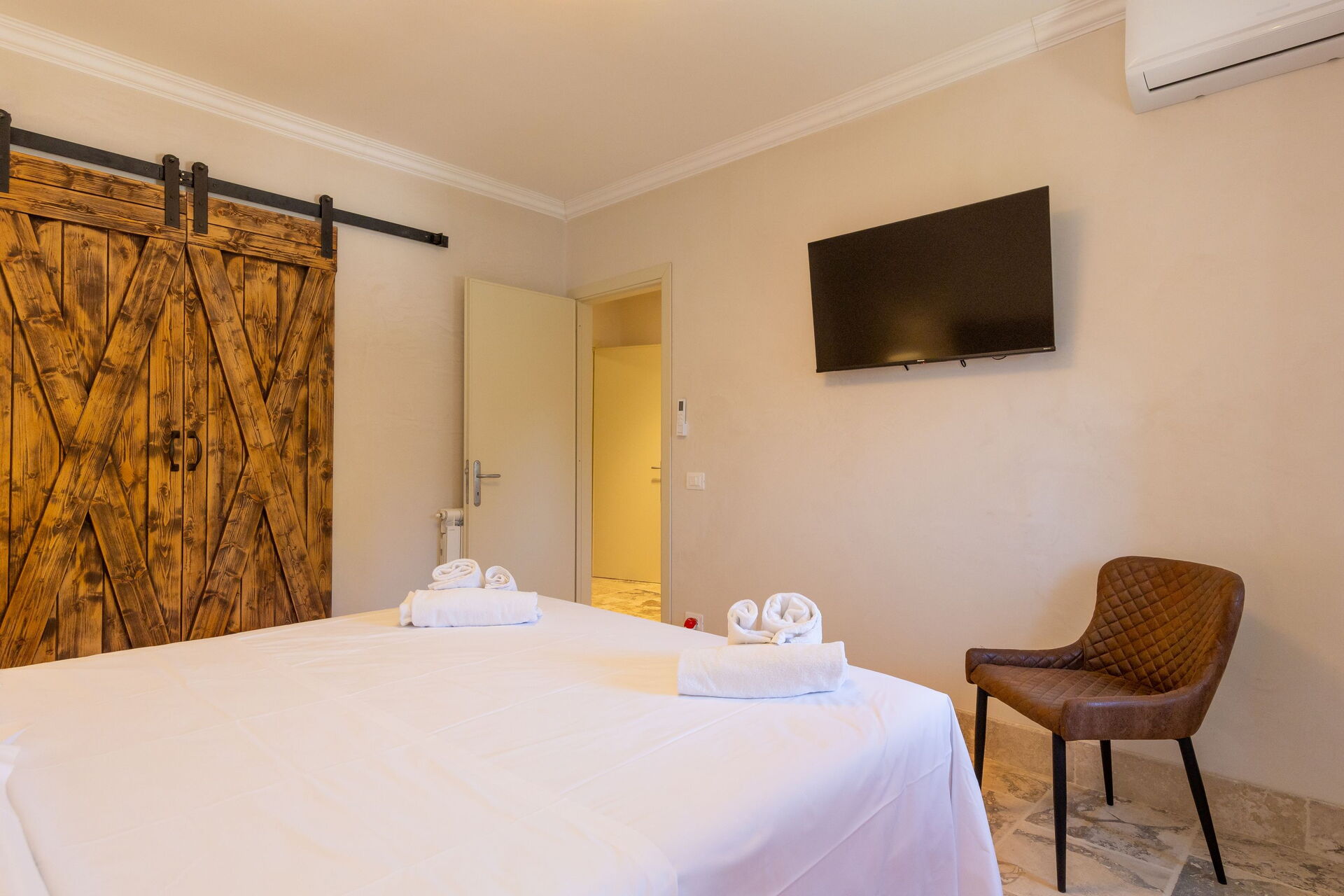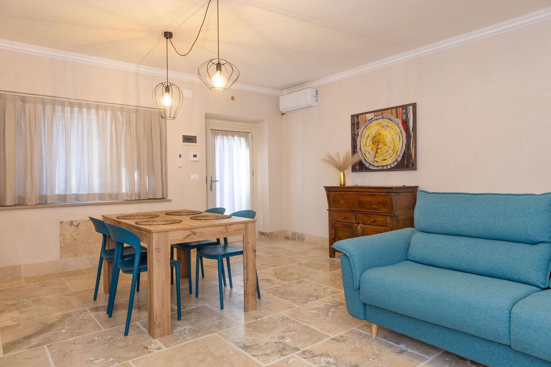 Hævet stueetage: stue (smart-TV, aircondition) med dobbelt sovesofa, spiseområde og tekøkken (opvaskemaskine, ovn, køleskab, espressomaskine, brødrister), dobbeltværelse (aircondition), badeværelse med bruser.