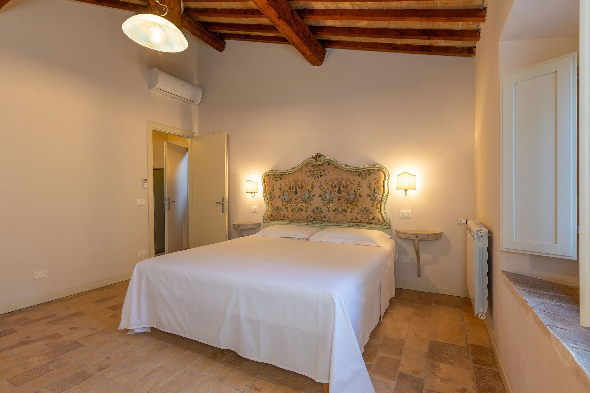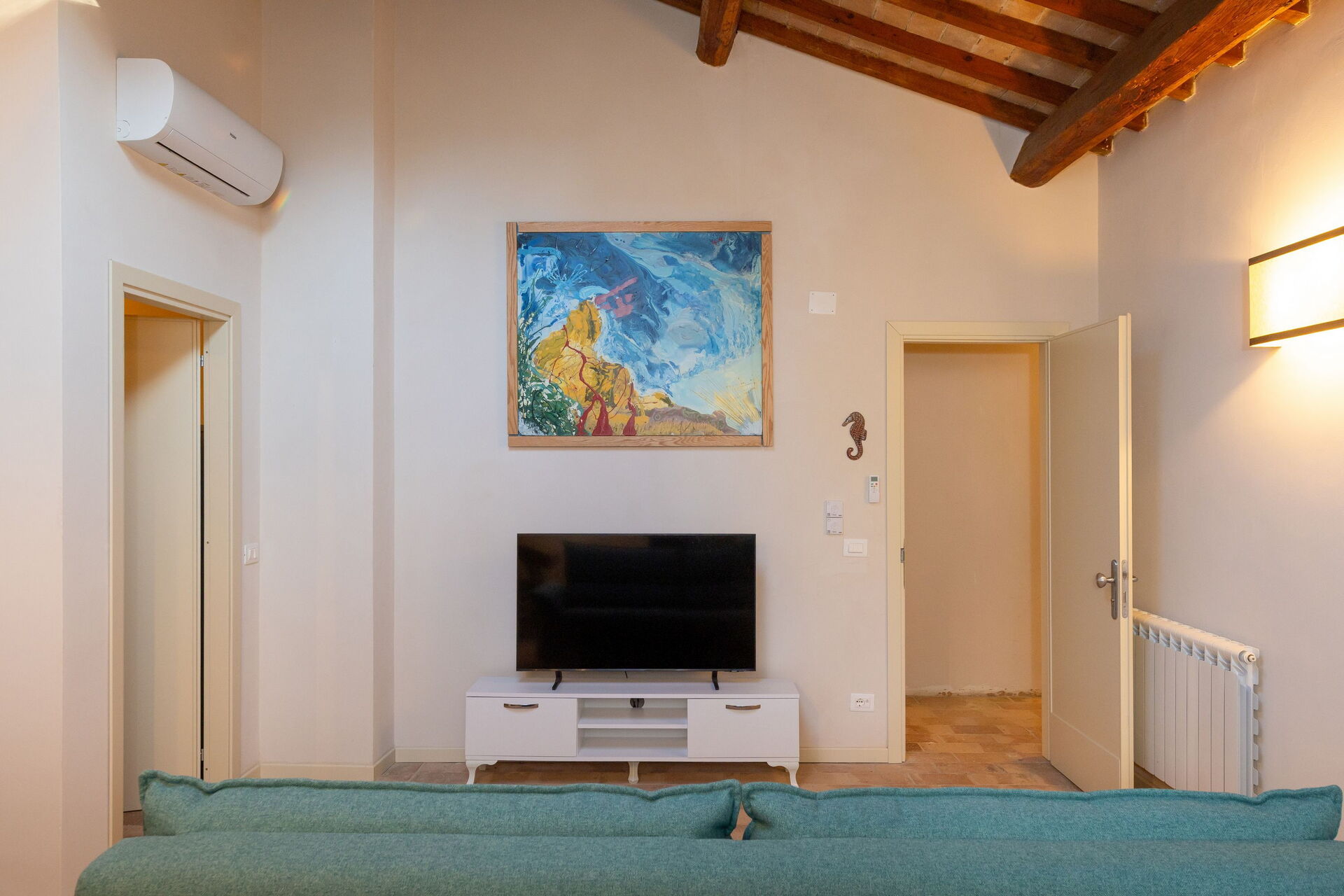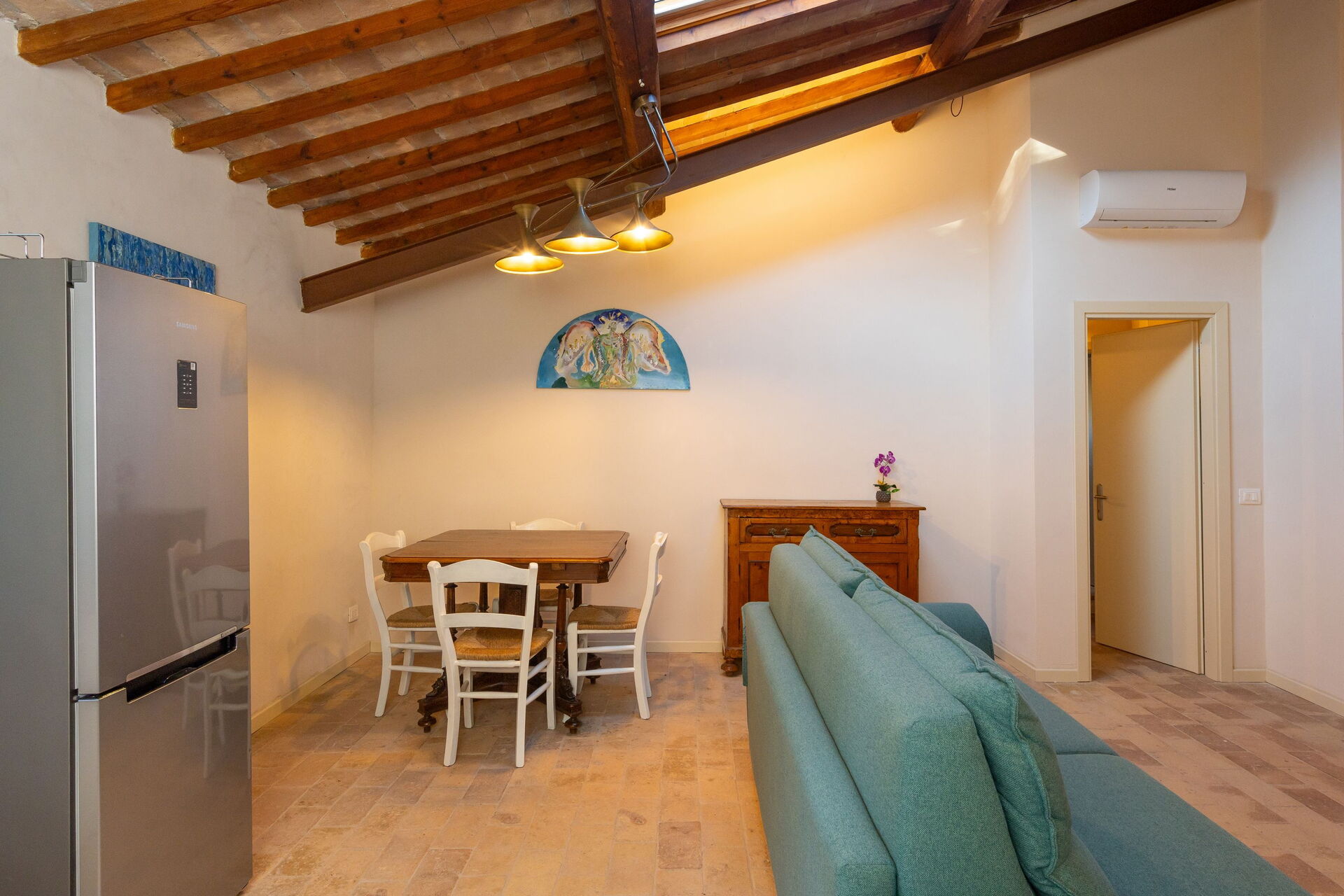 Første sal: stue (smart-tv, aircondition) med dobbelt sovesofa, spiseområde og tekøkken (opvaskemaskine, ovn, køleskab, espressomaskine, brødrister), dobbelt soveværelse (aircondition), badeværelse med bruser.