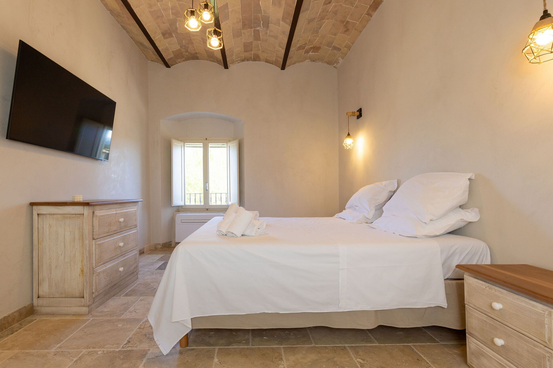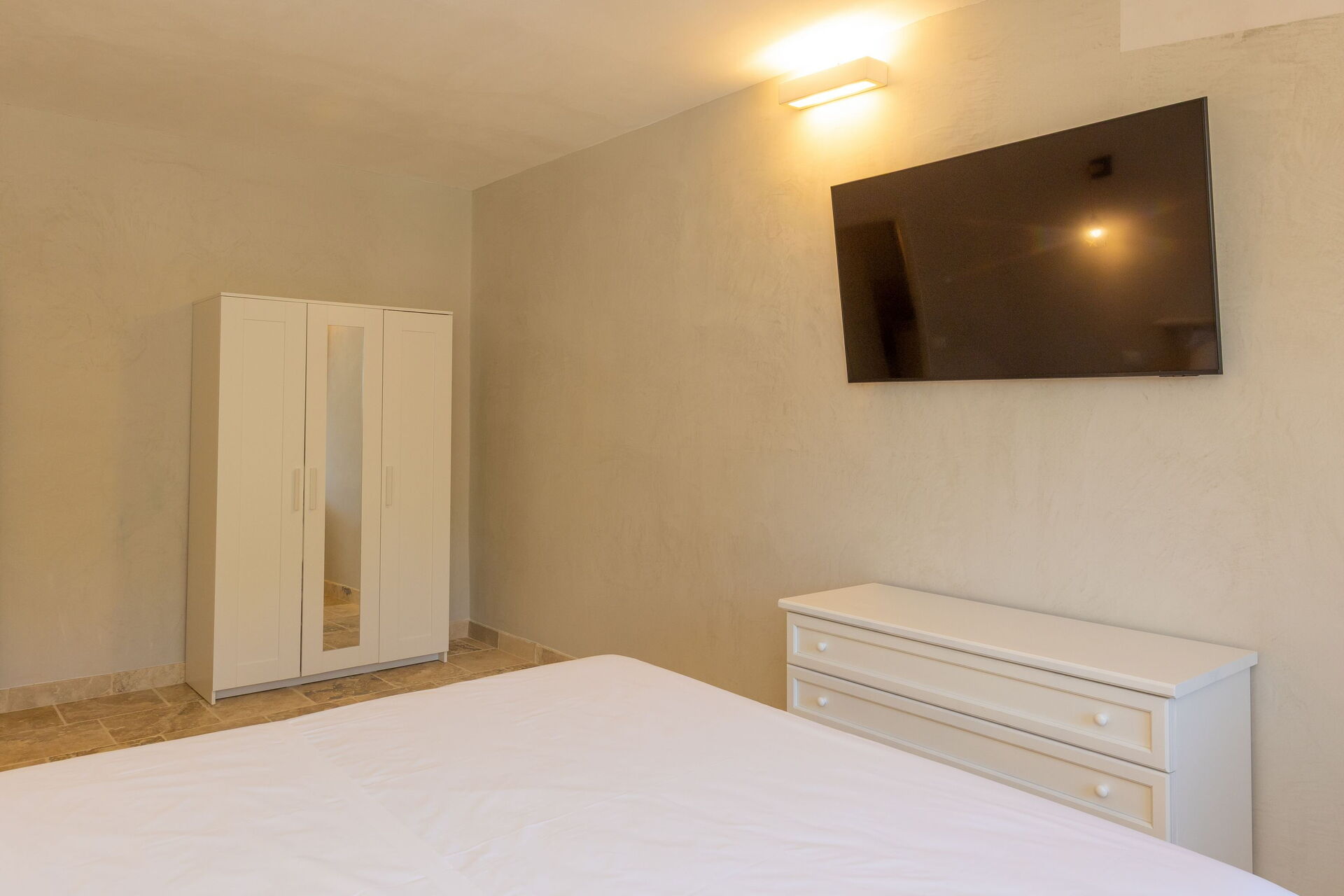 Hævet stueetage: stue (smart-TV, aircondition) med sovesofa til to, spiseområde og tekøkken (opvaskemaskine, ovn, køleskab, espressomaskine, brødrister), 2 dobbeltværelser (hver med aircondition), badeværelse med bruser.