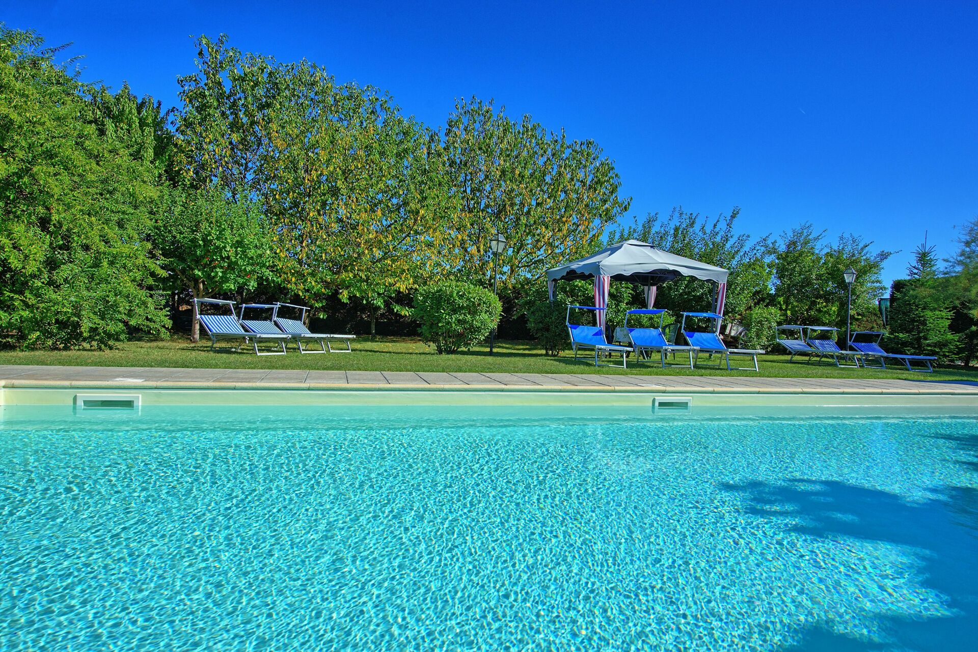 The pool offers a welcome refreshment with sun loungers laid out in a well-maintained yet natural garden.