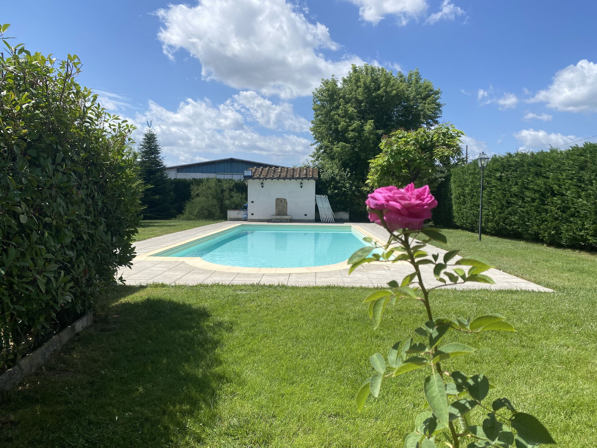 Swimmingpoolen er omgivet af en stor hæk, der fungerer som et hegn så der er ingen indsigt.