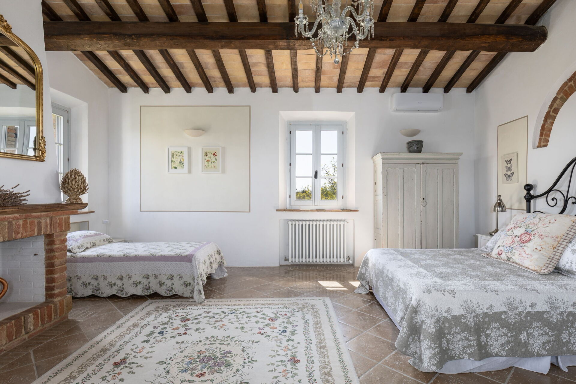 Første sal (tilgængelig fra stueetagen i huset samt fra ydersiden via en trappe): dobbeltværelse (aircondition) med privat badeværelse med bruser og adgang til en stor privat overdækket terrasse, dobbeltværelse (aircondition) med udendørs adgang, badeværelse med bruser, stort soveværelse (aircondition) med dobbeltseng og 2 enkeltsenge (pejs ikke brugbar).