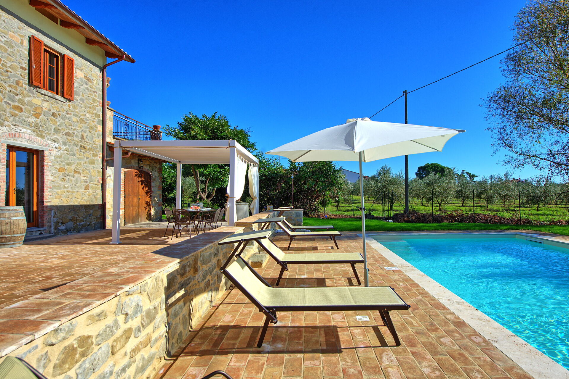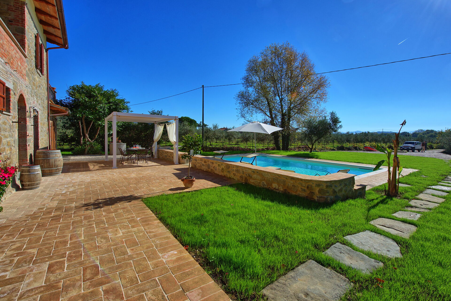 Huset er nyligt renoveret og omdannet til et indbydende feriehus med 3 soveværelser som let kan rumme op til 6/7 personer. På grunden er der en pæn pool og en velplejet have, som står fuldt til gæsternes rådighed. På terrassen mellem huset og poolen er der en helt ny pergola – det perfekte sted at nyde frokost eller middag under åben himmel.