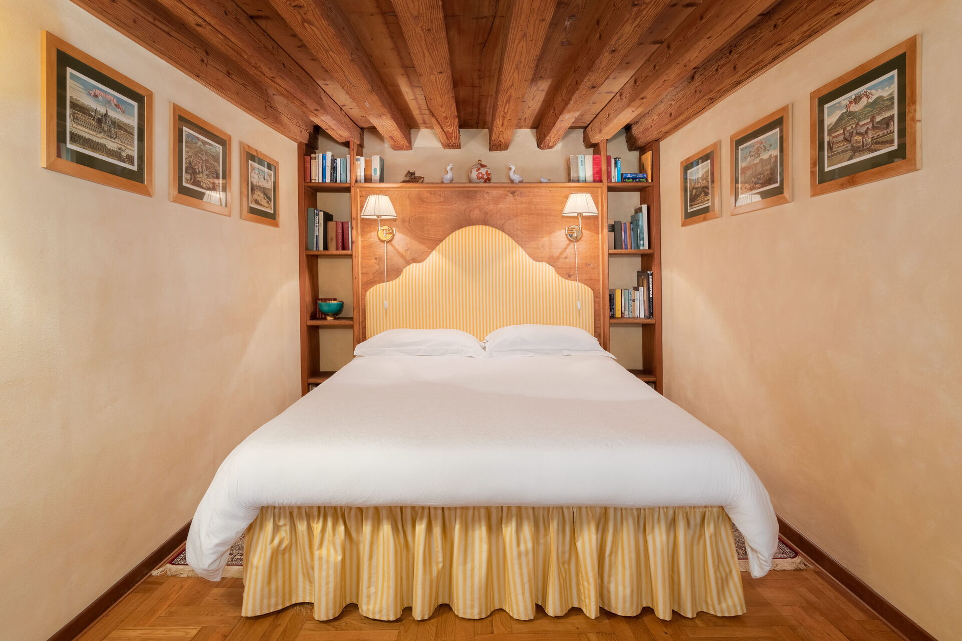 I slutningen af gangen langs håndlavede træbalkon, 3 døre fører til de andre værelser. Den 1. er et dobbeltværelse med en queensize seng, skrivebord, tre stole og to kommoder. Ved passering av walk-through closet leveres med indbyggede skab, er der eget badeværelse (badekar / fast brusehoved).