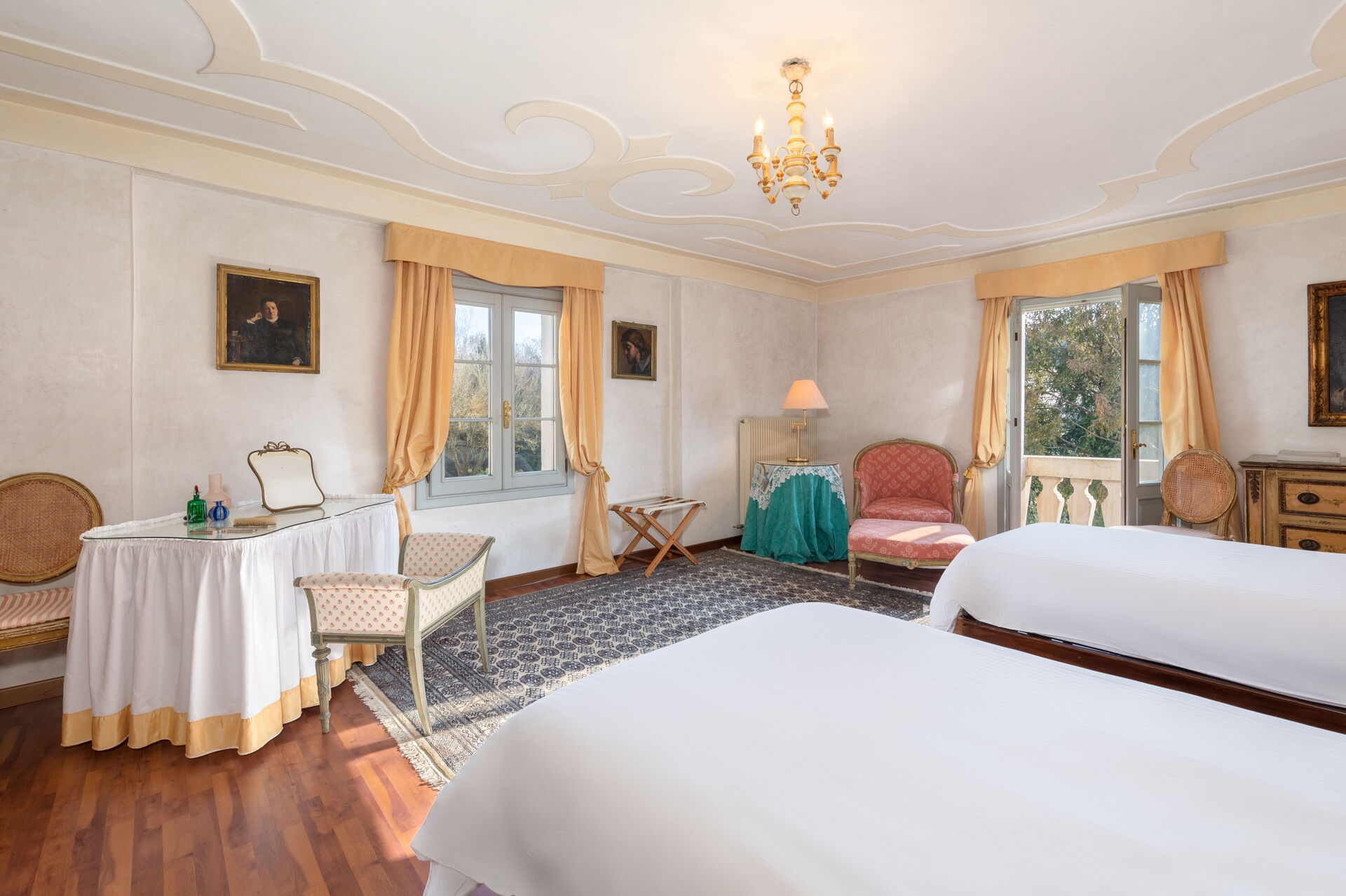 På venstre side af gangen suite med soveværelse med en queensize seng, eget badeværelse (badekar / fast bruser hoved) og private stue med sofa, skrive-skrivebord og garderobe. Hele suiten har tagbjælker i loftet og vinduerne har udsigt fra en veranda i villaens fløj.