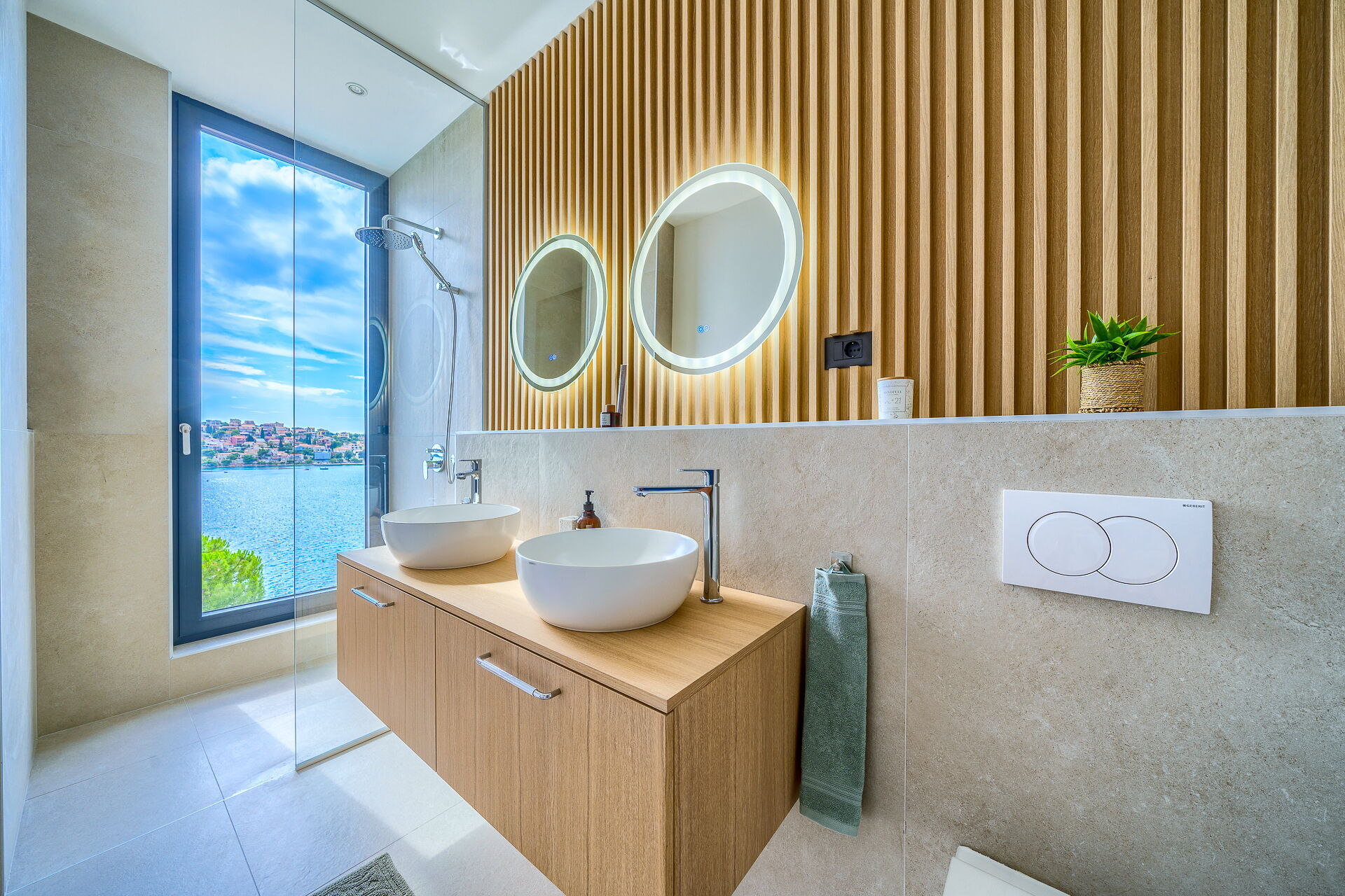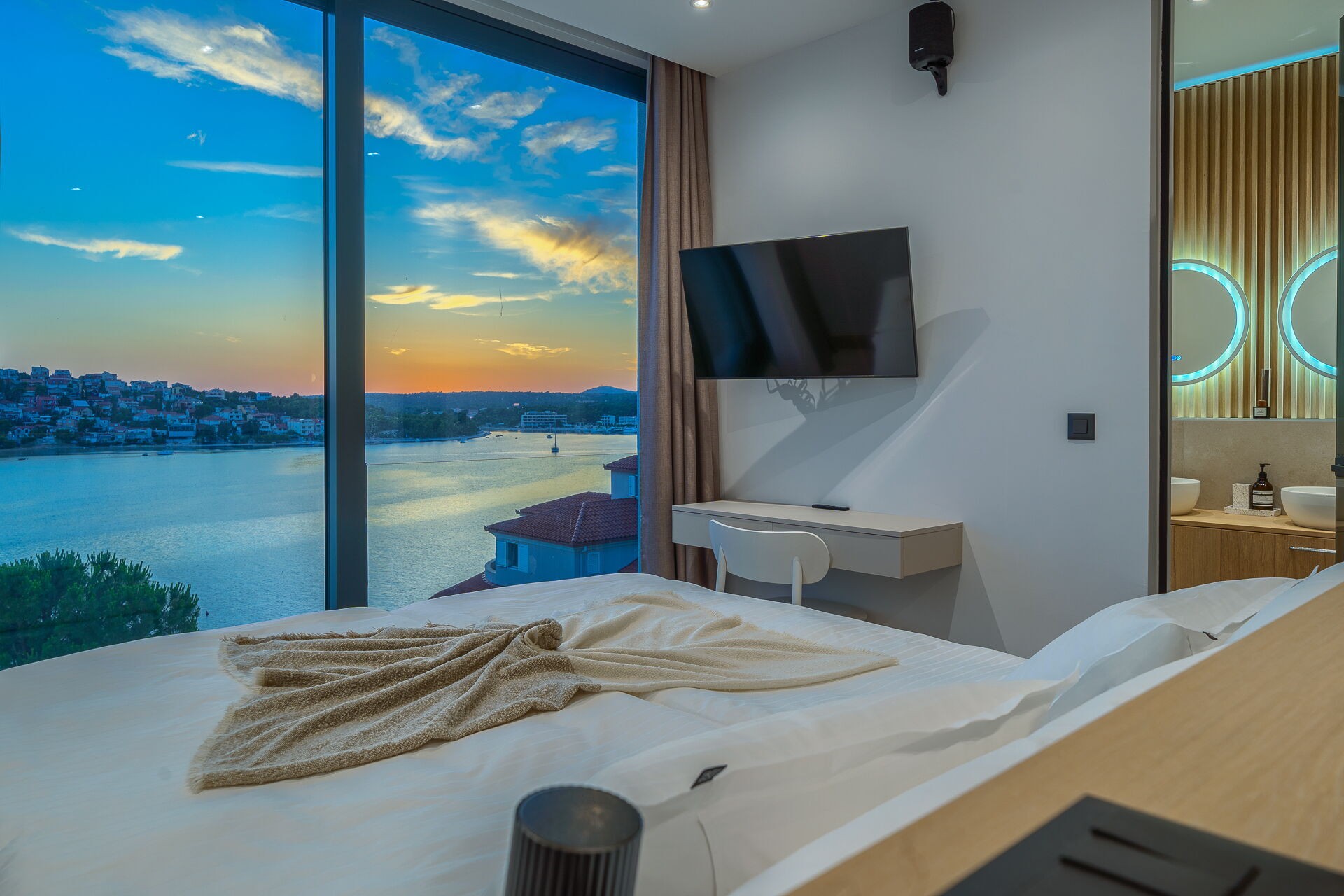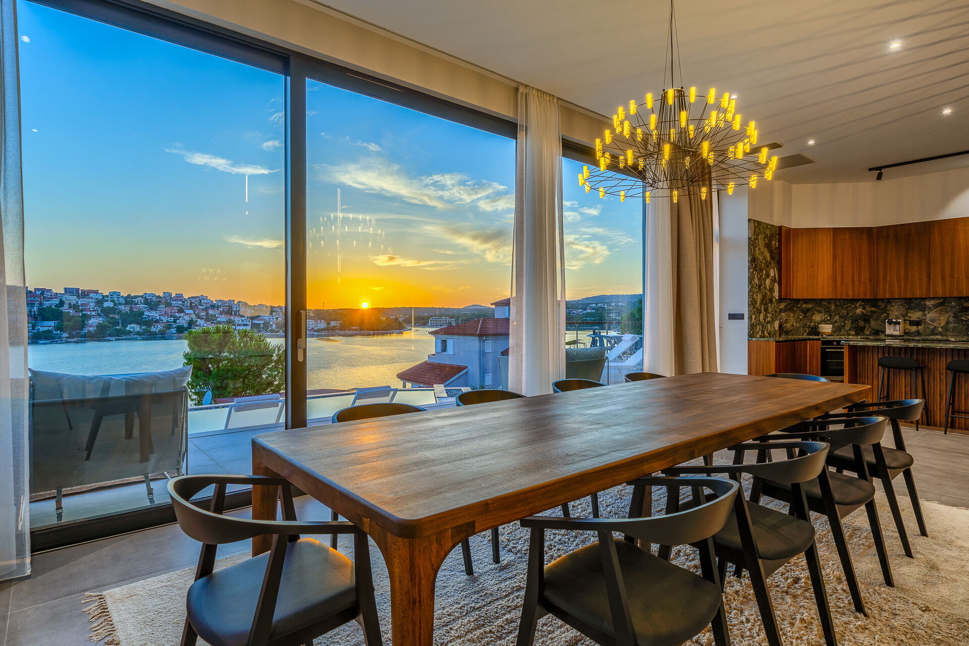 På første sal i dette to-etagers hus er der en vidunderlig solterrasse med en elegant opvarmet pool. Derfra kan du nyde en fortryllende solnedgang over havet.