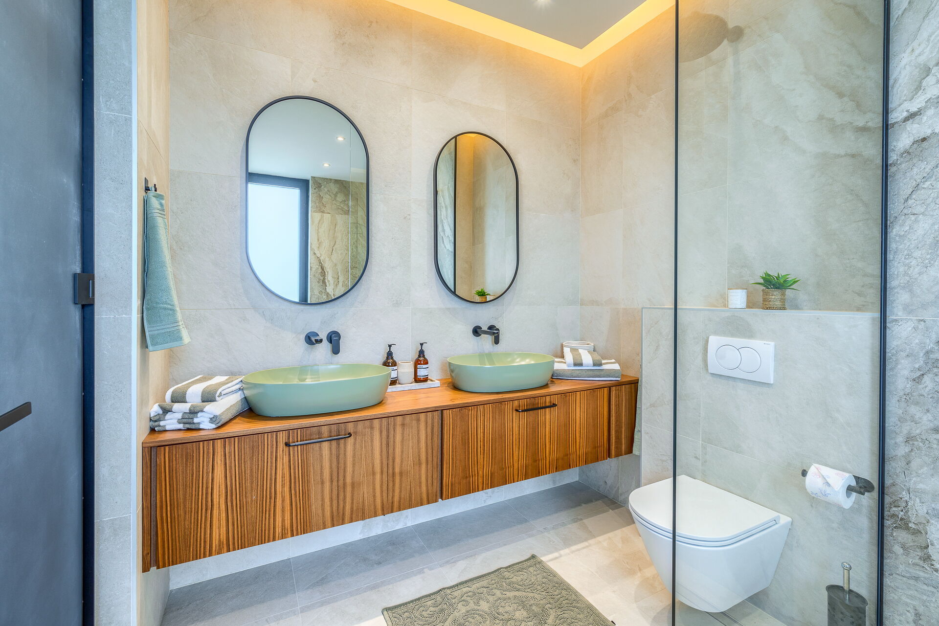 Villaen har 5 soveværelser og 5 badeværelser (4 med bruser og 1 med badekar + bruser):