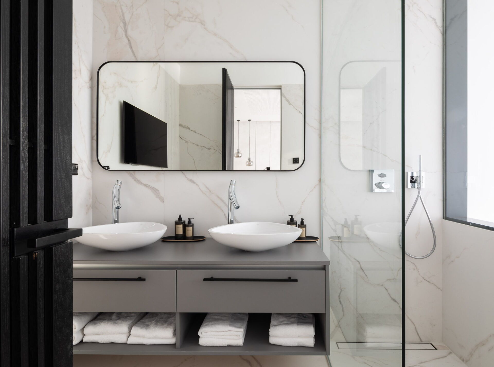 I villaen er der 3 soveværelser og 4 badeværelser: