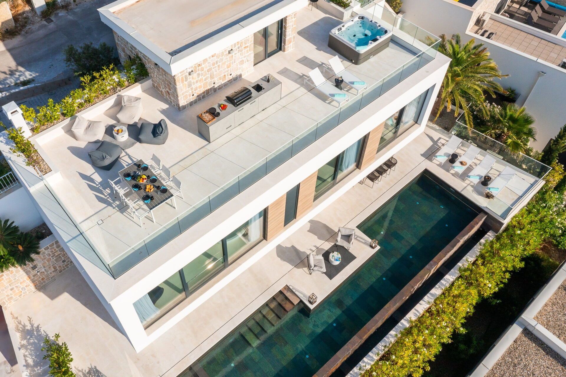 - tagterrasse indrettet til udendørs spisning med udendørs køkken, grill og boblebad