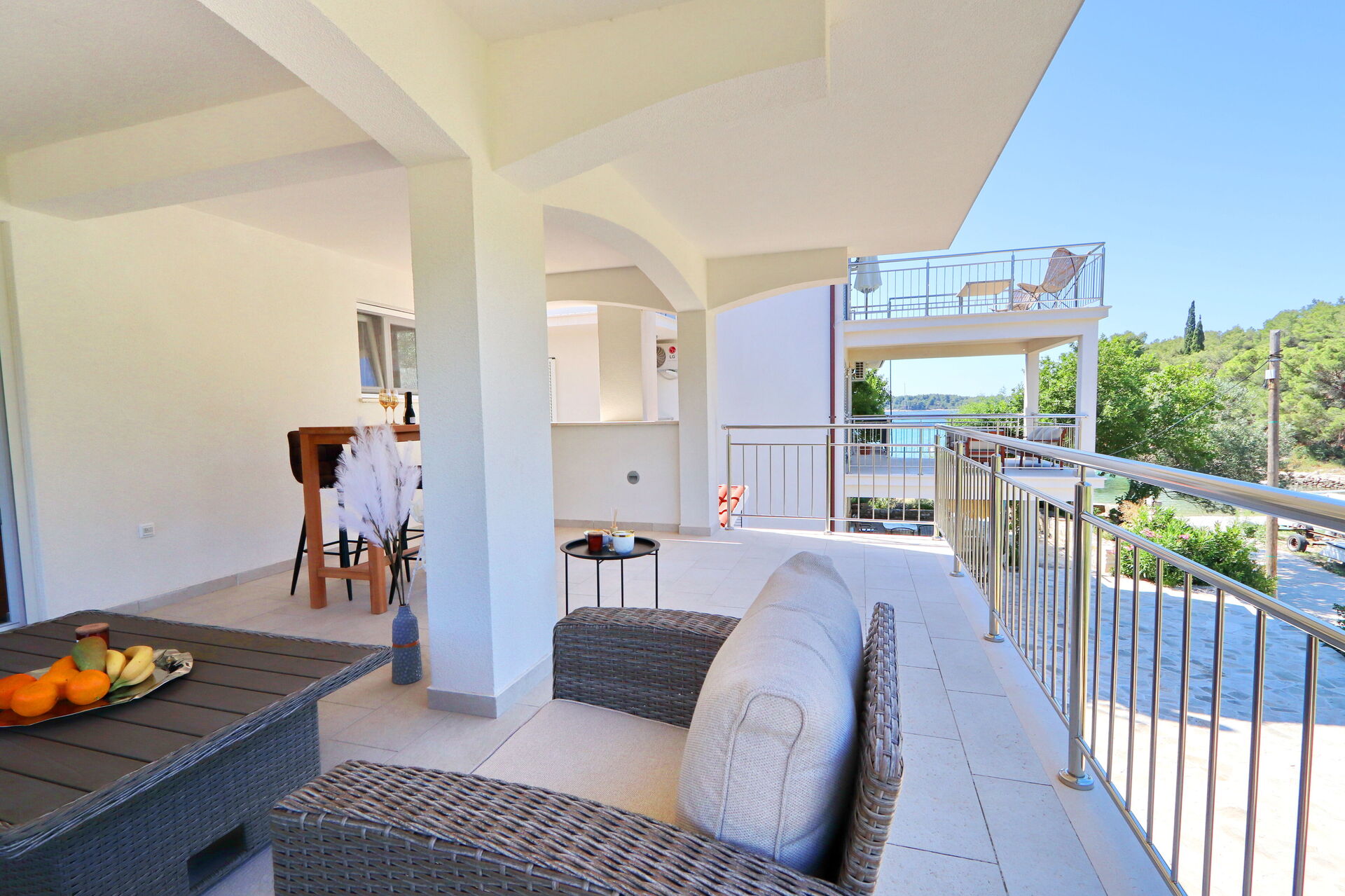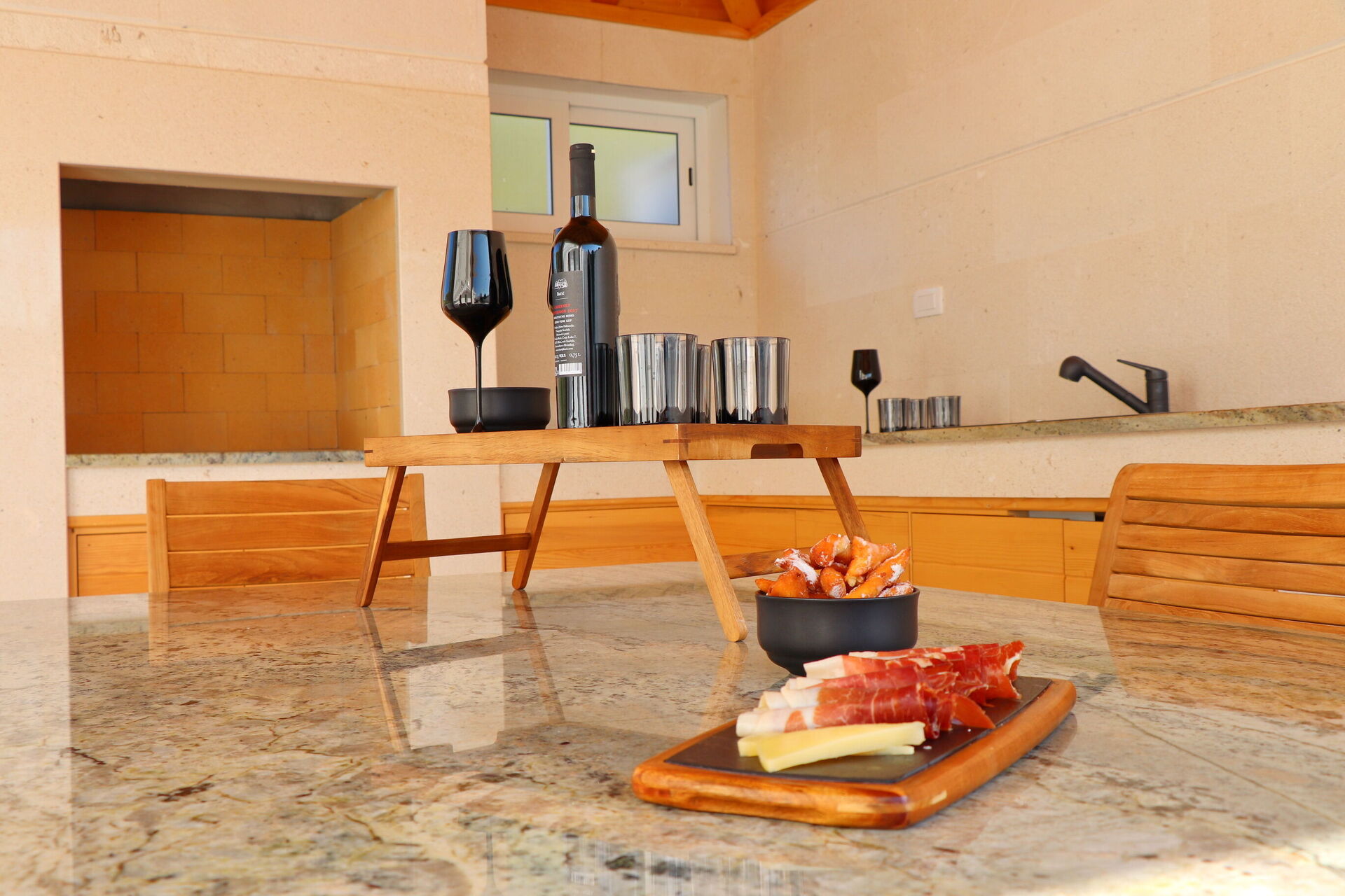 Udenfor, i poolområdet, er der en rummelig overdækket veranda med et udendørs køkken, der har en indbygget grill og en vask. Her kan alle husets gæster samles for at spise og slappe af sammen.