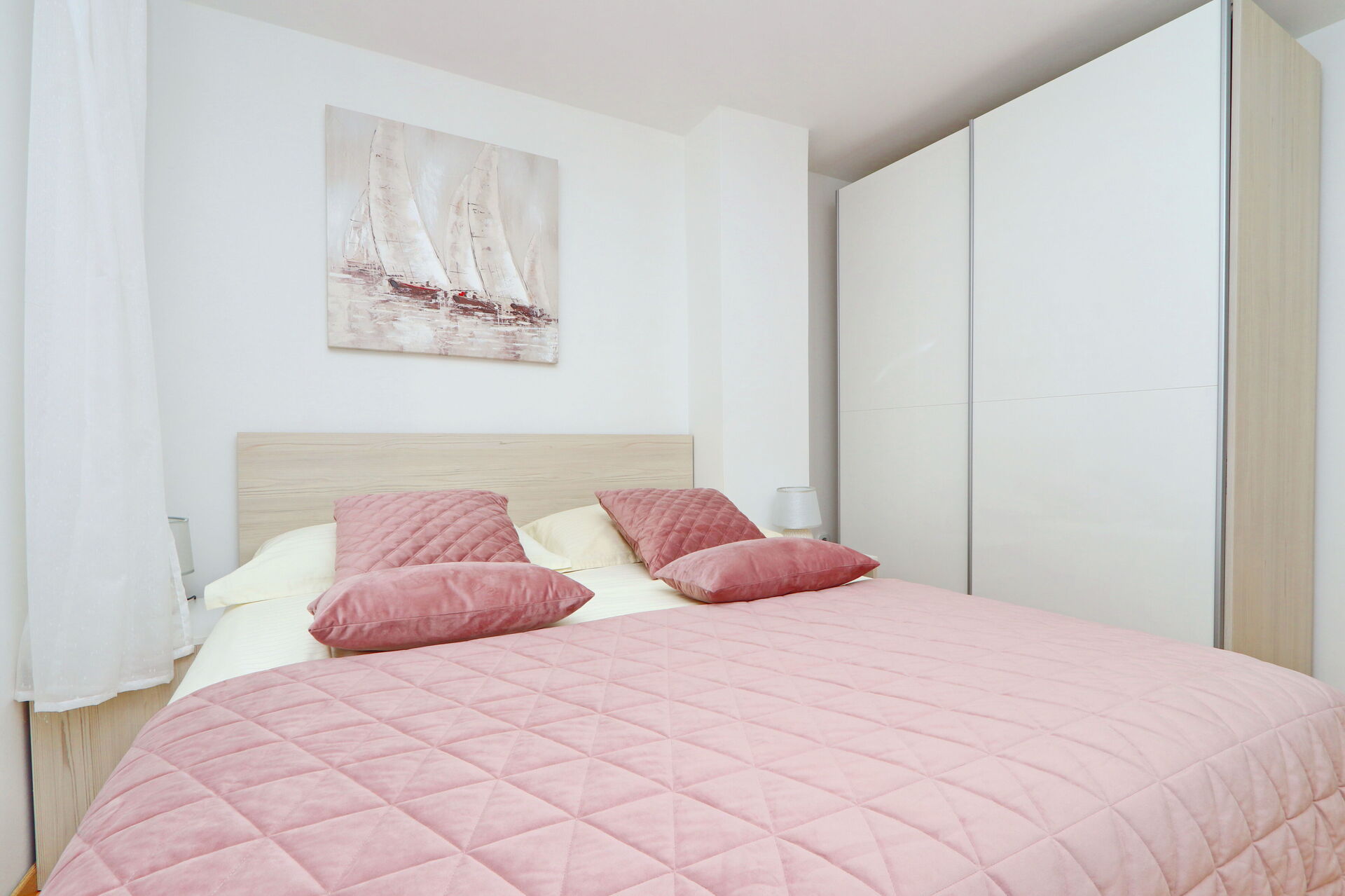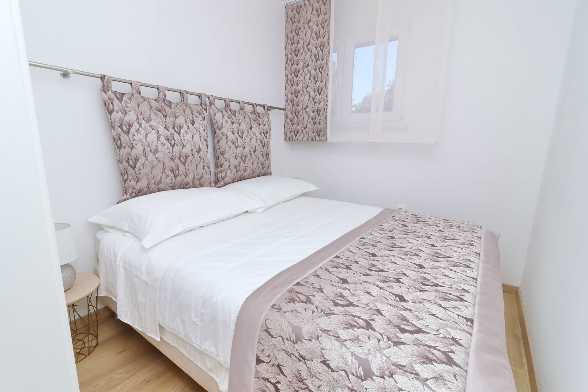 Indgang til stue og køkken, 2 dobbeltværelser, badeværelse med bruser.