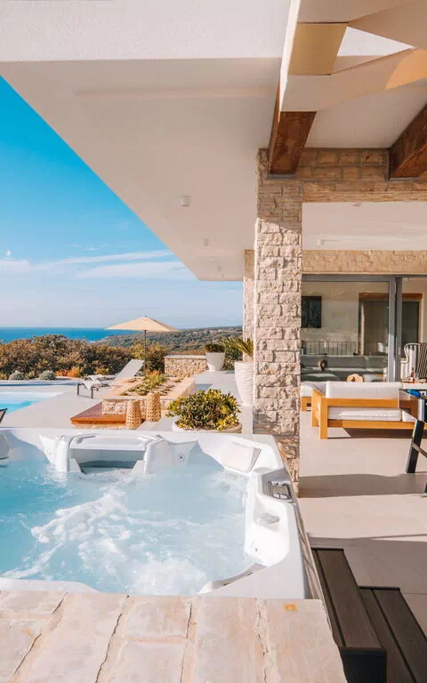 Villa Steropa har en fantastisk udsigt over havet og det omkringliggende landskab. Poolområdet med solsenge er perfekt til at nyde solen, og den udendørs boblebad er ideel til aftenerne.