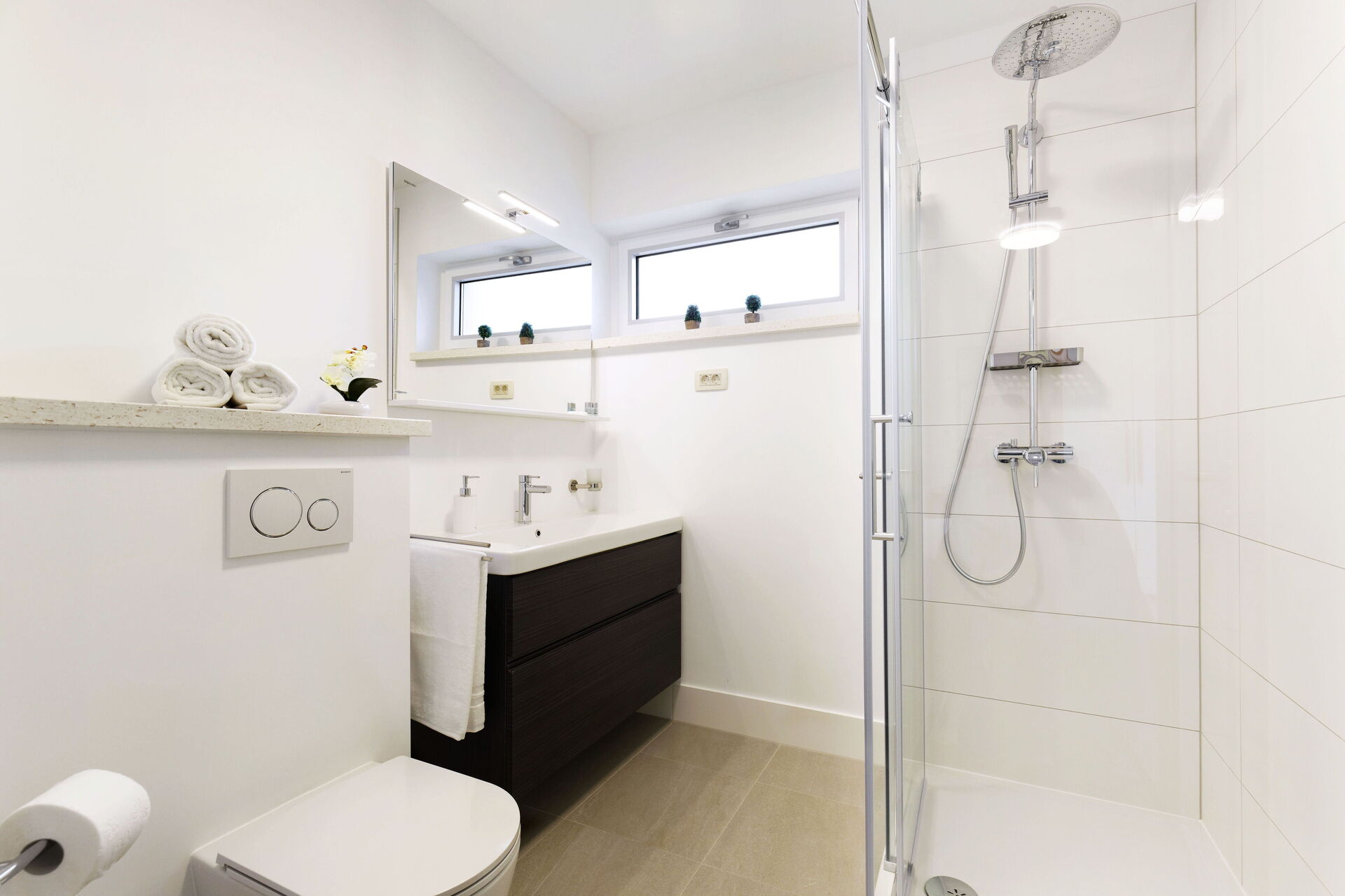 3 dobbeltværelser med separate badeværelser med bruser. Alle soveværelser har adgang til en balkon, der løber langs hele husets side.