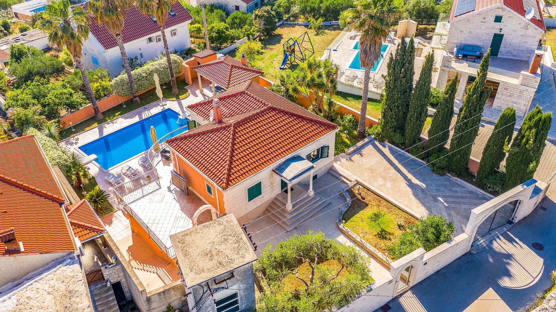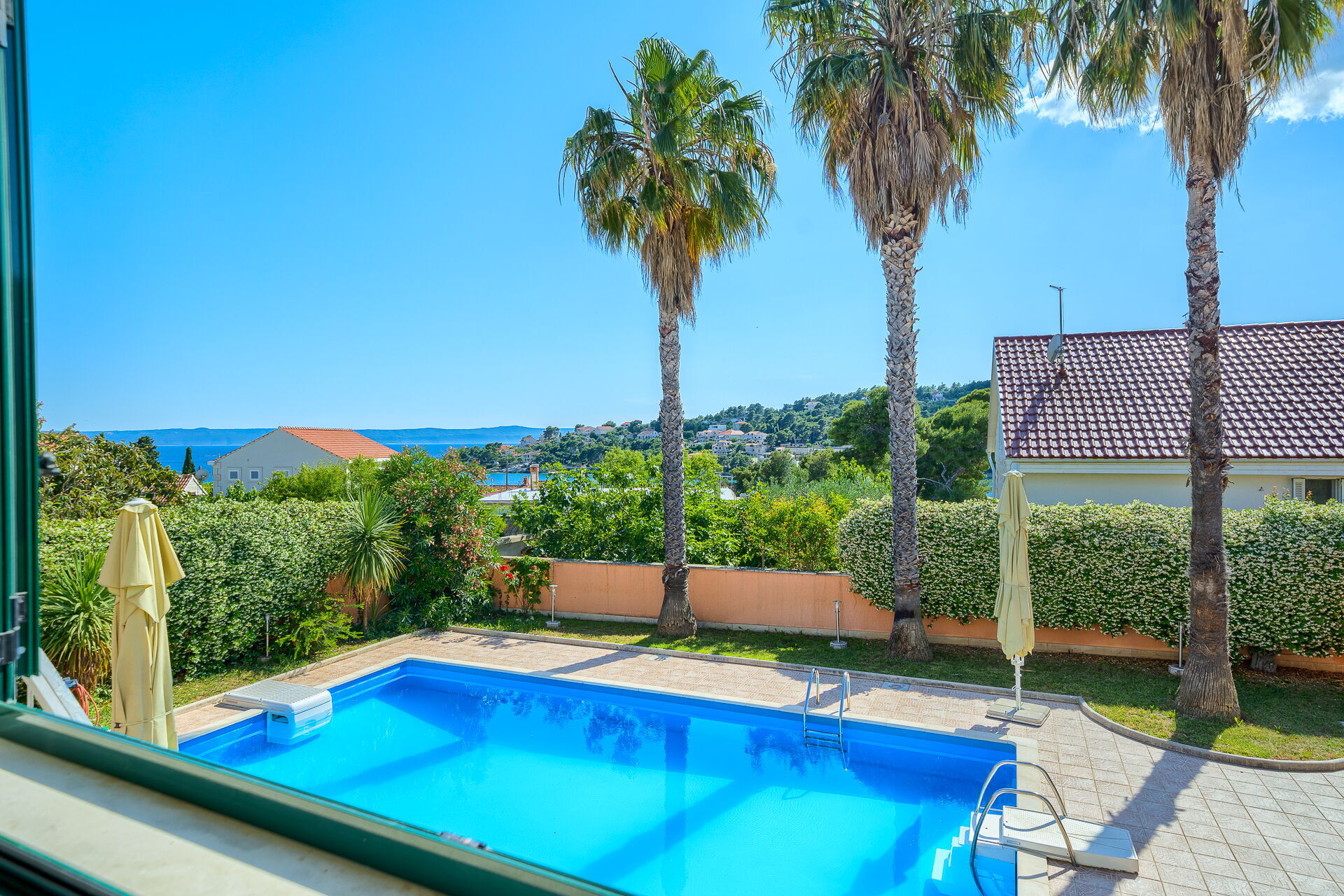 I det udendørs område er der en frodig have med palmer og andre planter, der er typisk for øen Brac. En solterrasse med parasoller og liggestole omgiver den smukke private pool. Her kan du slappe af og køle af med venner eller familie. Der er også en overdækket terrasse med spiseplads og en dejlig grill, hvor du kan nyde lækre måltider udendørs.