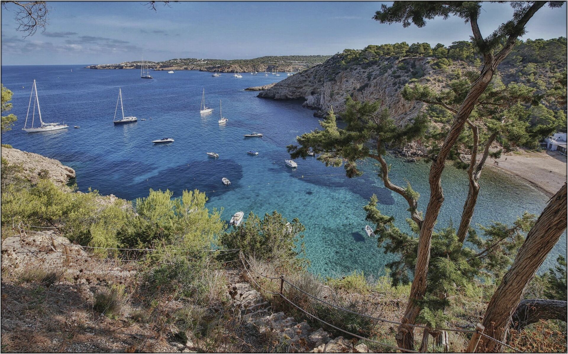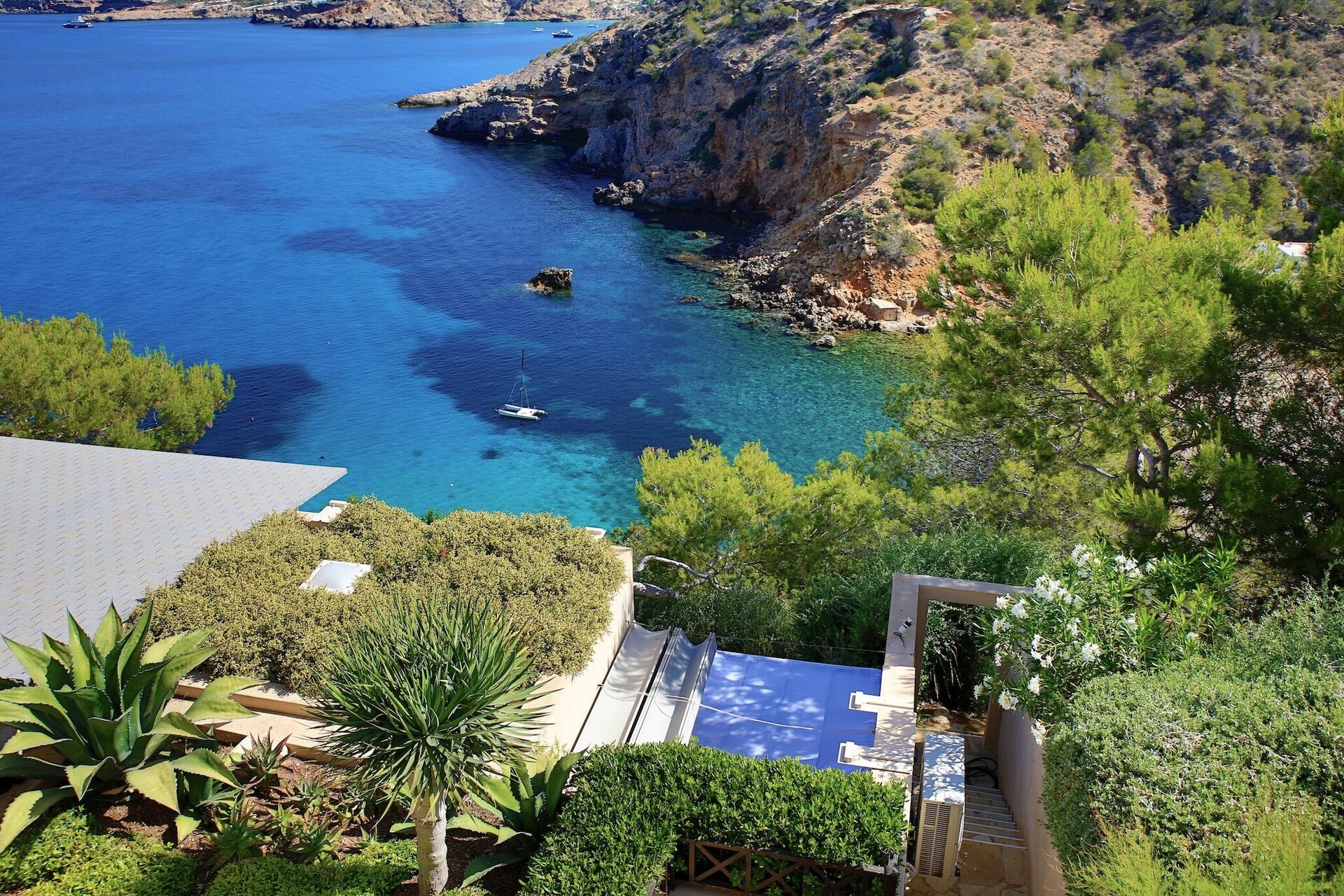 Efter en stentrappe udskåret i klippen har gæsterne direkte adgang til en lille privat bugt: det ideelle sted at opleve Ibizas sol og krystalklart vand!