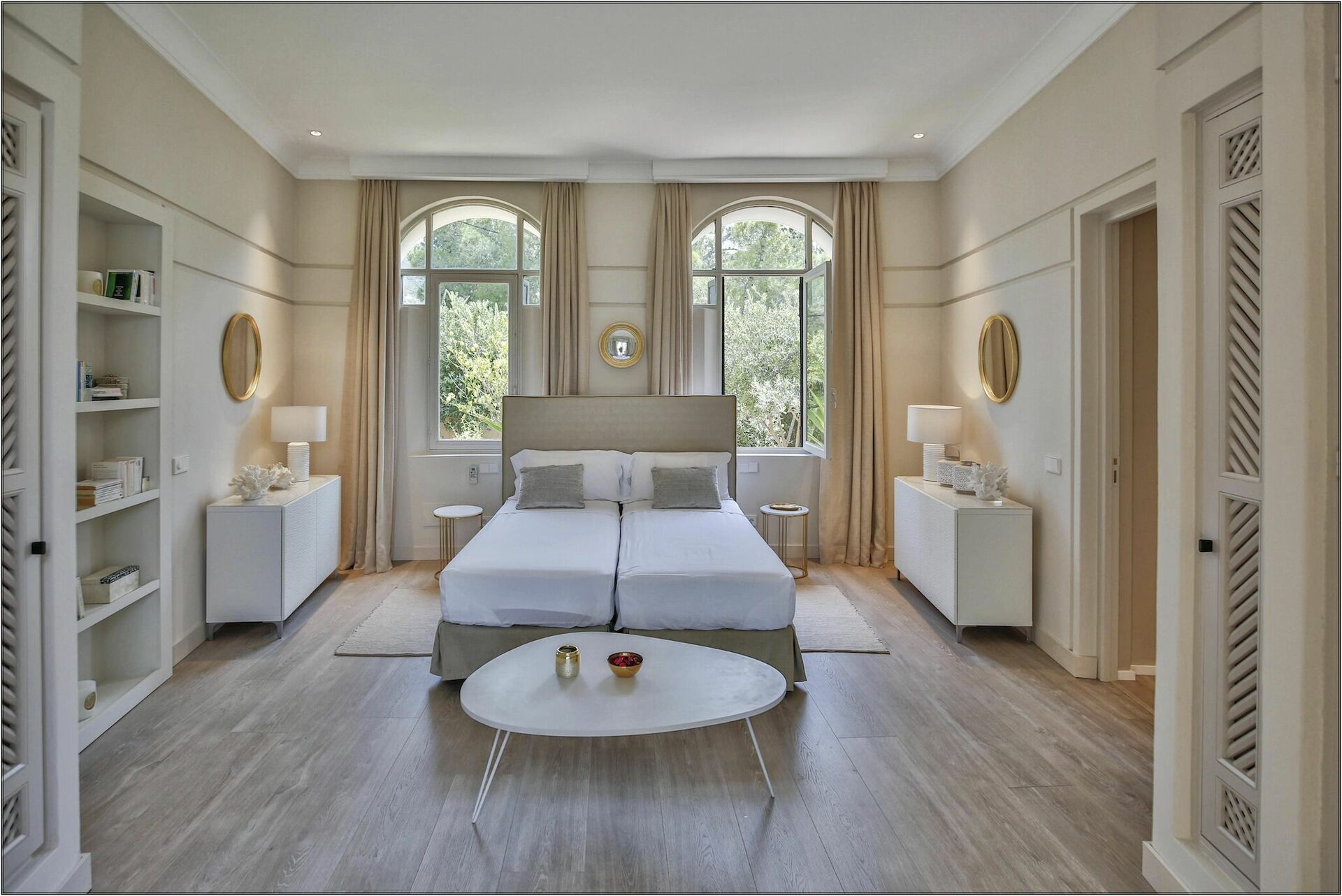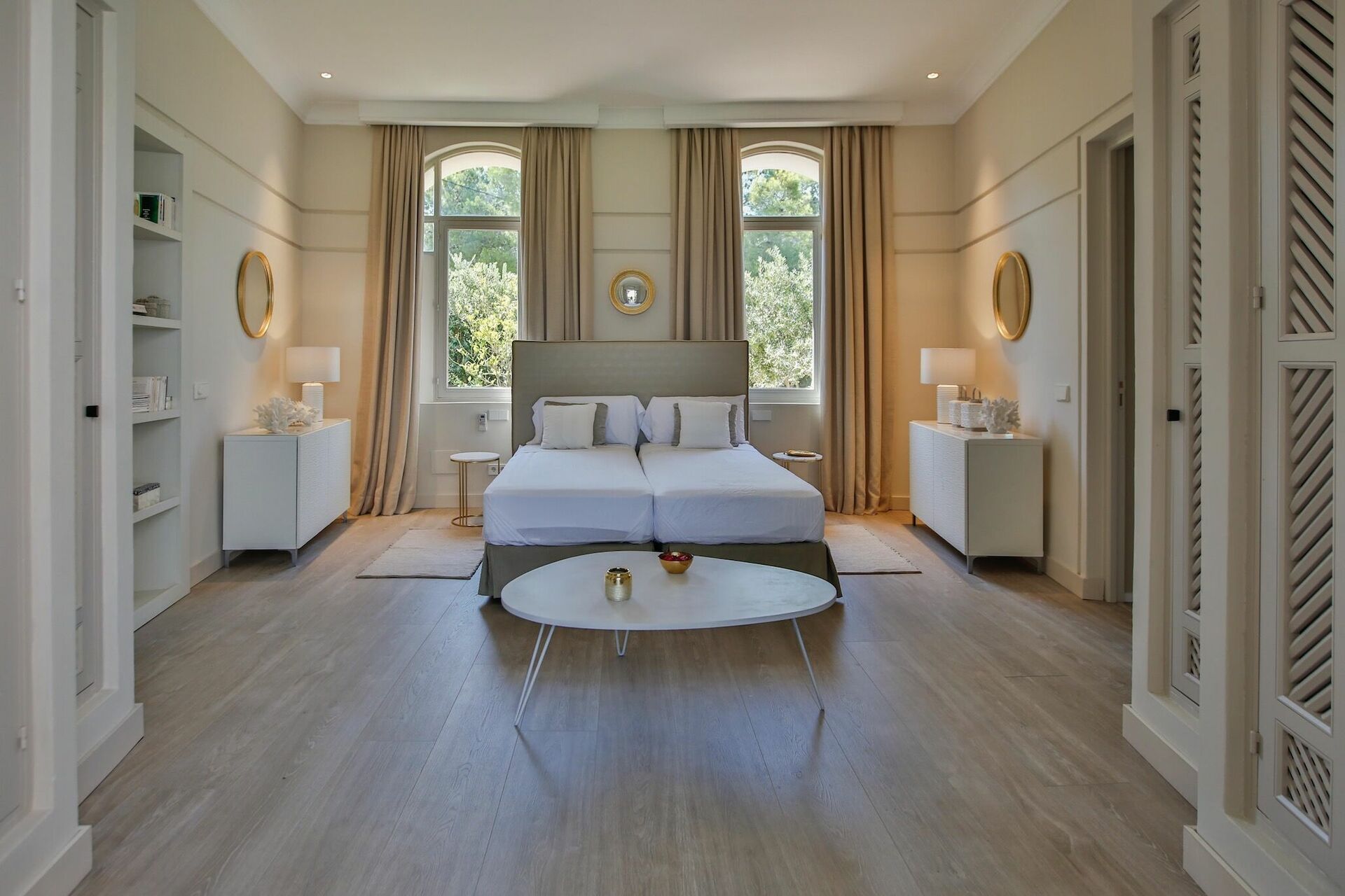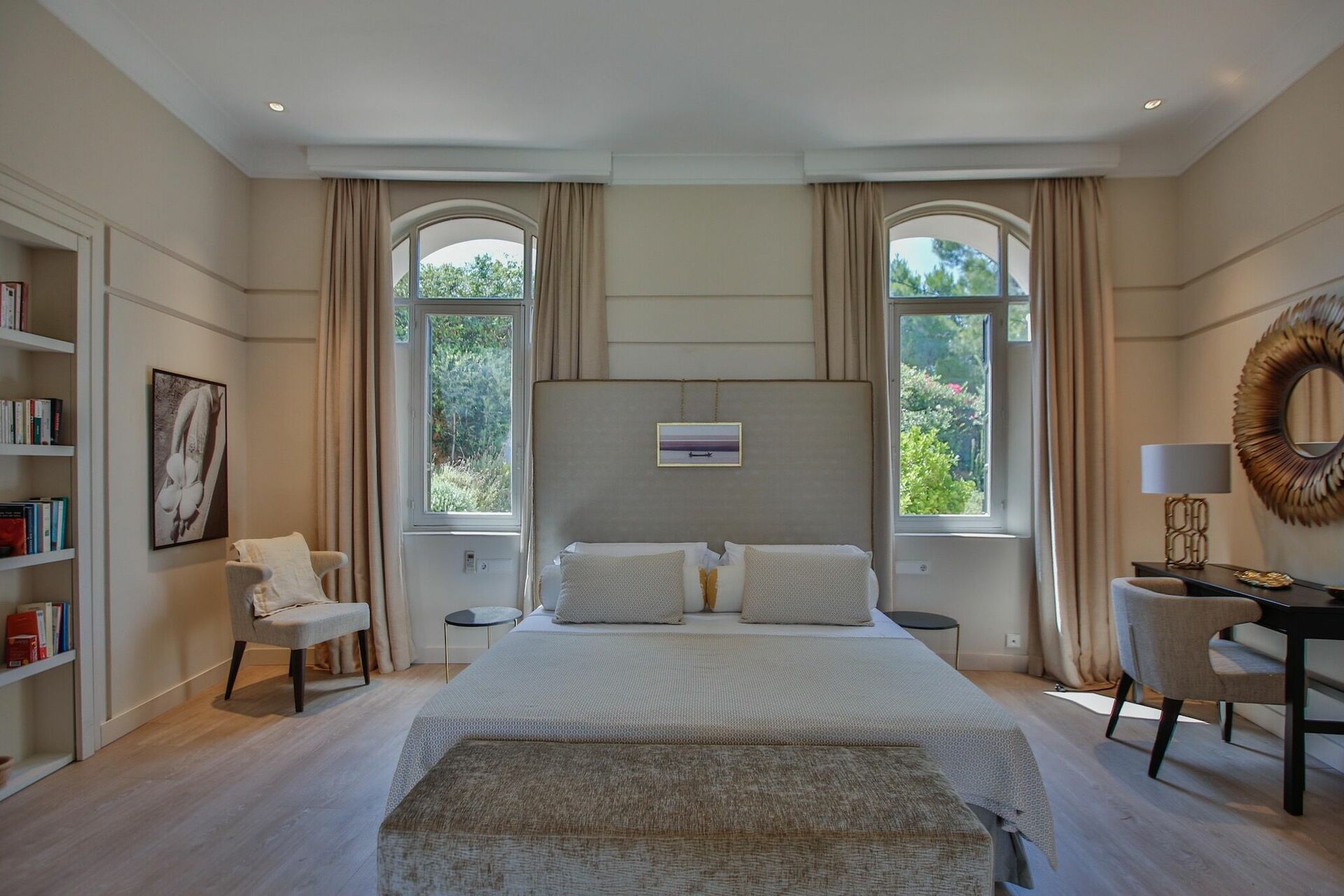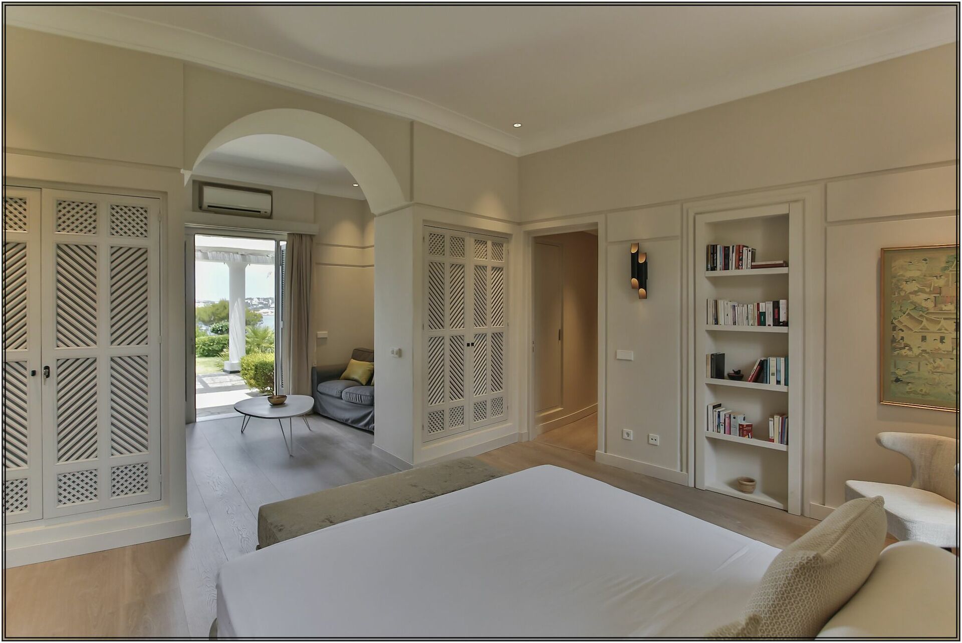 1 Master suite med king-size seng, opholdsstue, adgang til terrasse og stort privat badeværelse med badekar og bruser.