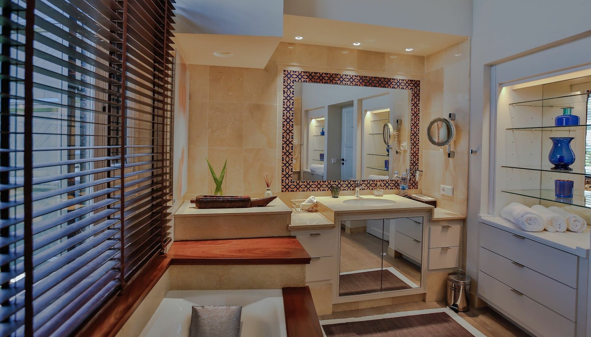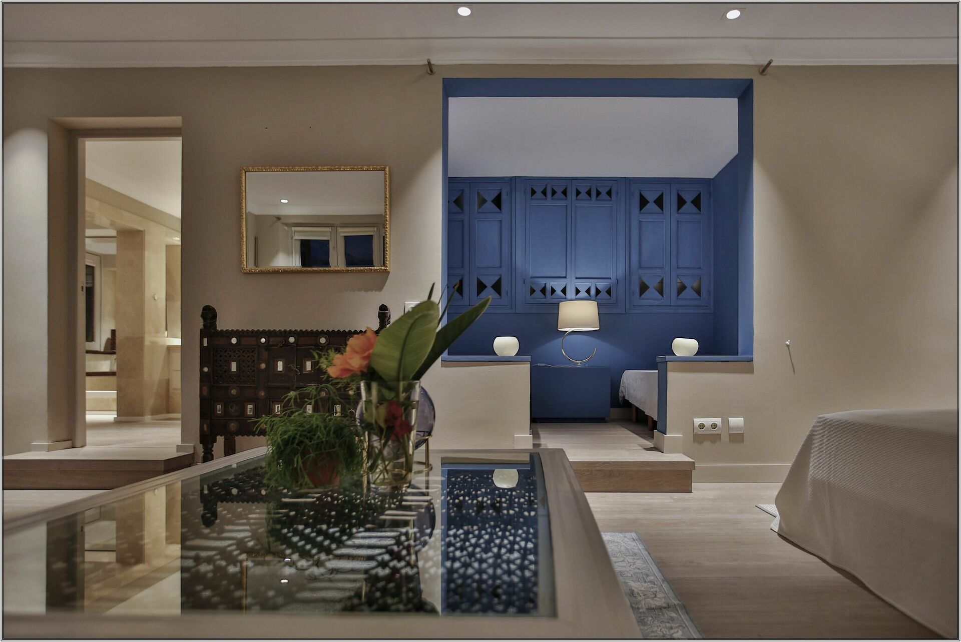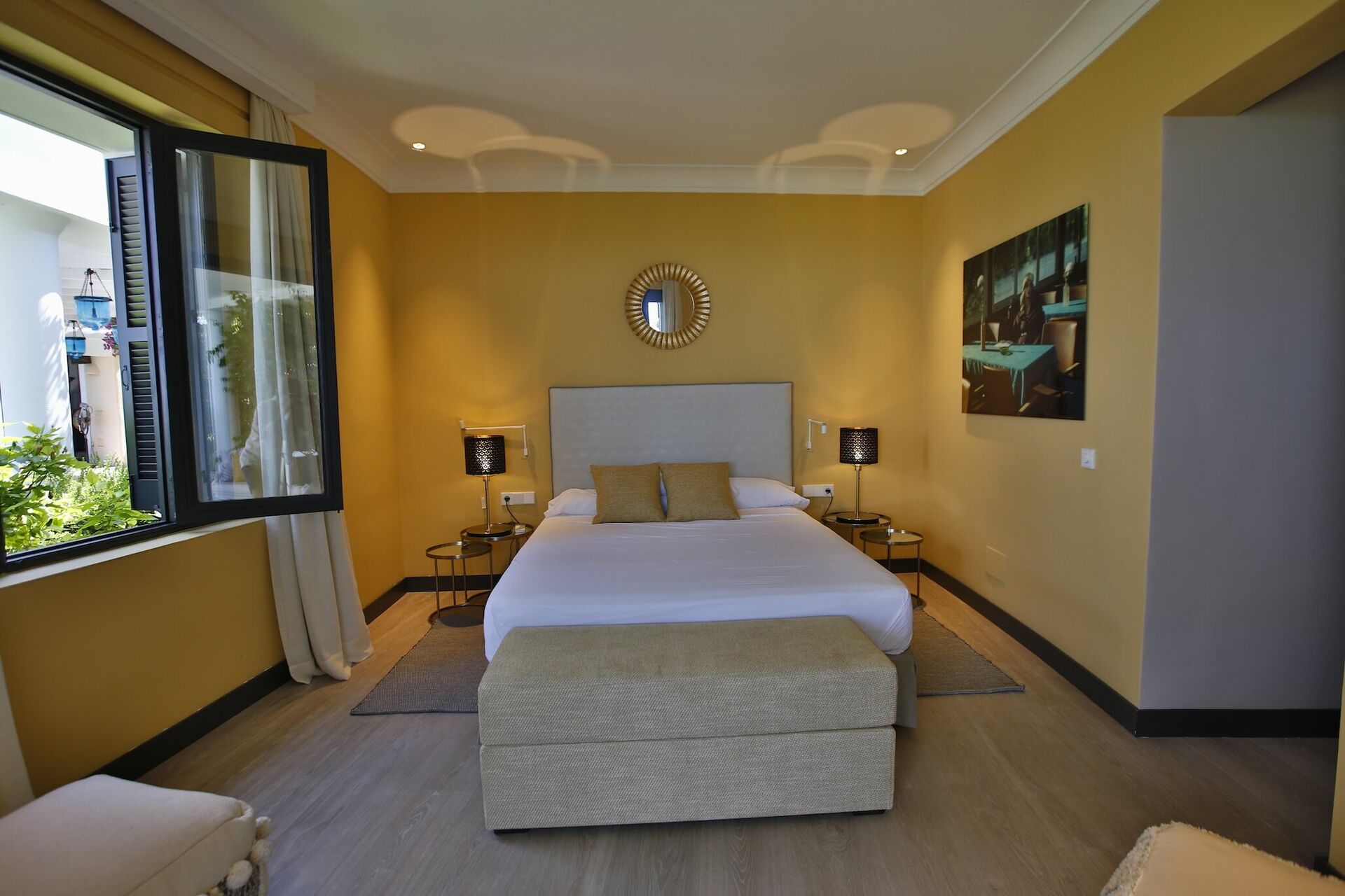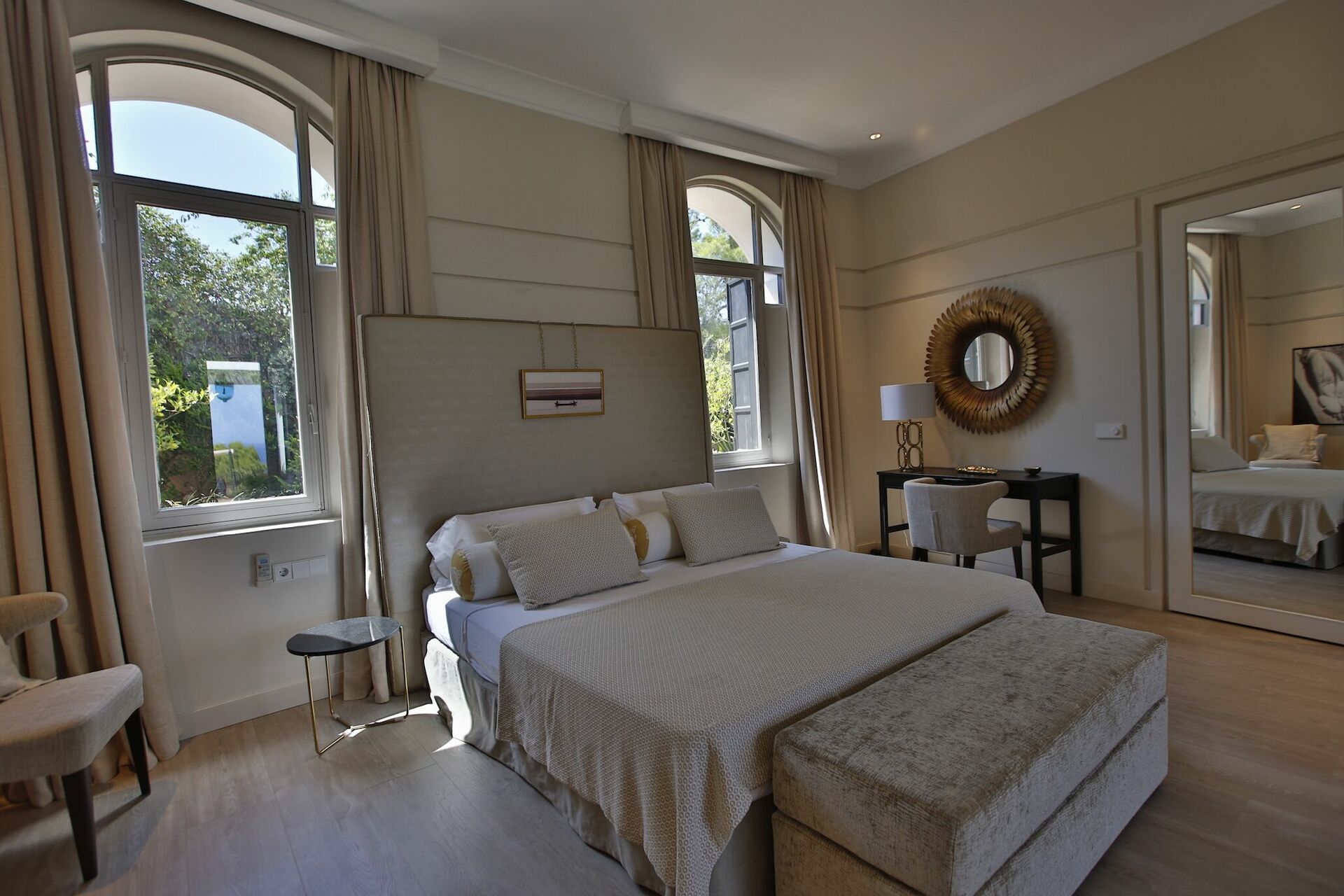 1 Master suite med king-size seng, opholdsstue, adgang til terrasse og stort privat badeværelse med badekar og bruser.