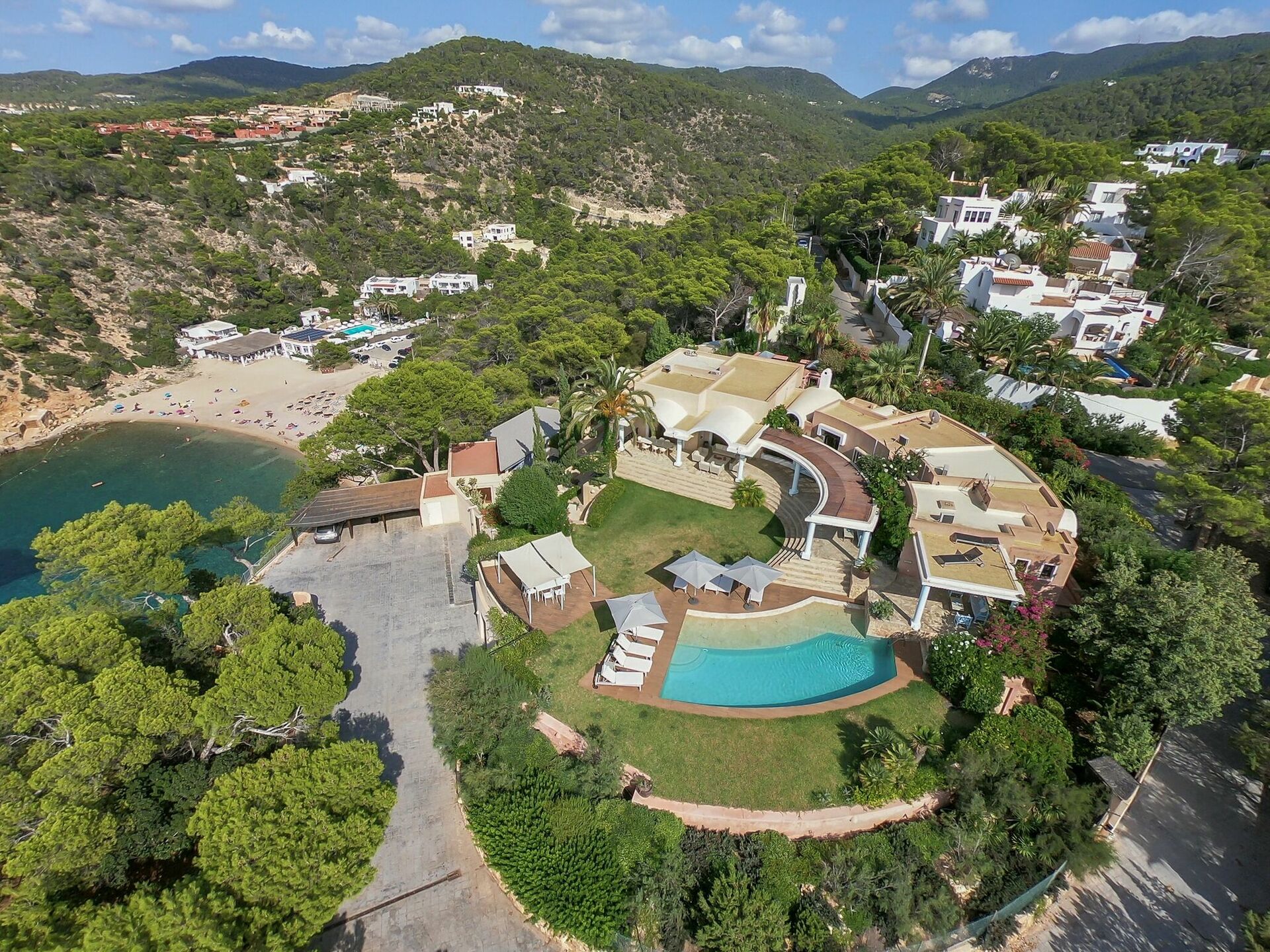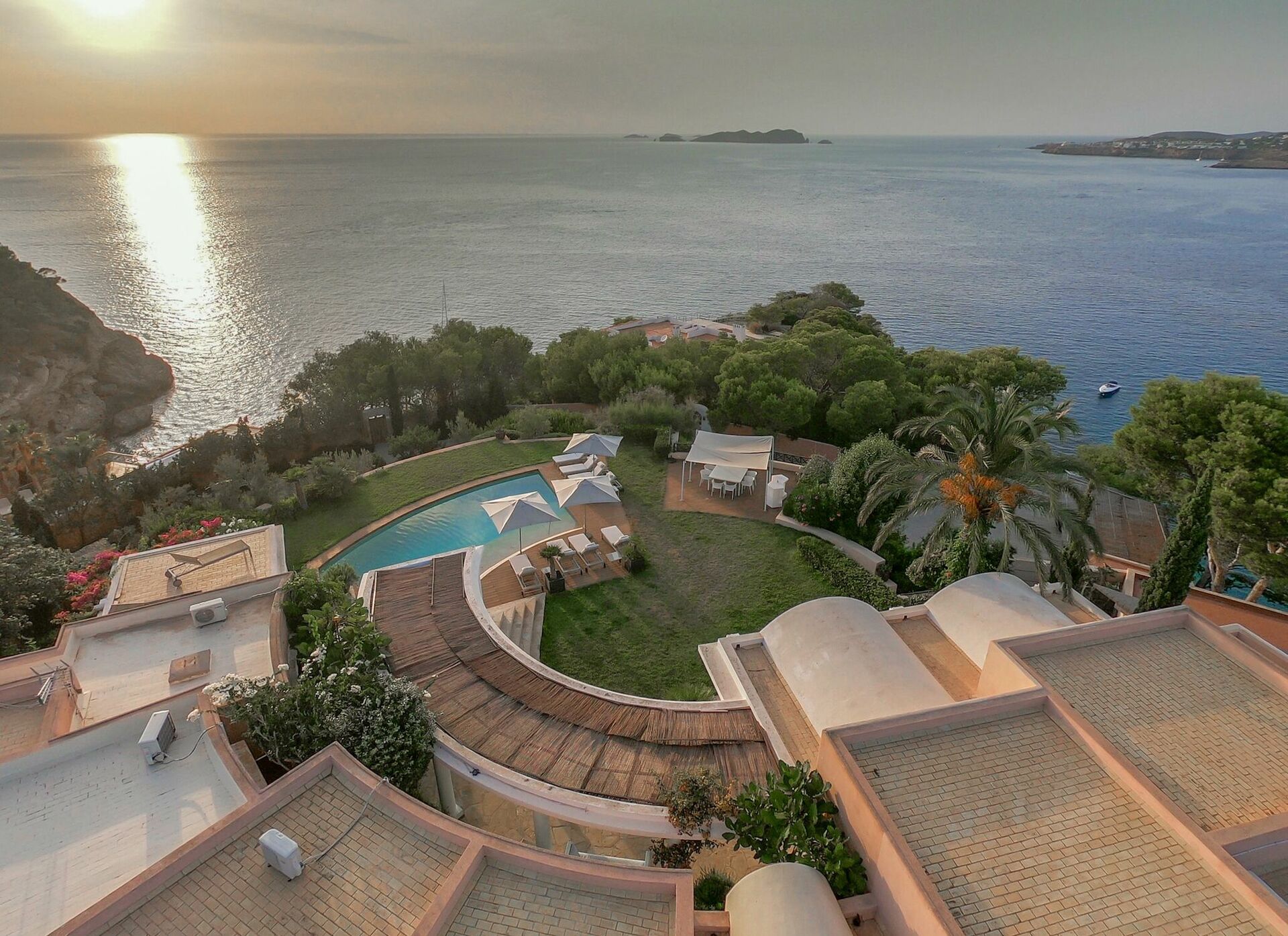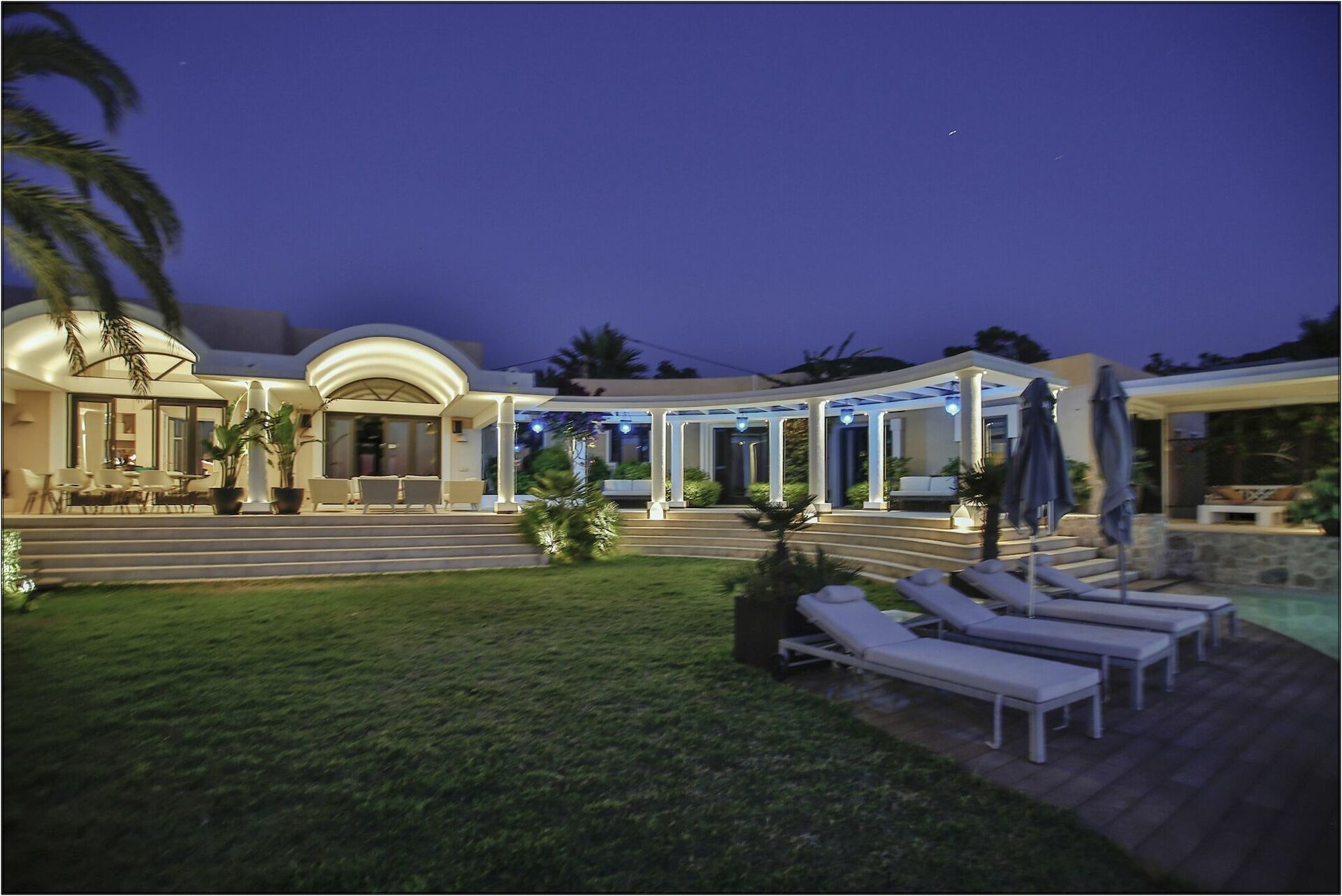 Dette unikke halvmåneformede sommerhus er spredt over to niveauer og har panoramaudsigt over havet og de omkringliggende bugter. Villaen kan rumme op til 12 personer og består af 6 soveværelser, flere fællesarealer og et elegant interiør.