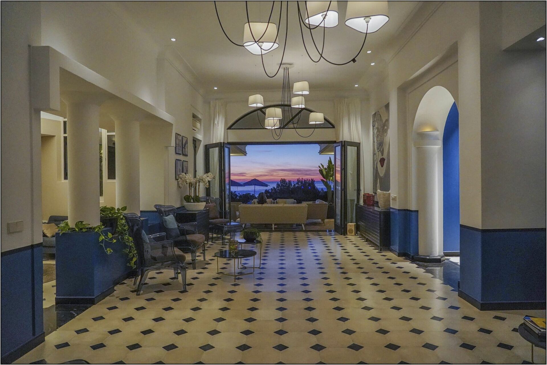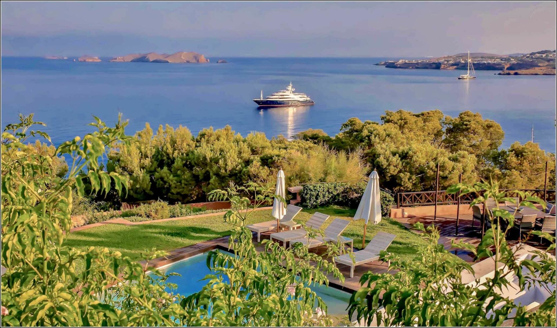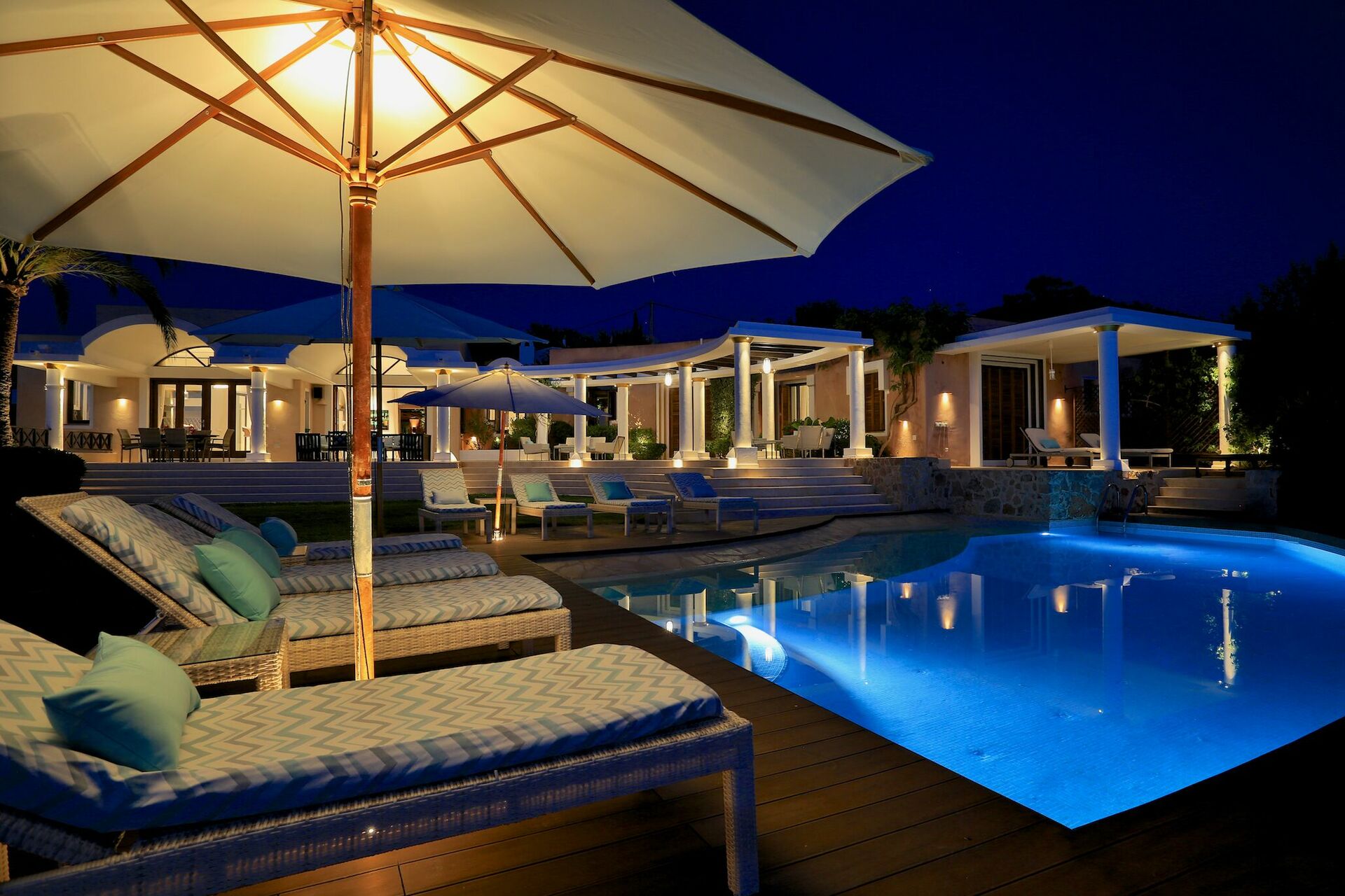 Dette unikke halvmåneformede sommerhus er spredt over to niveauer og har panoramaudsigt over havet og de omkringliggende bugter. Villaen kan rumme op til 12 personer og består af 6 soveværelser, flere fællesarealer og et elegant interiør.
