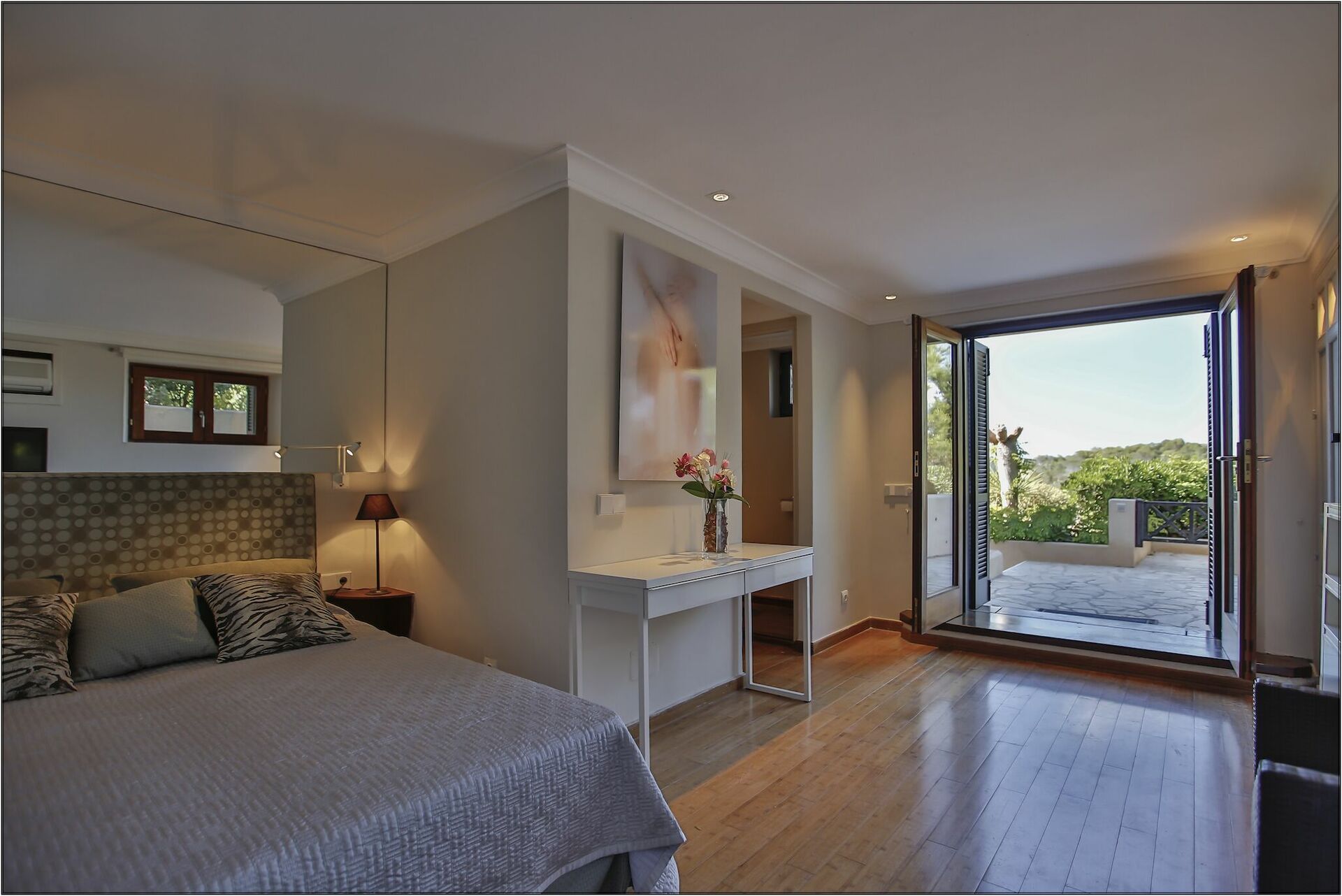 1 soveværelse med king-size seng, adgang til terrasse og eget badeværelse med bruser.