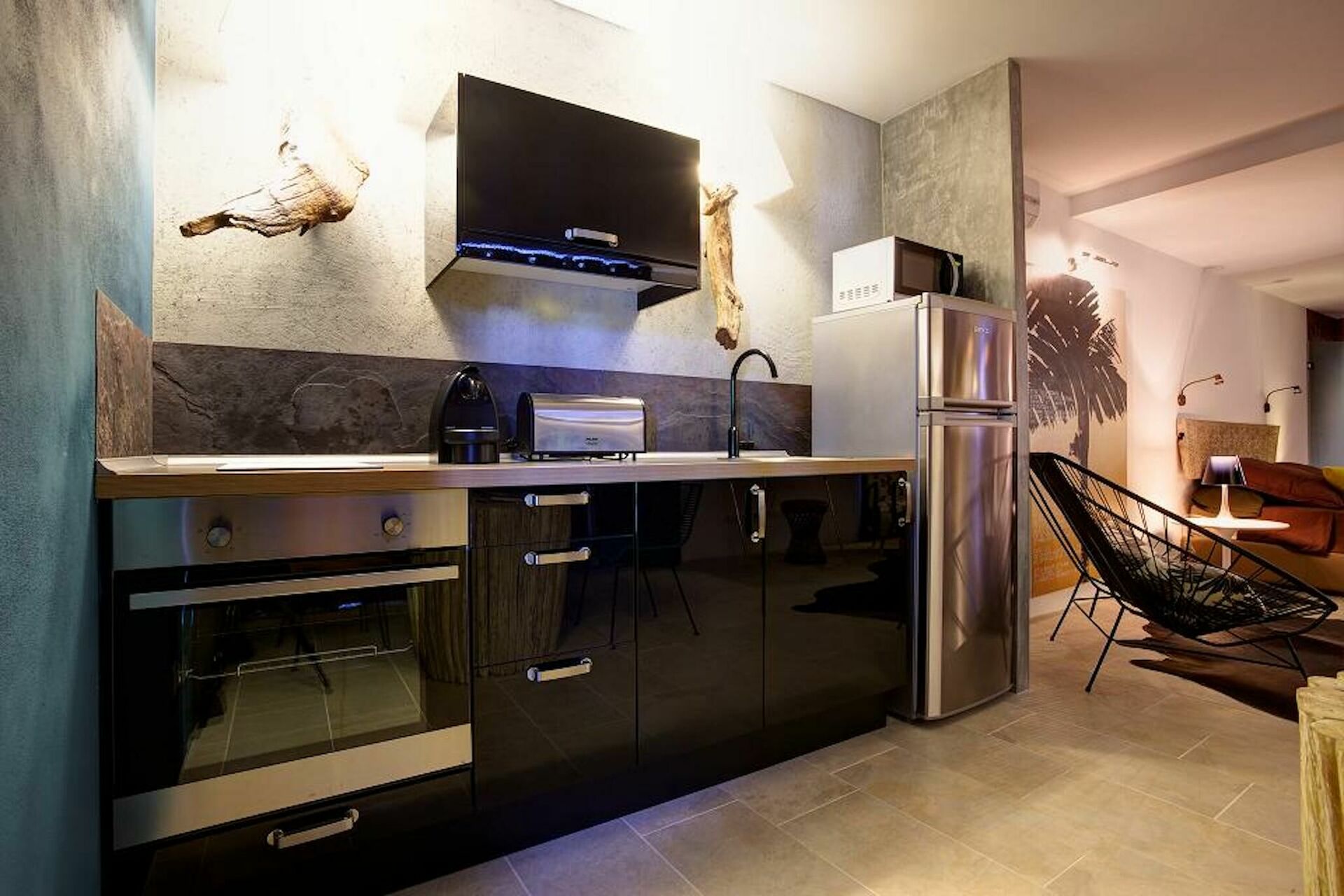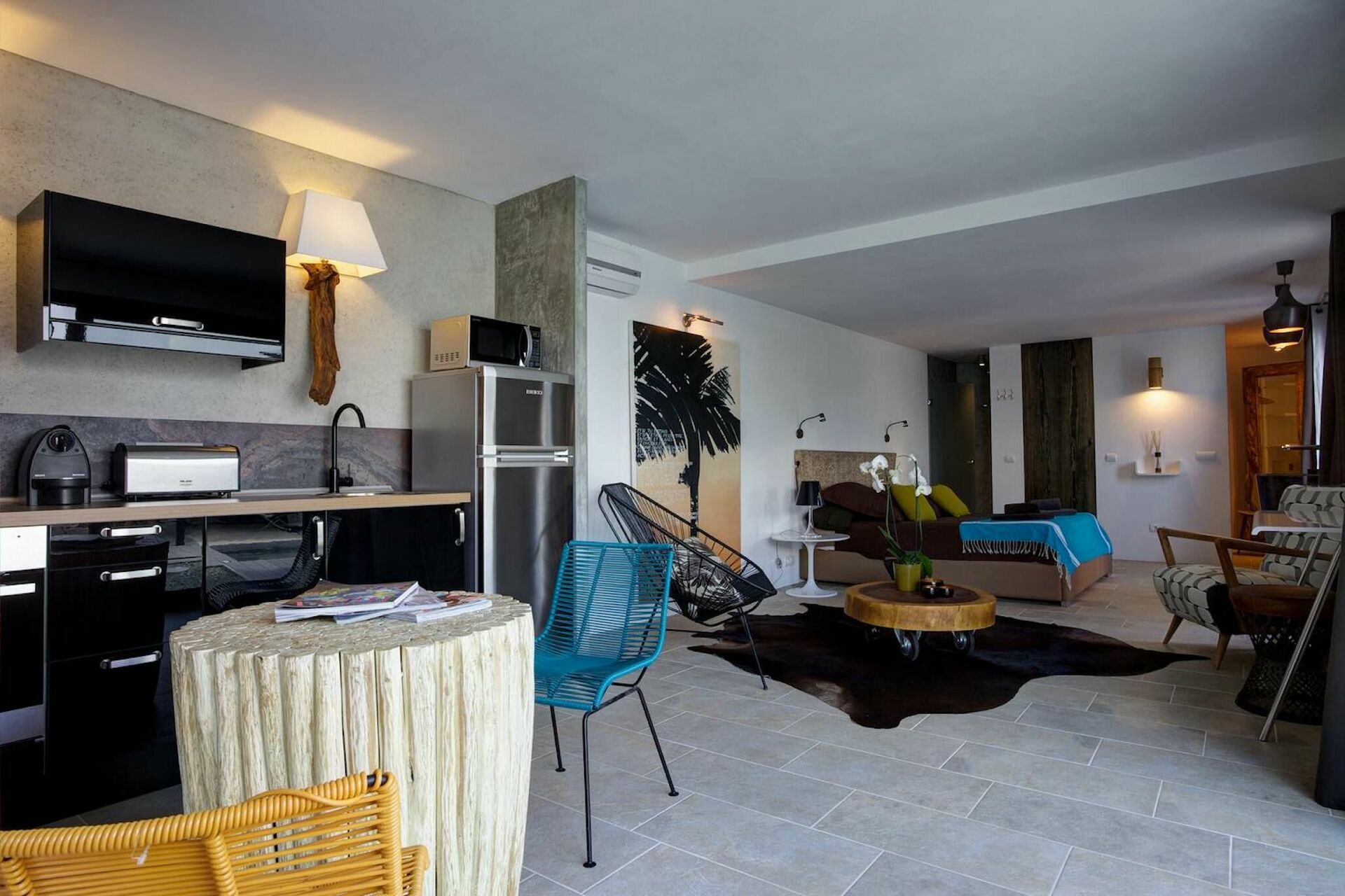 50 m2 studiolejlighed med køkken og spiseplads, king-size seng, privat badeværelse med badekar og bruser.